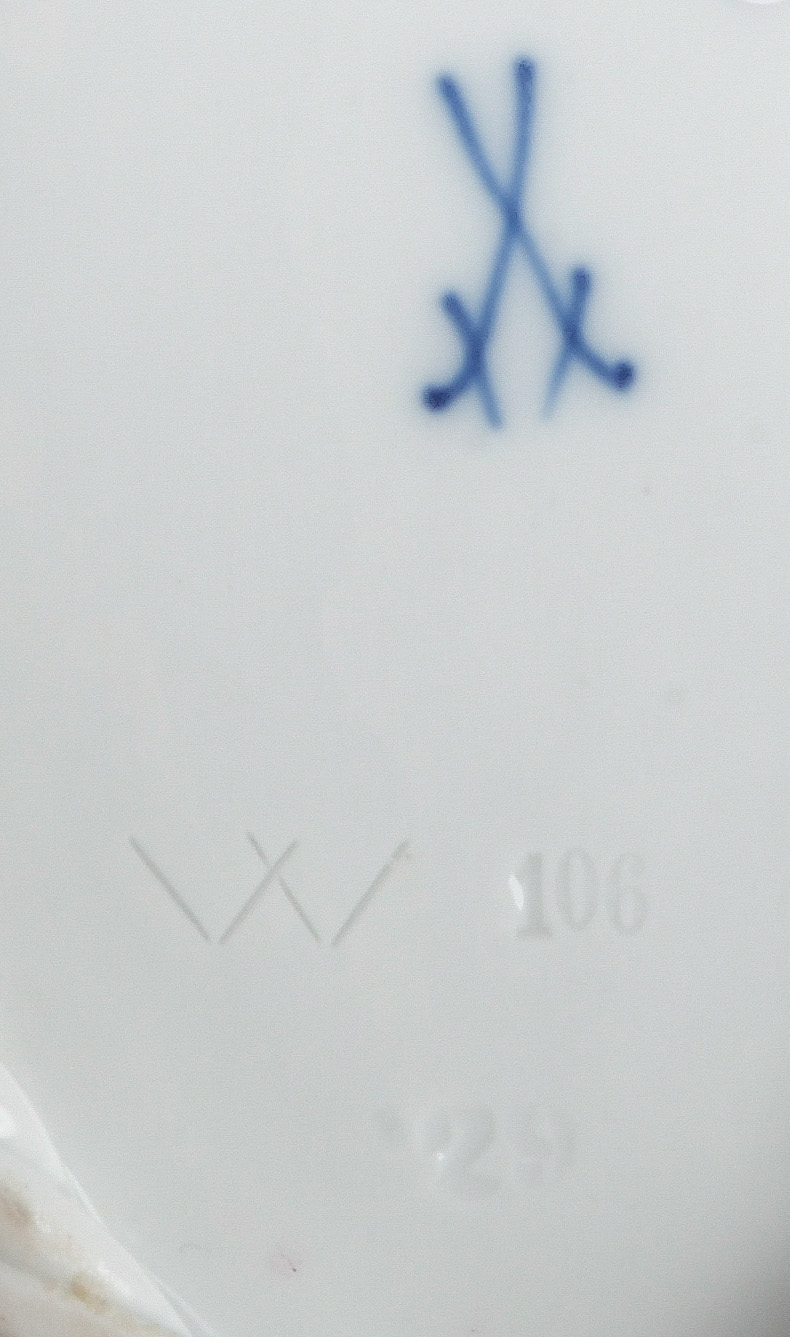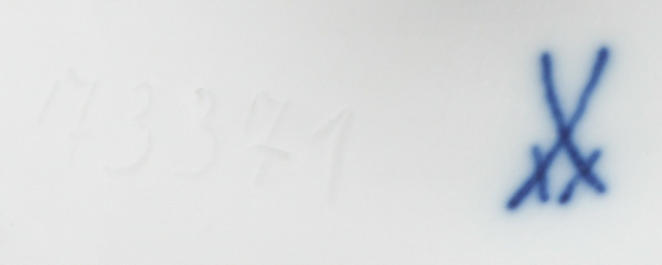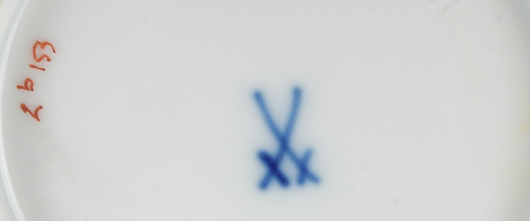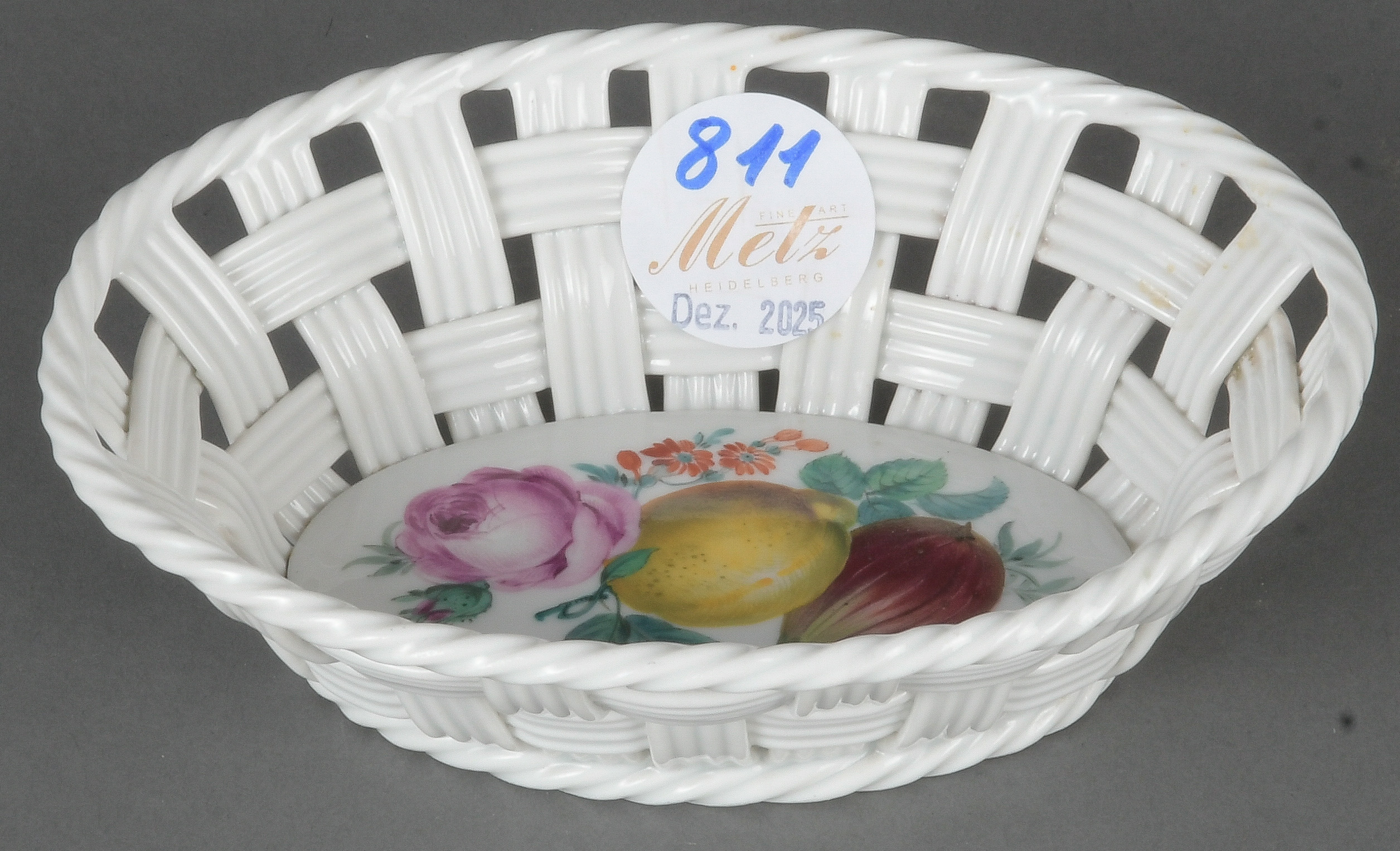 - Katalog-Nr: 811Ovaler Durchbruchskorb. Meissen 19. Jh. Porzellan, mit Korbflechtrelief, Goldrand und bunt gemaltem Blumen- und Obstbouquet; verso unterglasurblaue Schwertermarke, H=5,1 cm, B=15 cm, T=11,5 cm.o.L.