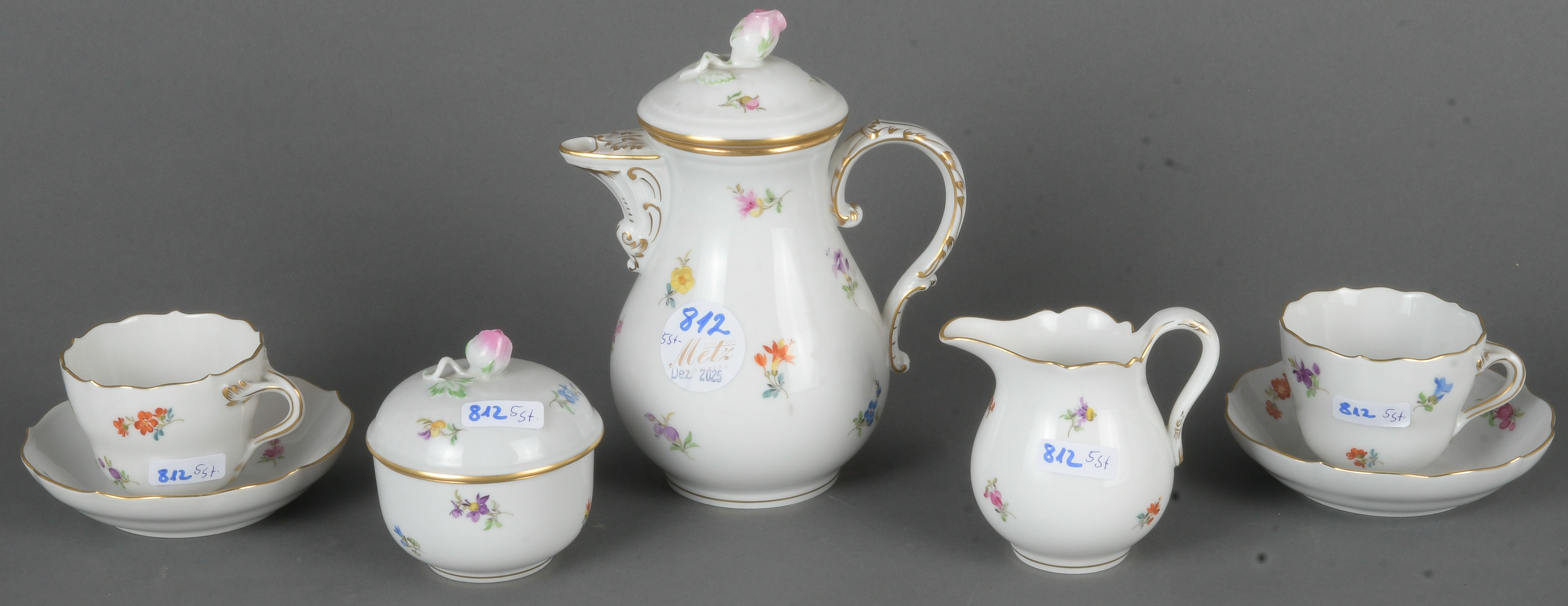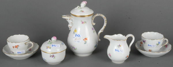 - Katalog-Nr: 812Fünftlgs. Déjeuner „Streublümchen“. Meissen 20. Jh. Porzellan, bunt bemalt, mit Goldrand; verso unterglasurblaue Schwertermarke. Bestehend aus: Eine Kanne (H=17 cm), ein Milchgießer (H=8,4 cm), eine Zuckerdose (H=7,6 cm) und ein Paar Tassen mit Unterschalen.o.L.