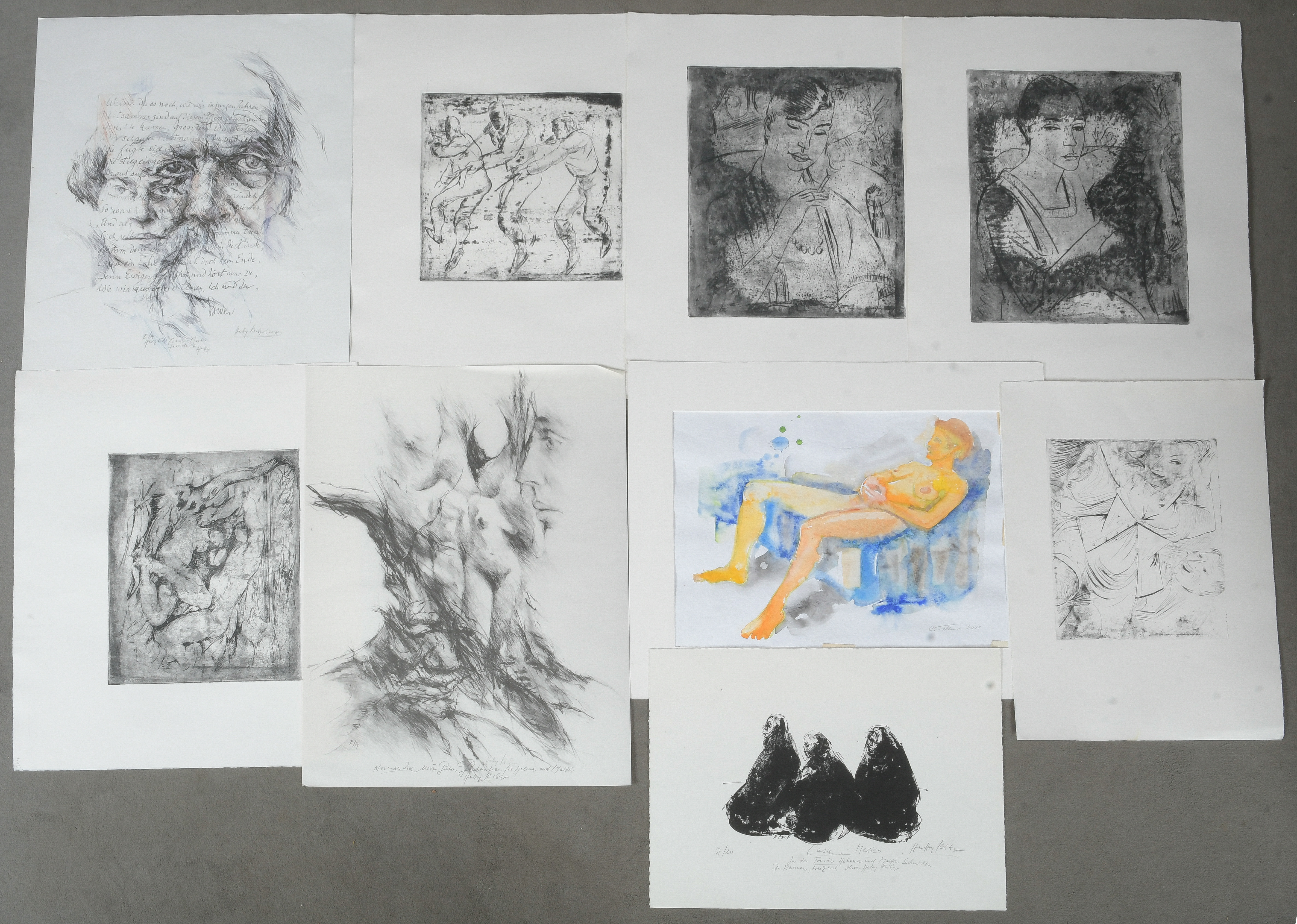 - Katalog-Nr: 825Konvolut Graphik, u.a. von Frank Ruddigkeit (1939-2025), Porträts und surrealistische Darstellungen, teilw. sign., 10 x 10 bis 46 x 60 cm.o.L.