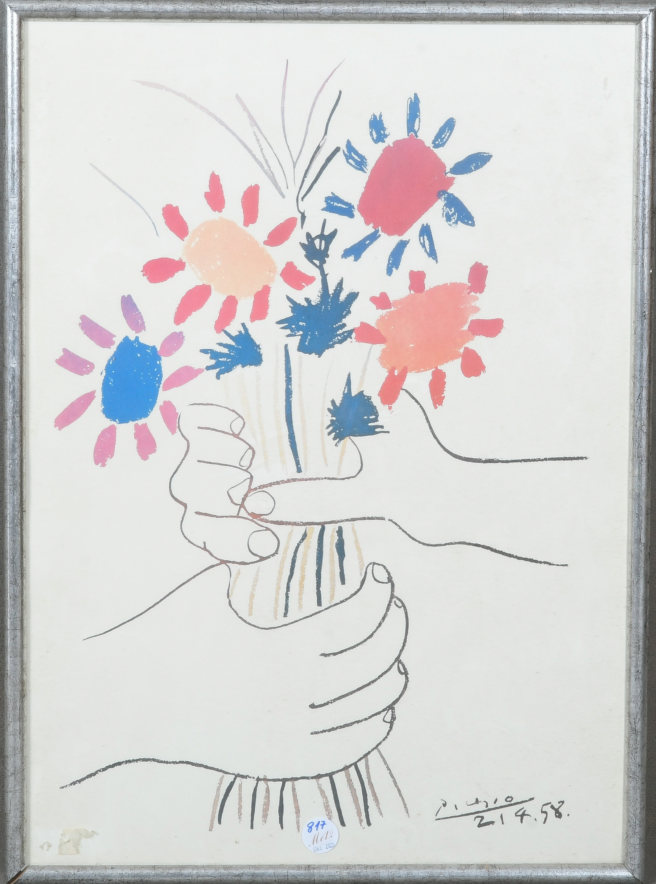 - Katalog-Nr: 817Pablo Picasso (1881-1973). Überreichung eines Blumenstraußes. Farblithografie / Reproduktion, re./u./sign./dat. (19)58, hi./Gl. gerahmt, 60 x 40 cm.o.L.