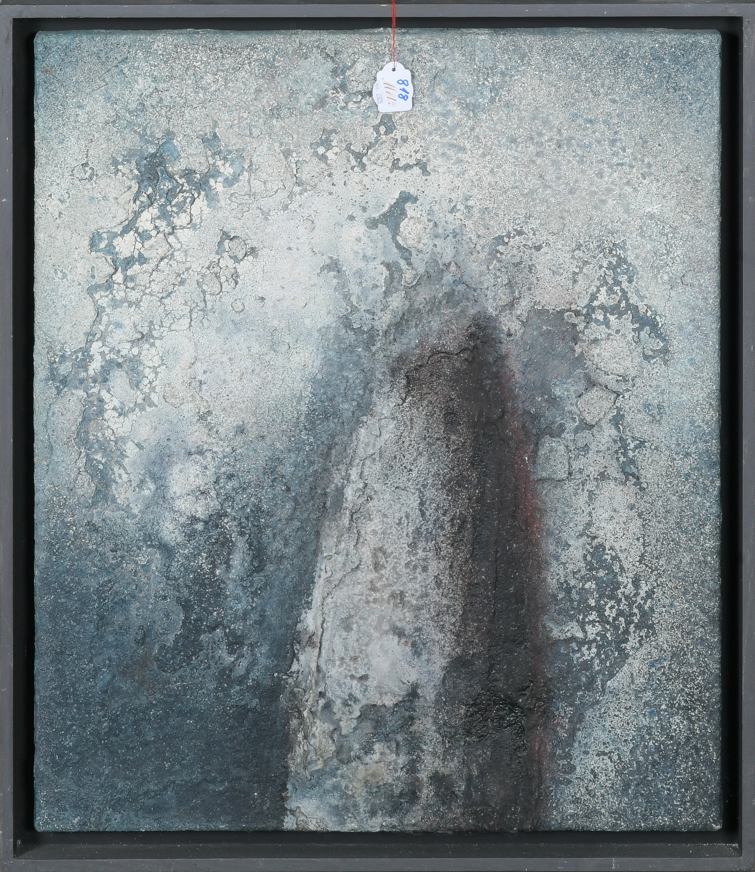 - Katalog-Nr: 818Maler des 20. Jhs. „Solitaire II“. Mixed Media, verso unleserlich sign./dat. 2003, gerahmt, 55 x 45,5 cm.o.L.
