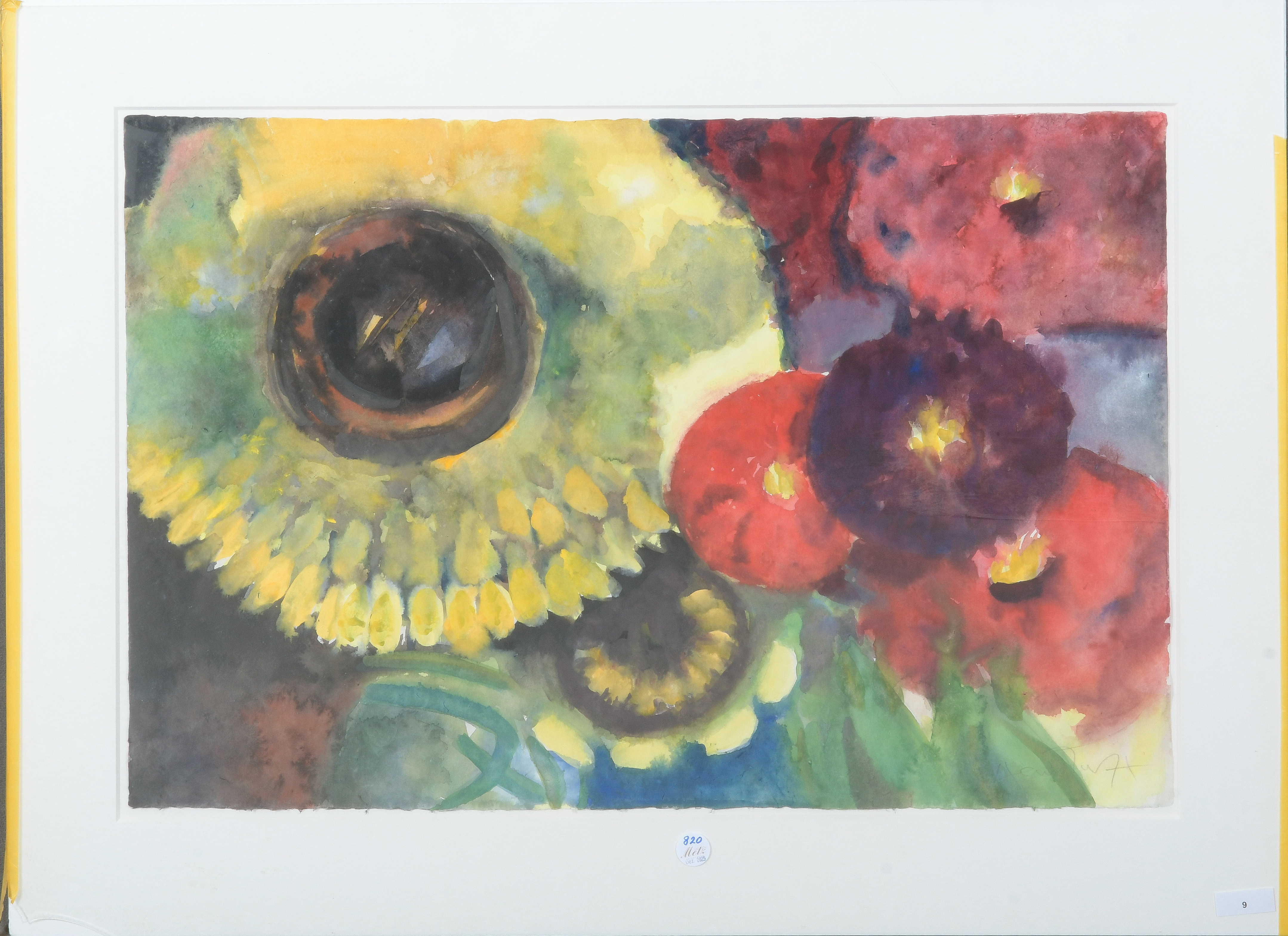 - Katalog-Nr: 820Maler des 20. Jhs. Blumenstillleben. Aquarell/Papier, re./u. unleserlich sign., mit Passepartout hi./Gl. gerahmt, 61 x 90,5 cm. (Glas besch.)o.L.
