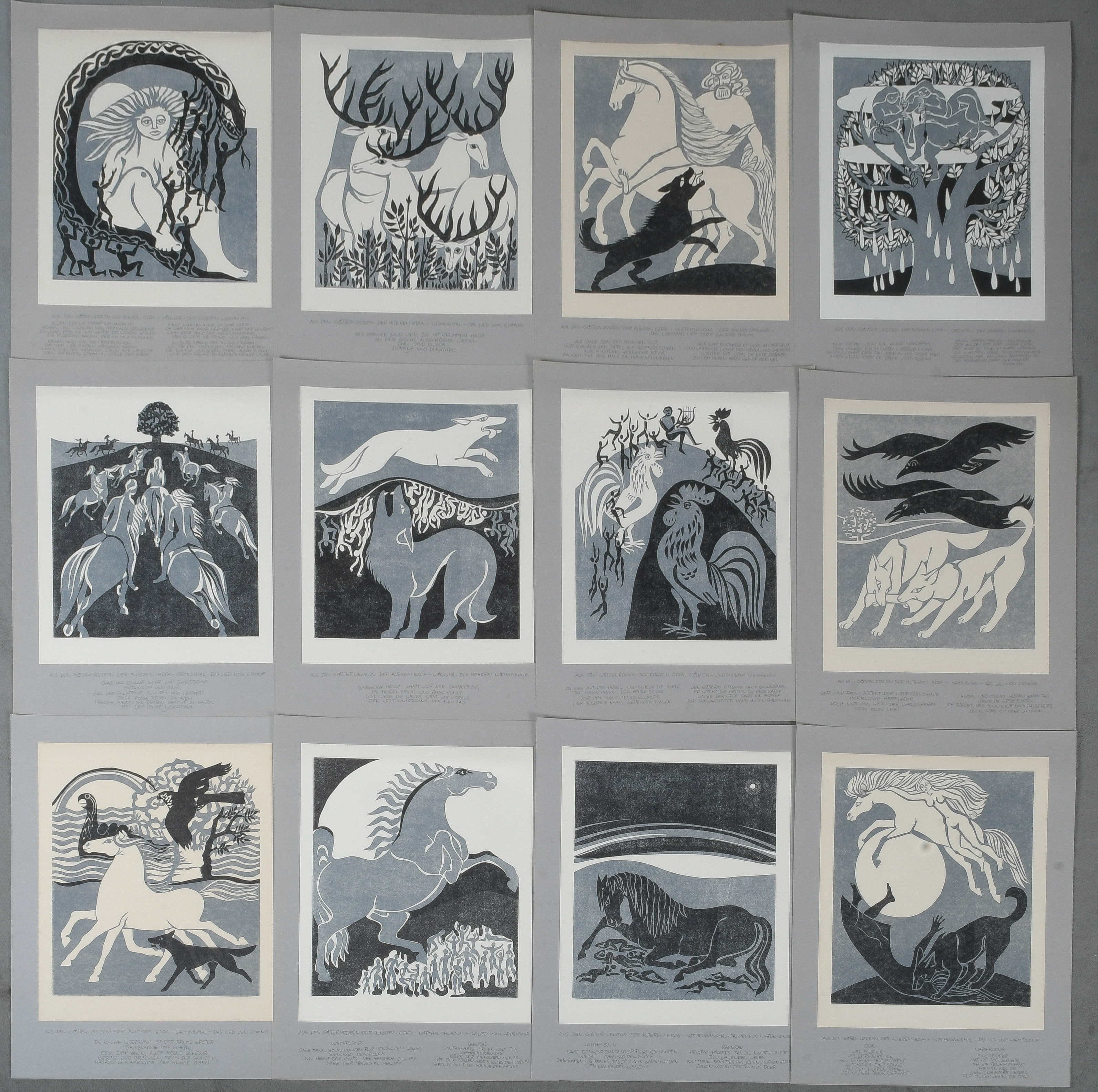 - Katalog-Nr: 823Angela Paysan (1936-1992). Zwölf Holzschnitte mit stilisierten Illustrationen zu den Götterliedern der Älteren Edda, je 38 x 30 cm.o.L.