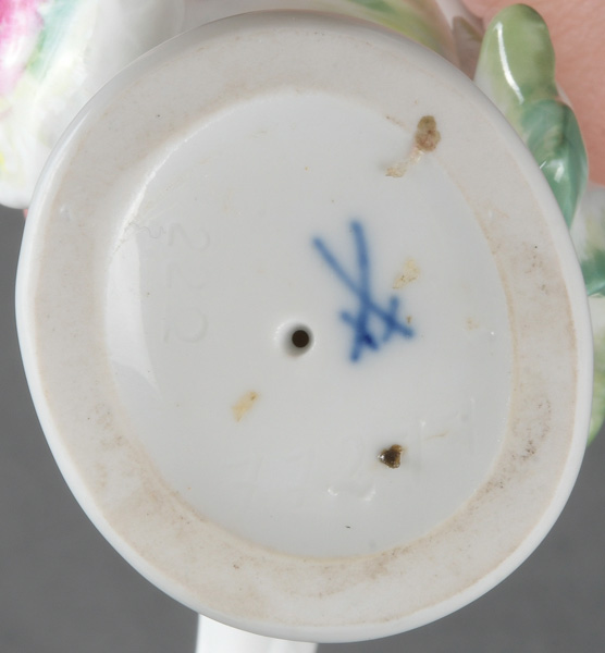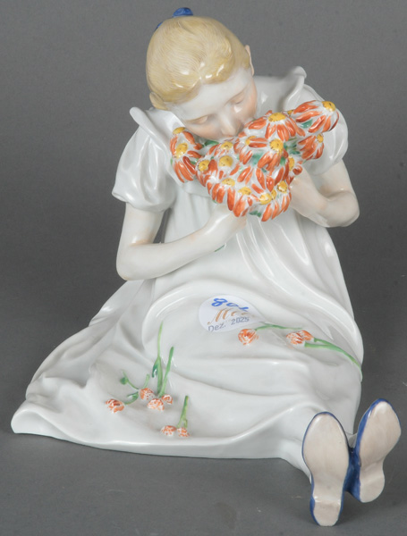 - Katalog-Nr: 806Blumenmädchen. Meissen 20. Jh. Porzellan, bunt bemalt; unterglasurblaue Schwertermarke, Modell nach Konrad Hentschel, H=17,5 cm.o.L.