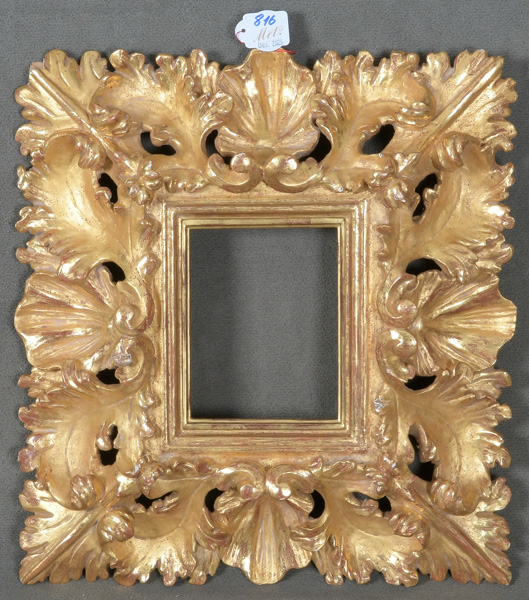 - Katalog-Nr: 816Bilderrahmen. Italien 20. Jh. Massivholz, geschnitzt, auf Kreidegrund blattvergoldet, monogr. „M.P.“, 16,5 x 13 cm (lichtes Maß).o.L.
