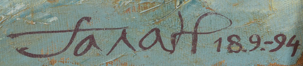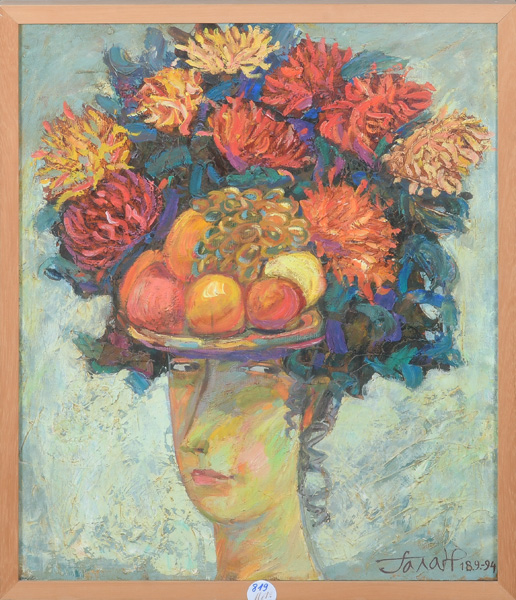 - Katalog-Nr: 819Maler des 20. Jhs. Frauenkopf mit üppig blumen- und obstgeschmücktem Hut. Öl/Lw., re./u. unleserlich sign./dat. 1994, gerahmt, 59,5 x 49 cm.o.L.