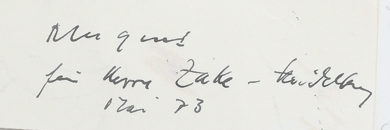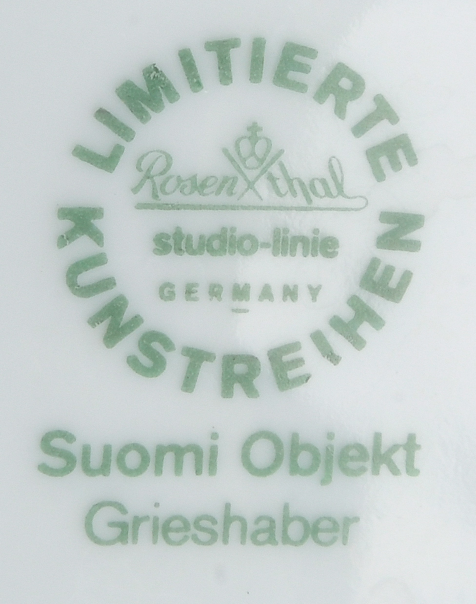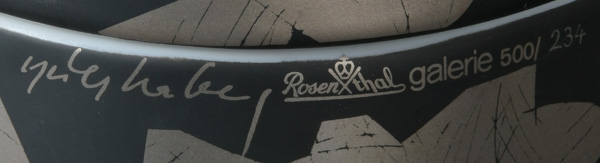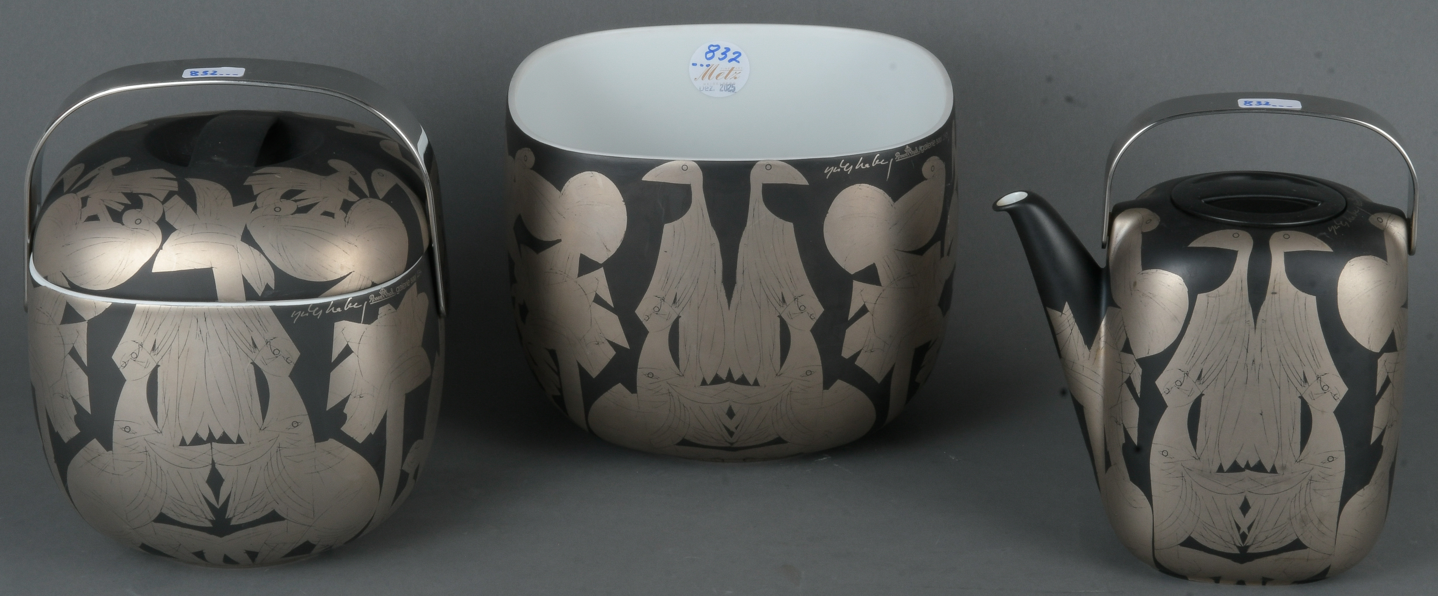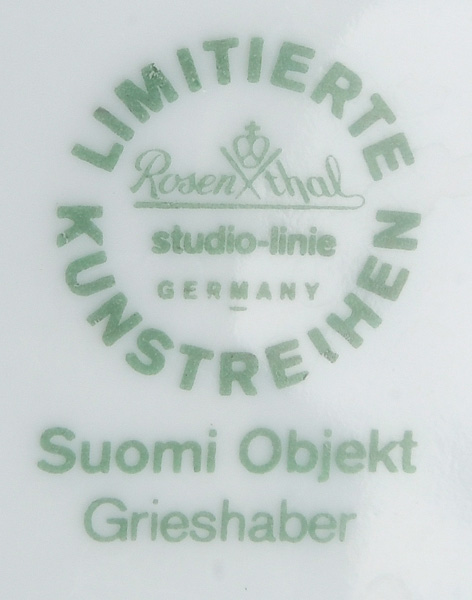 - Katalog-Nr: 832Dreitlgs. Service „Suomi“. Rosenthal 1976. Porzellan, mit mattschwarzem Fond und teilweise radiertem Platindekor; limitierte Aufl. 242/500, 324/500, 334/500, Formentwurf Timo Sarpaneva, Dekorentwurf und sign. HAP Grieshaber. Bestehend aus: Eine Kanne mit beweglichem Metallbügel (H=21 cm), ein Deckelgefäß mit beweglichem Bügel (H=21,4 cm) und eine Schale (H=16,5 cm).o.L.