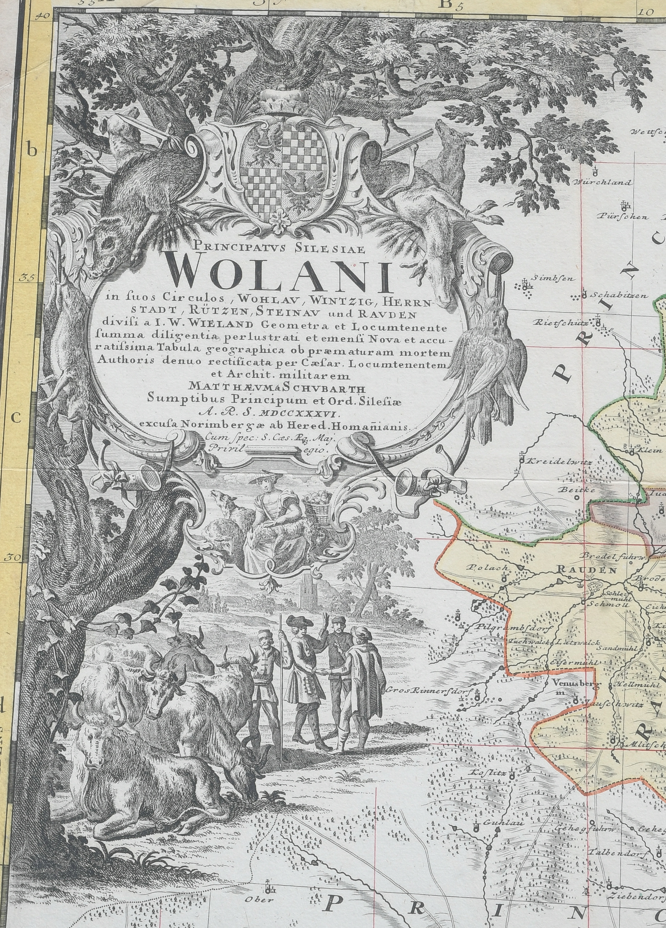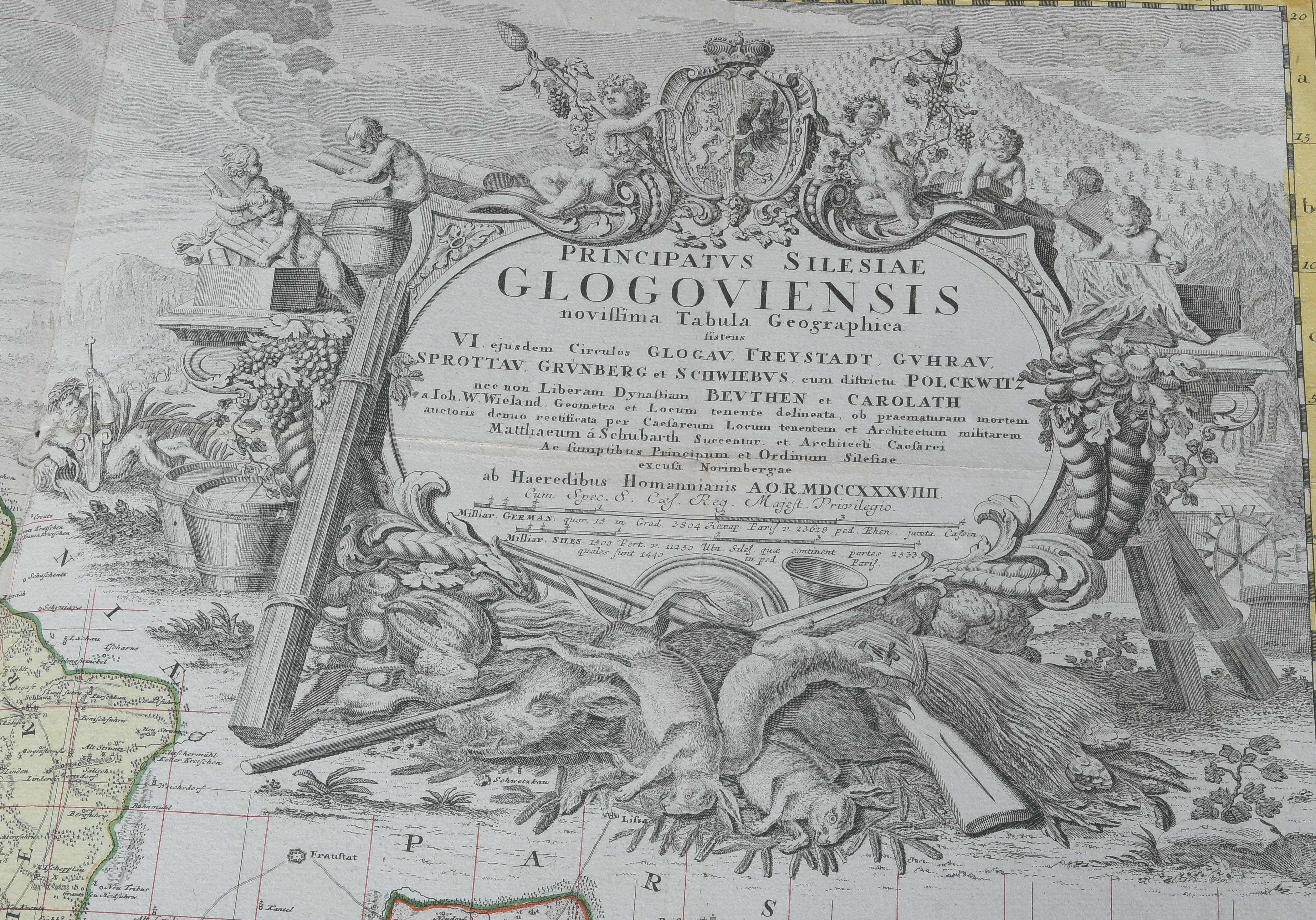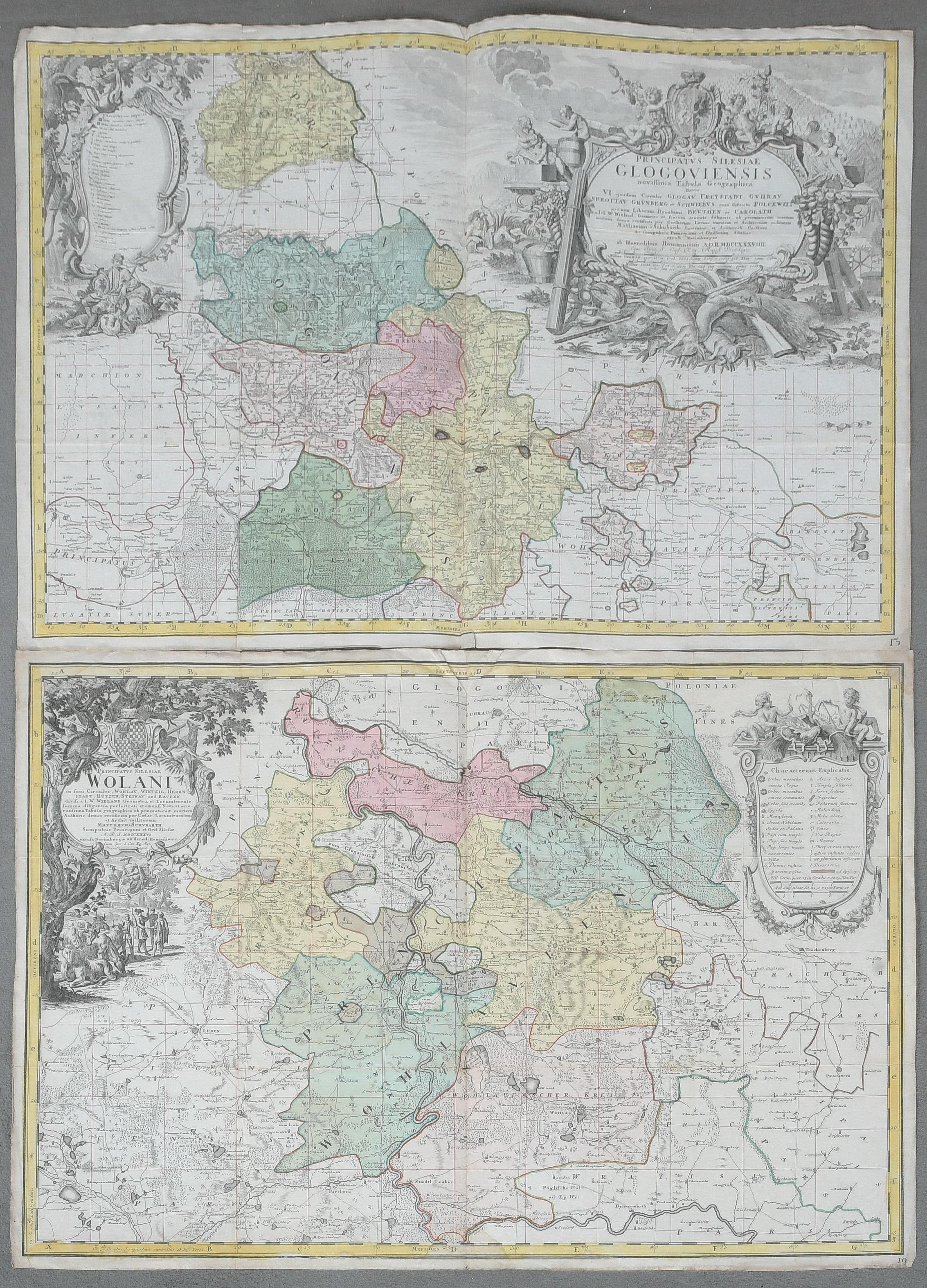 - Katalog-Nr: 828Homannsche Erben (1724-1852). Zwei Karten von Polen-Schlesien bzw. Schlesien. Colorierte Kupferstiche, eine mit Wappenkartusche, im Wappen sign./dat. 1736 / 1739, je 55 x 80 cm.o.L.