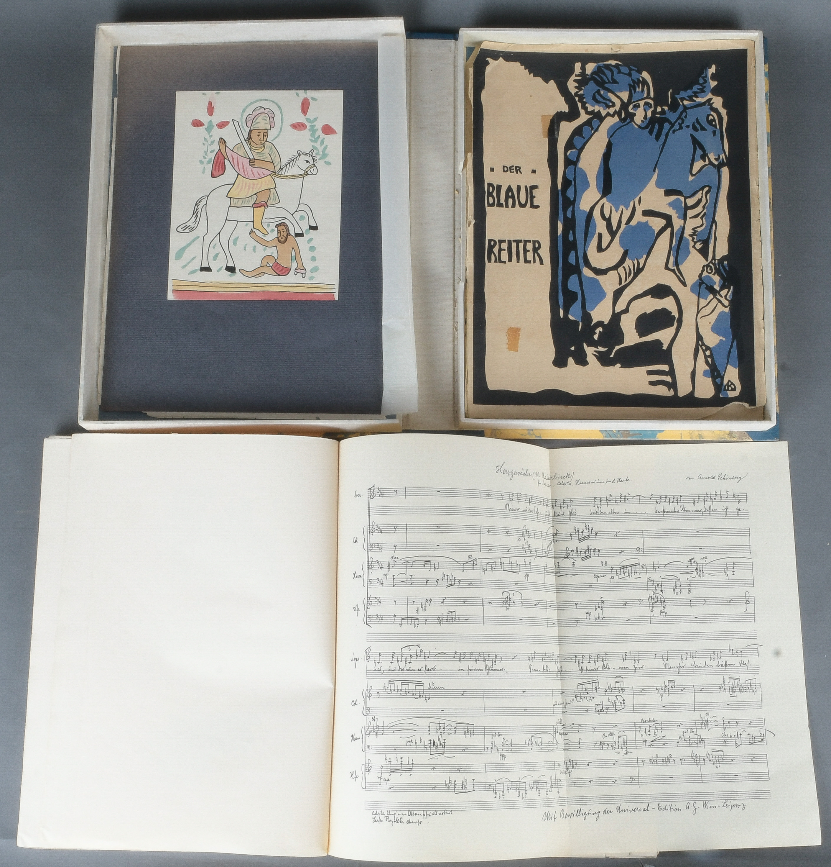 - Katalog-Nr: 830Wassily Kandinsky / Franz Marc (Hrsg.), „Der blaue Reiter“, 2. Aufl., R. Piper & Co Verlag, München 1914, in Halbldr.-Schuber. (zwei Blatt lose)o.L.