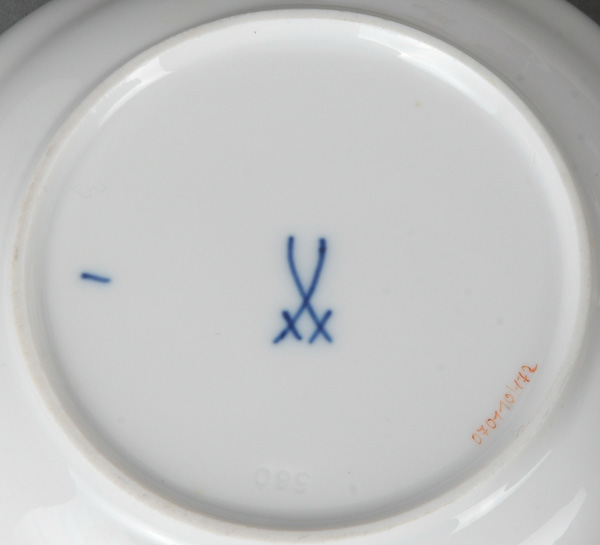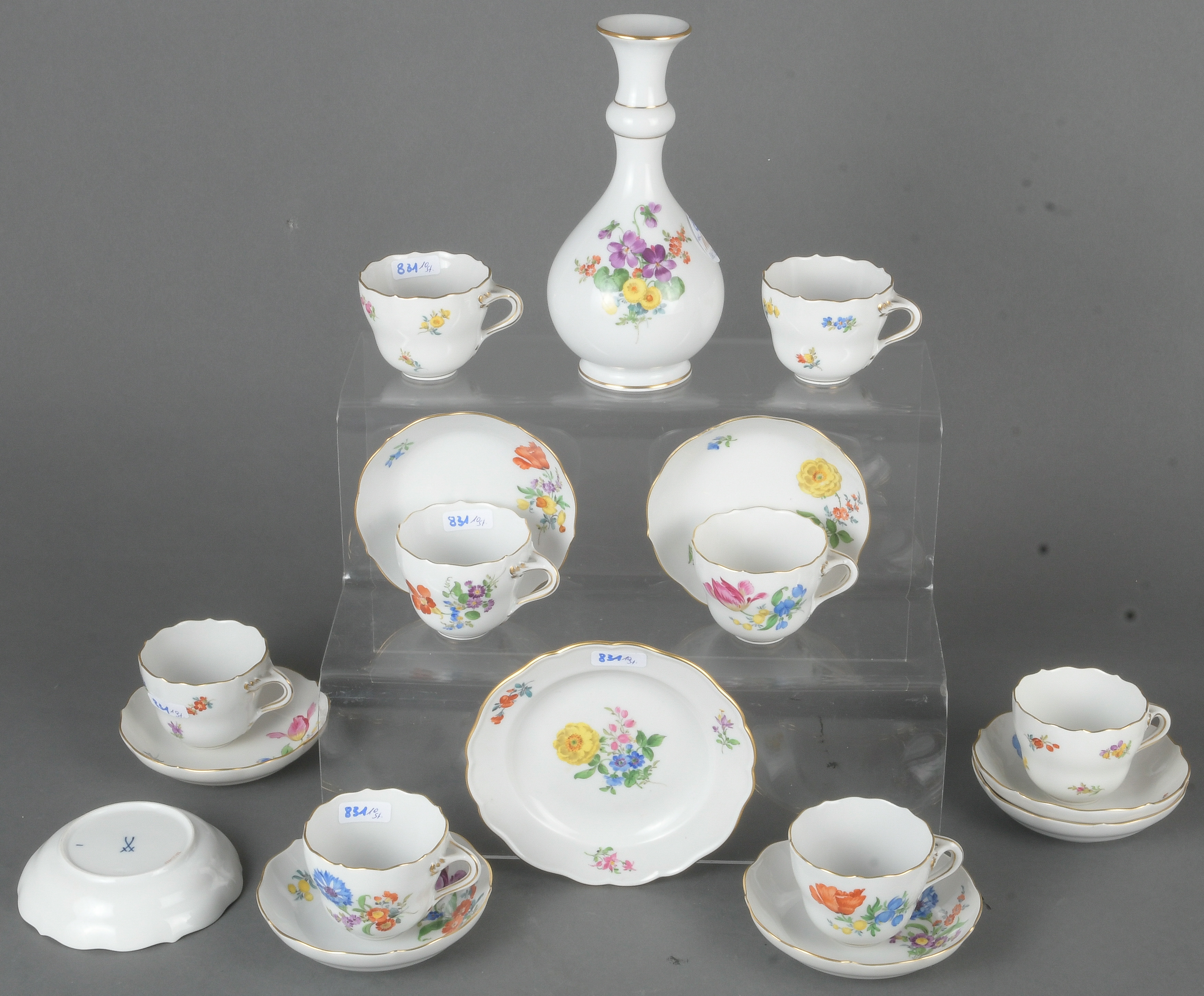 - Katalog-Nr: 831Zehntlgs. Service. Meissen 20. Jh. Porzellan, bunt bemalt mit Floraldekor, Goldrand; verso unterglasurblaue Schwertermarke. Bestehend aus: Acht Mokkatassen mit Unterschalen, ein Teller (D=13,5 cm) und eine Vase (H=17,5 cm).o.L.
