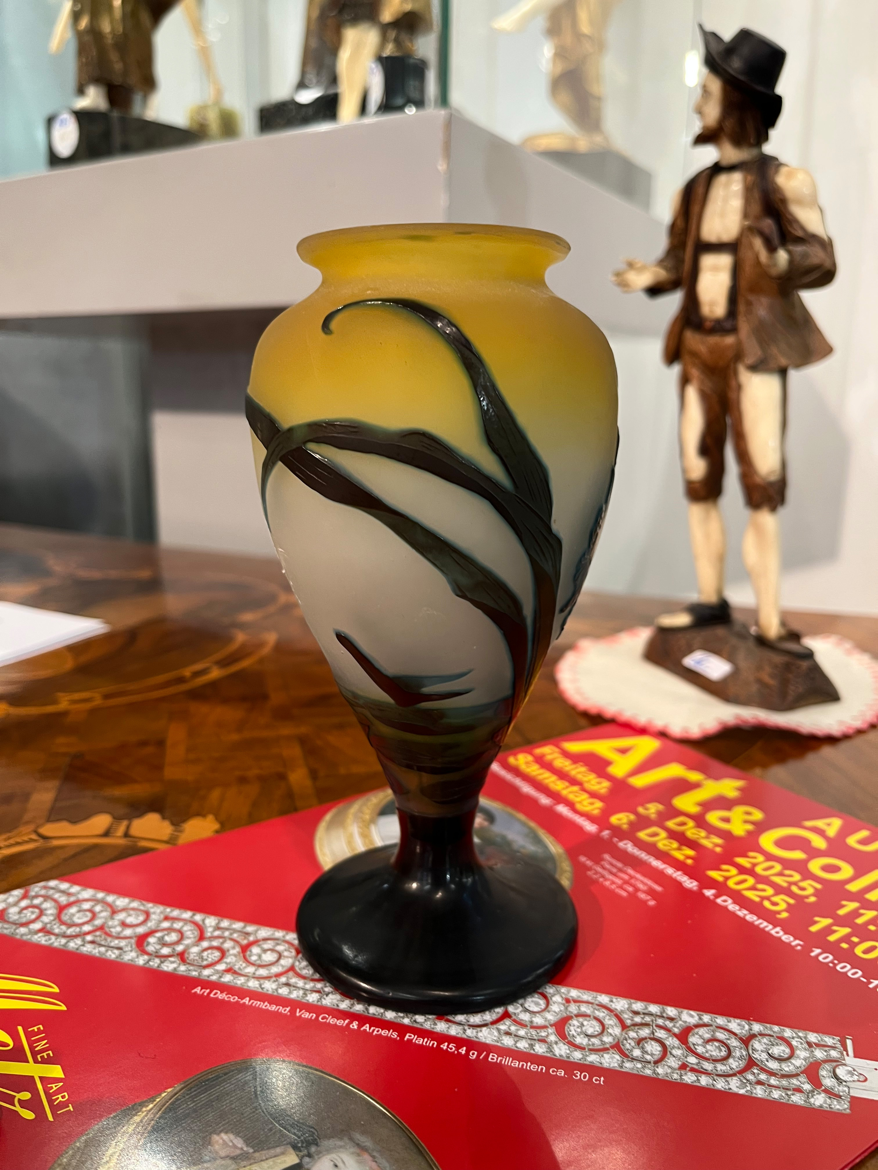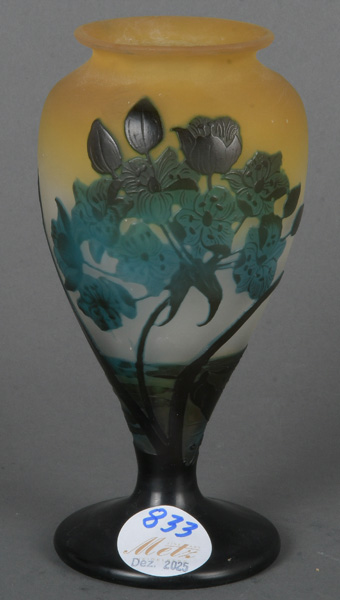 - Katalog-Nr: 833Jugendstil-Vase. Nancy, Émile Gallé um 1900. Farbloses Glas, farbig überfangen, floral geschnitten, geätzt und poliert; an der Wandung sign., H=18 cm.o.L.
