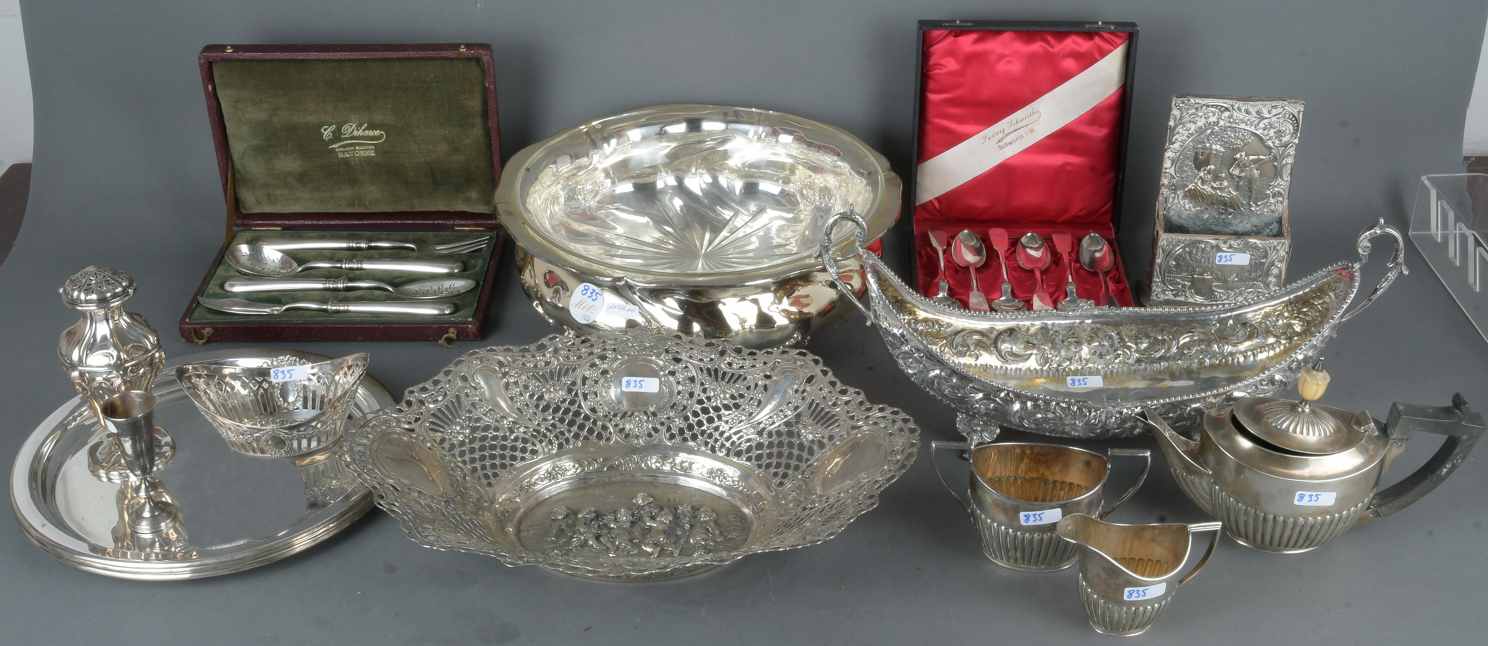 - Katalog-Nr: 835Konvolut meist 800er Silber, ca. 5.009 g. u.a.: Becher, Löffel, Tabatièren, Teeservice, ovale Schalen und Vorlegebesteck.o.L.