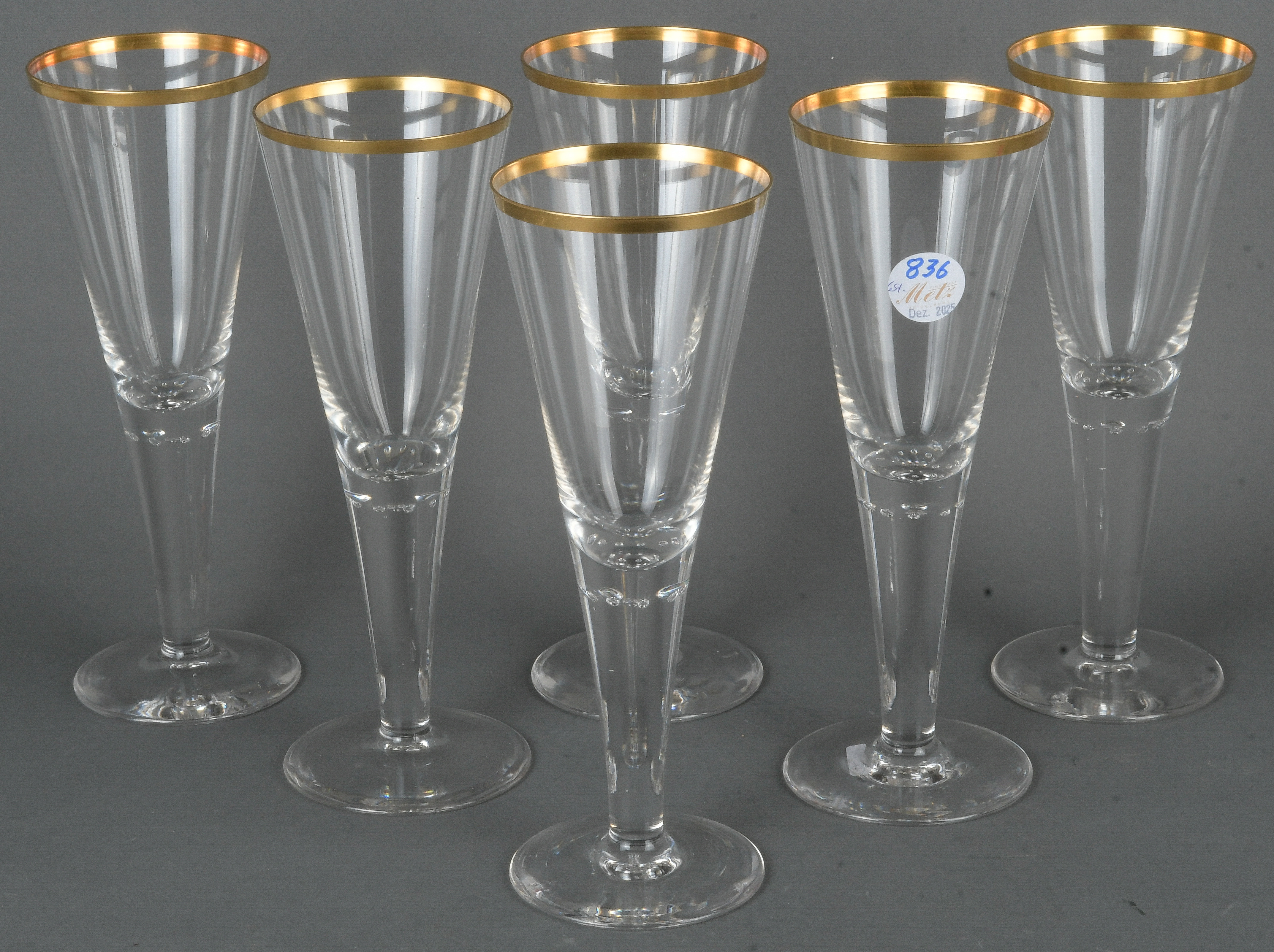 - Katalog-Nr: 836Sechs hohe Kelchgläser. Böhmen 20. Jh. Farbloses Glas mit Goldrand, H=28,5 cm.o.L.