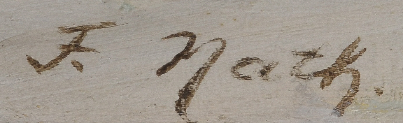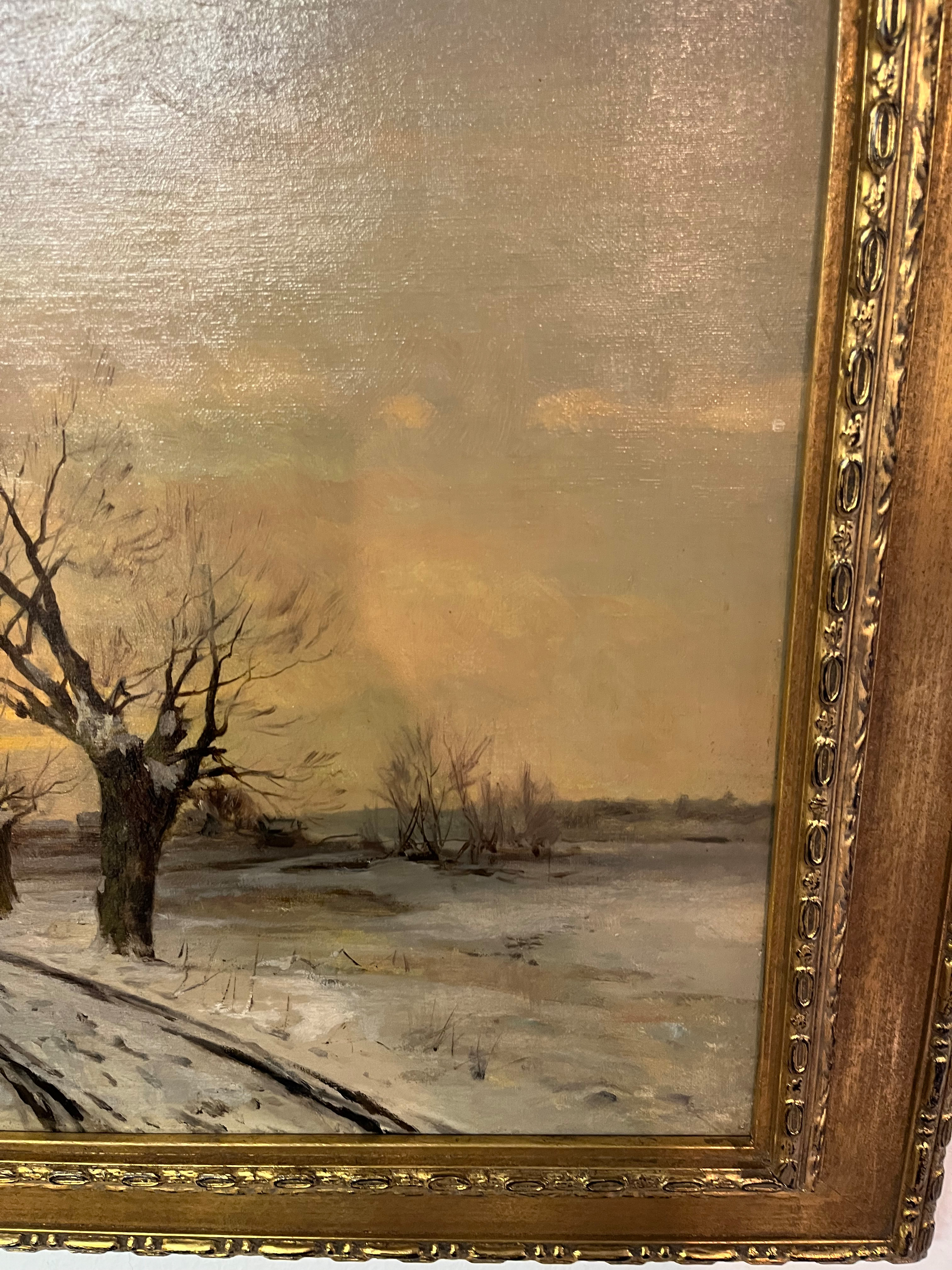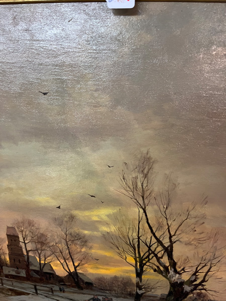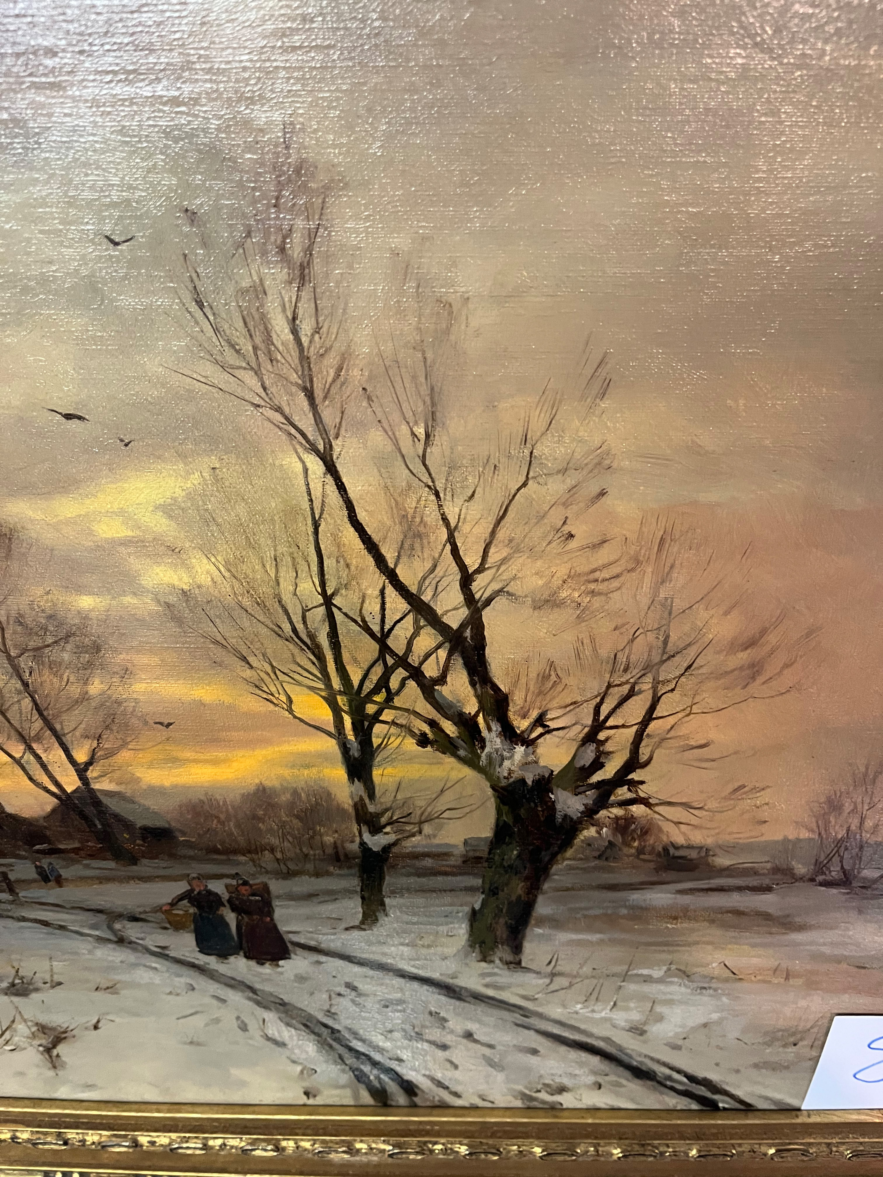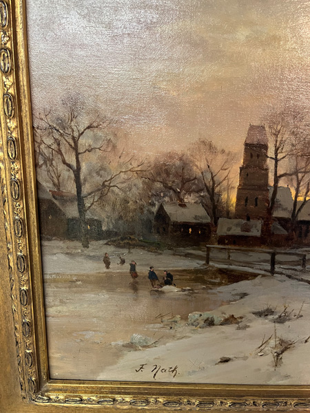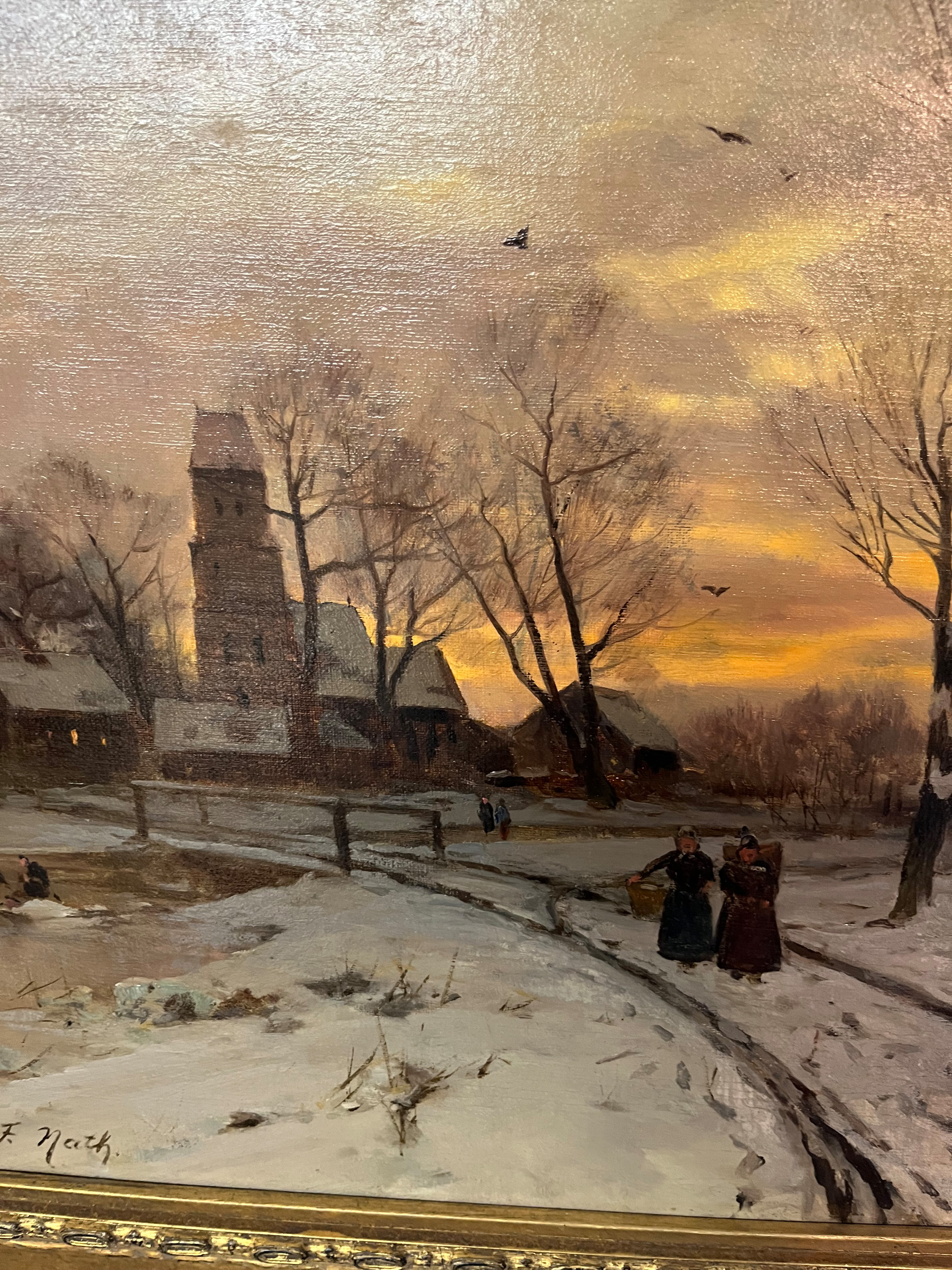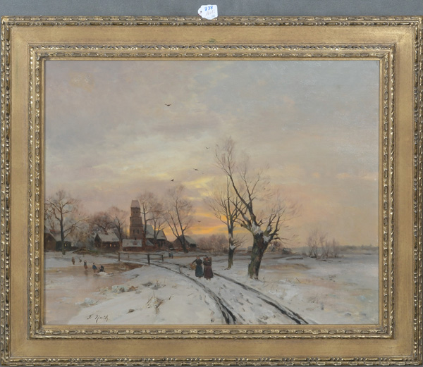 - Katalog-Nr: 838Friedrich Nath (1859-1925). Winterlandschaft mit Personenstaffage und Dorf. Öl/Lw., li./u./sign., gerahmt, 55 x 68 cm.o.L.