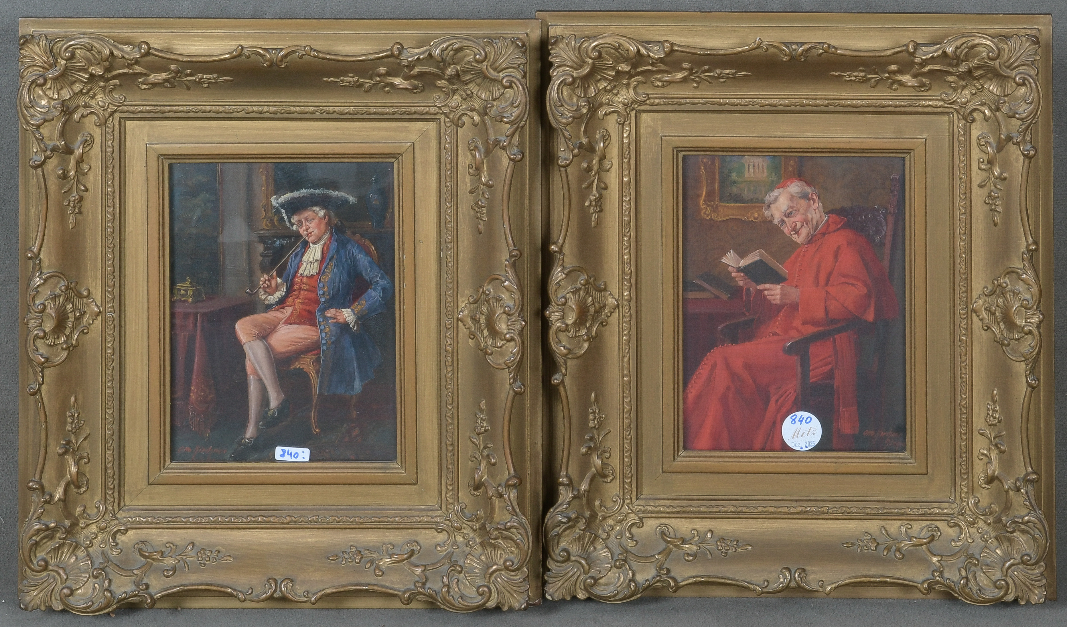 - Katalog-Nr: 840Otto Kirchner (1887-1960). Lesender Mönch und Herr in Tracht mit Pfeife. Öl/Holz, re. bzw. li./u./sign./bez. „München“, hi./Gl. gerahmt, je 24 x 18 cm.o.L.