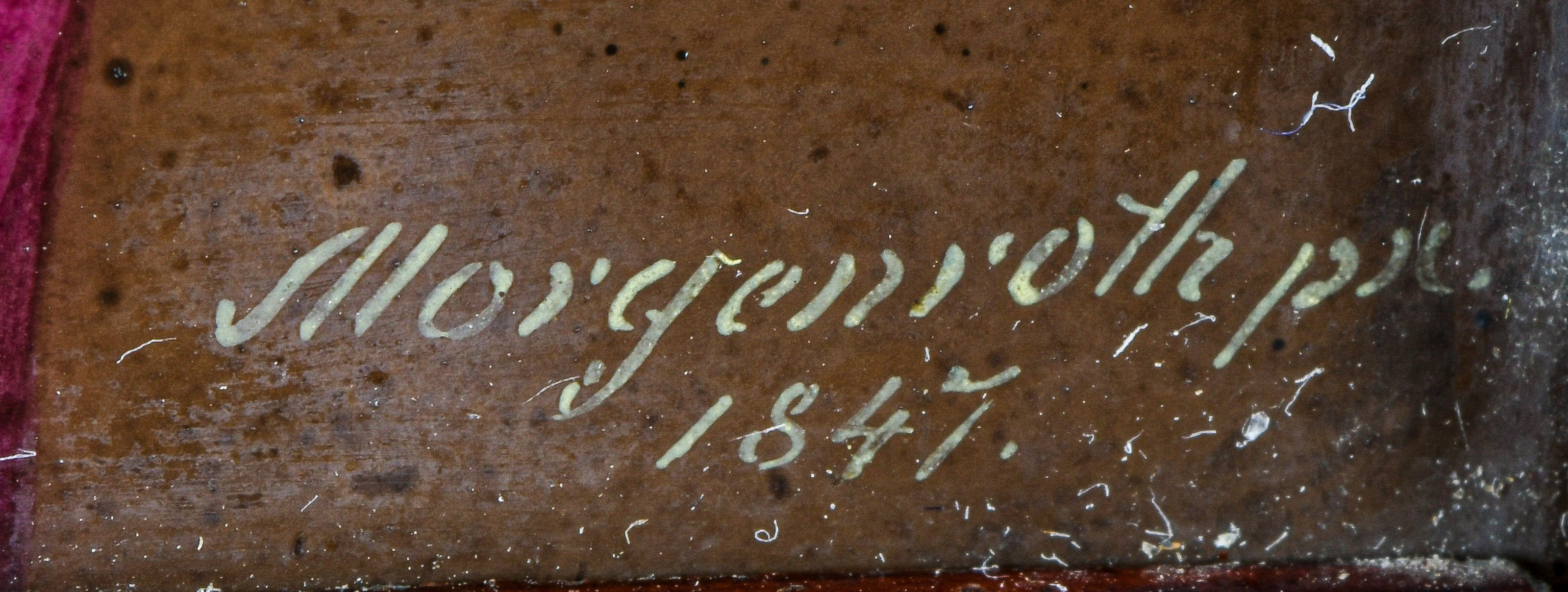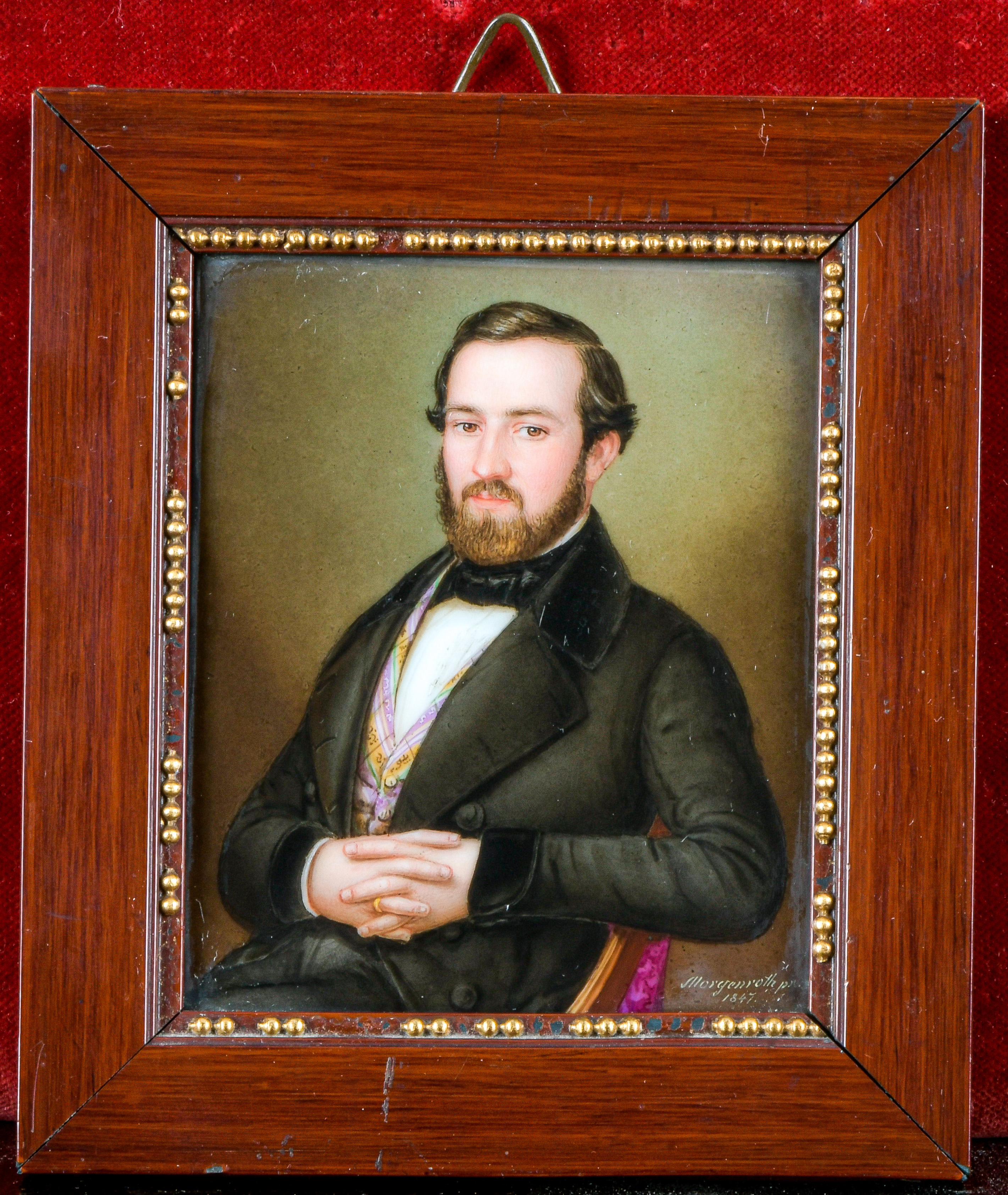 - Katalog-Nr: 841Johann Martin Morgenroth (1800-1859). Porträt eines Herren. Porzellantafel, bunt bemalt, re./u./sign./dat. 1847, in mahagonifurniertem Rahmen, 11 x 9,5 / 14 x 12,2 cm.o.L.