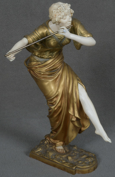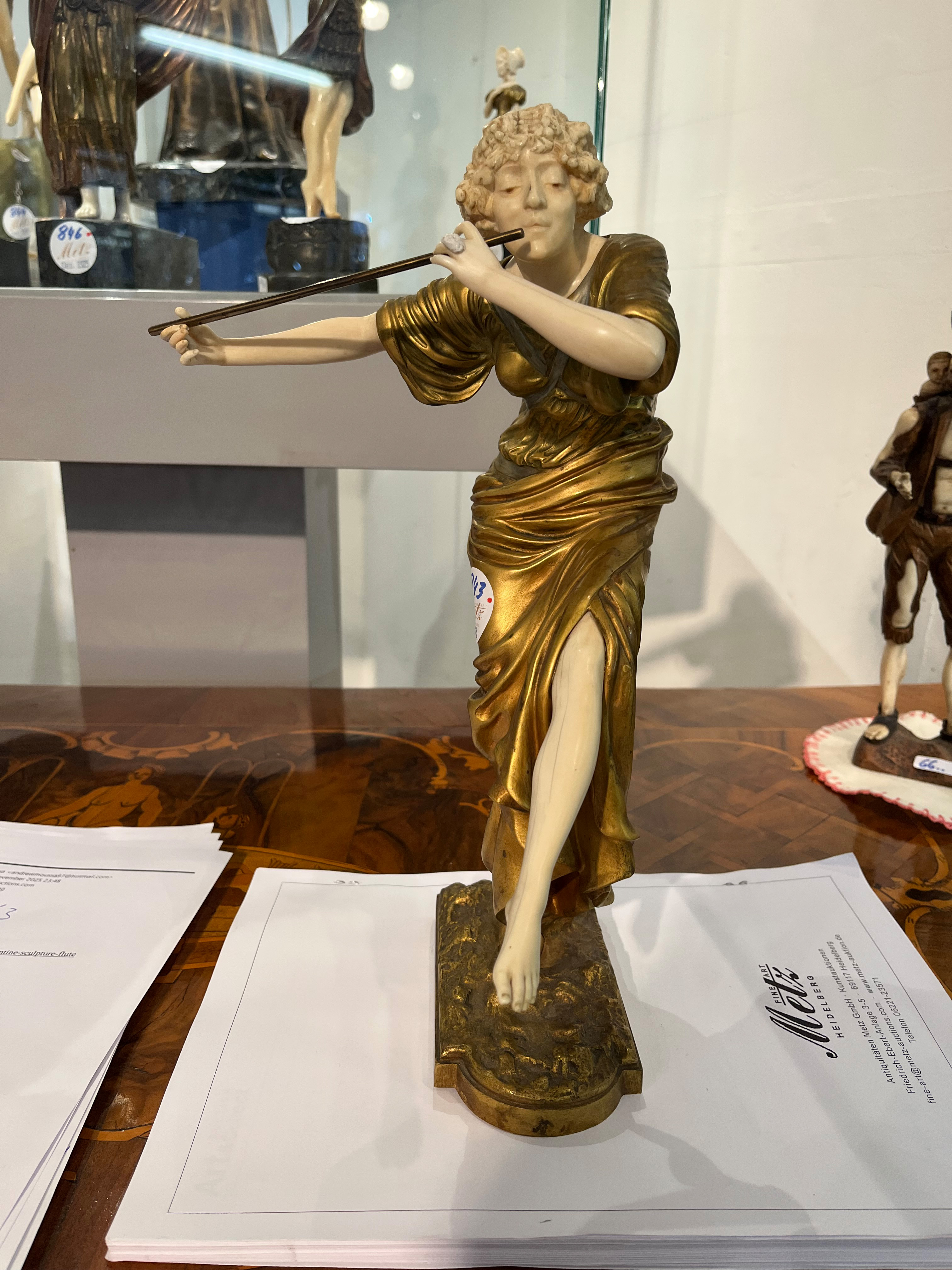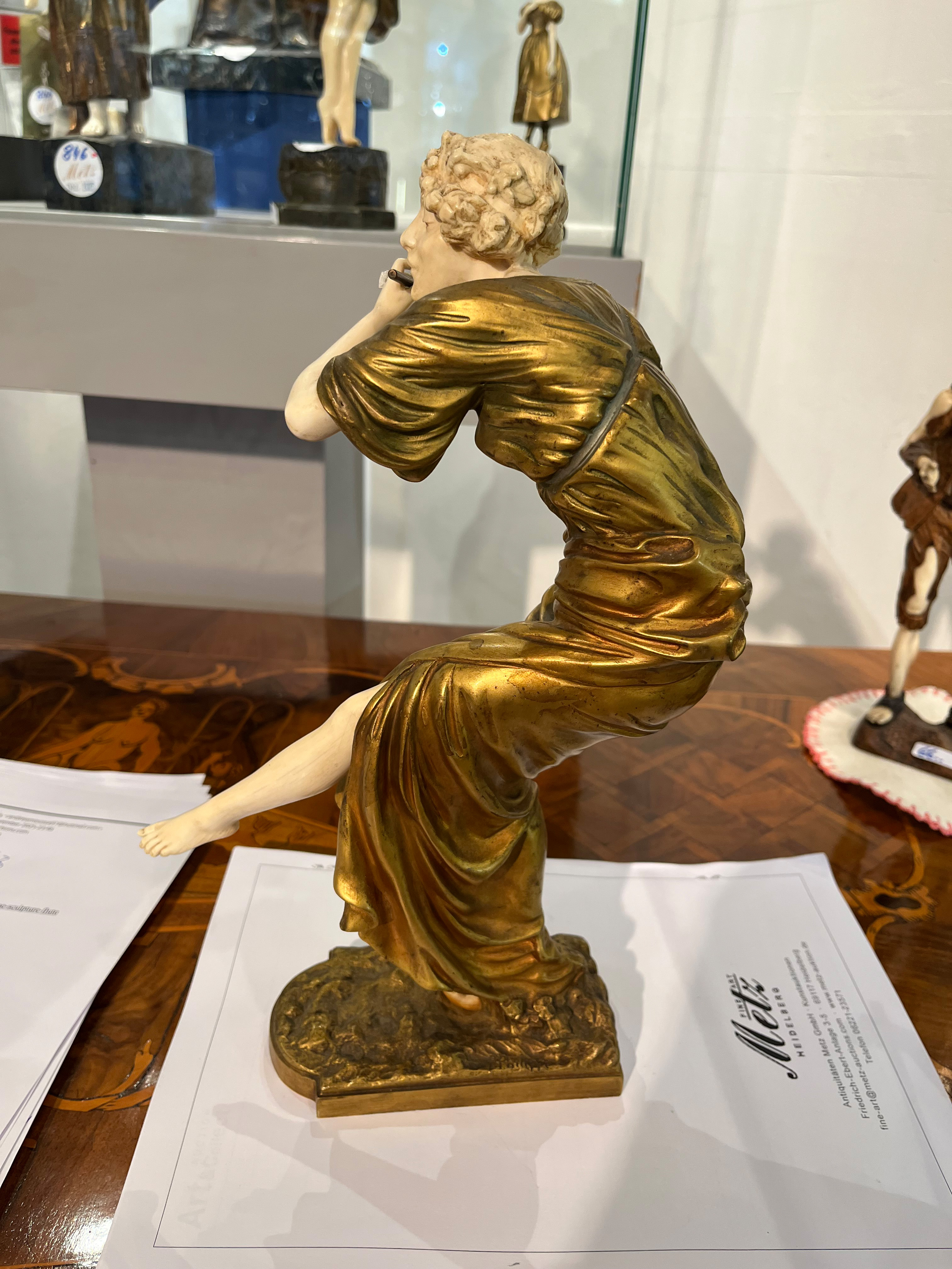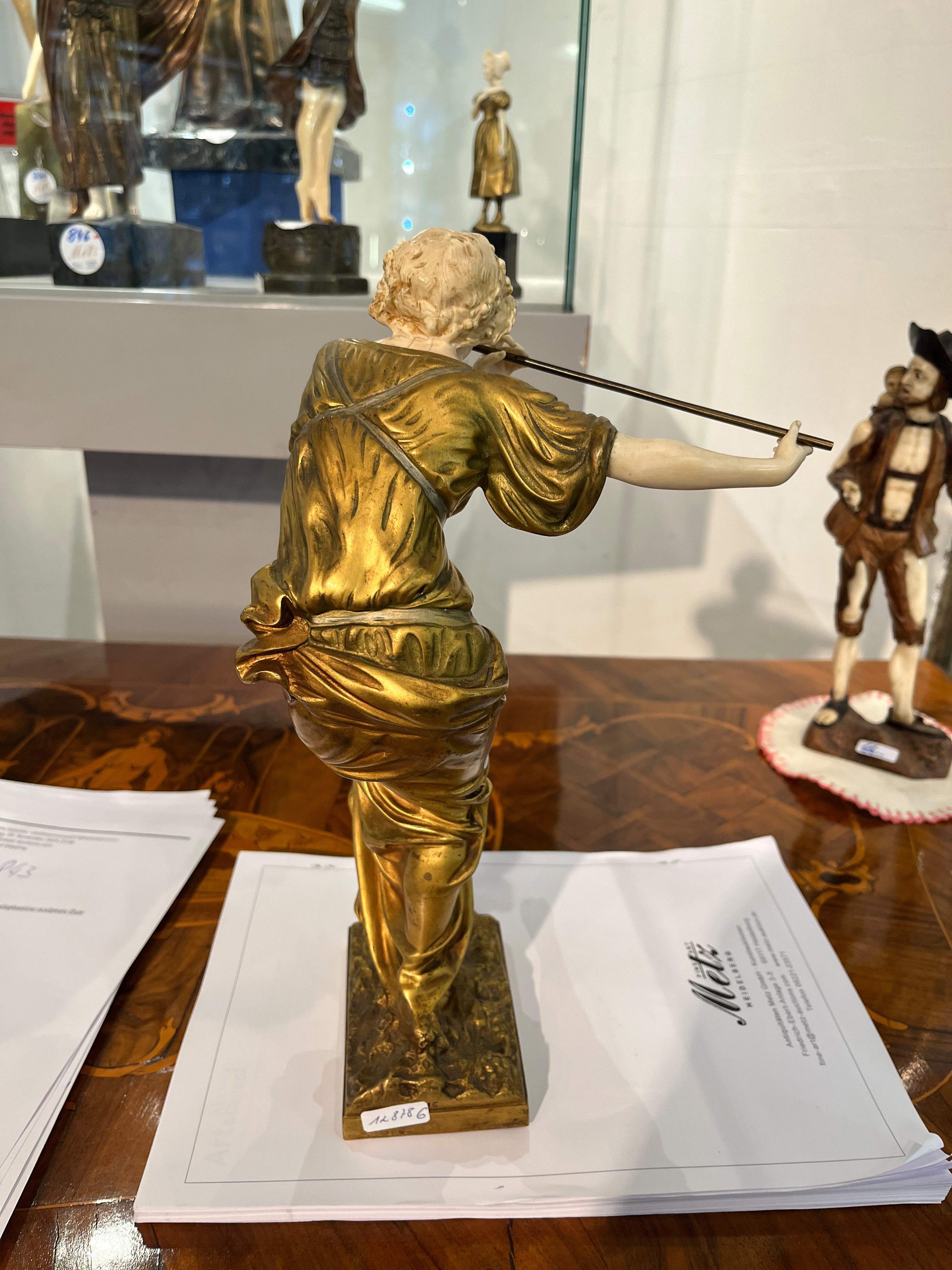 - Katalog-Nr: 843Paul Philippe (1870-1930). Chryséléphantine Skulptur „Flötenspielerin“. Feuervergoldeter Bronzekorpus mit geschnitztem Elfenbein-Kopf, -Armen, -Bein und -Fuß, auf Bronzesockel (H=33 cm). Elfenbein-Gutachten von Herrn Gregor von Solodkoff, Michelstadt, vom 27.06.2024, liegt vor, ebenso die Verkaufsgenehmigung durch das Regierungspräsidium Karlsruhe vom 26.05.2025. Diese können für den Gesamtbetrag von EUR 180,00 erworben werden. This item is illegal to sell to the U.K.o.L.