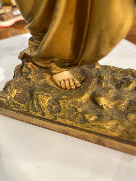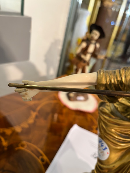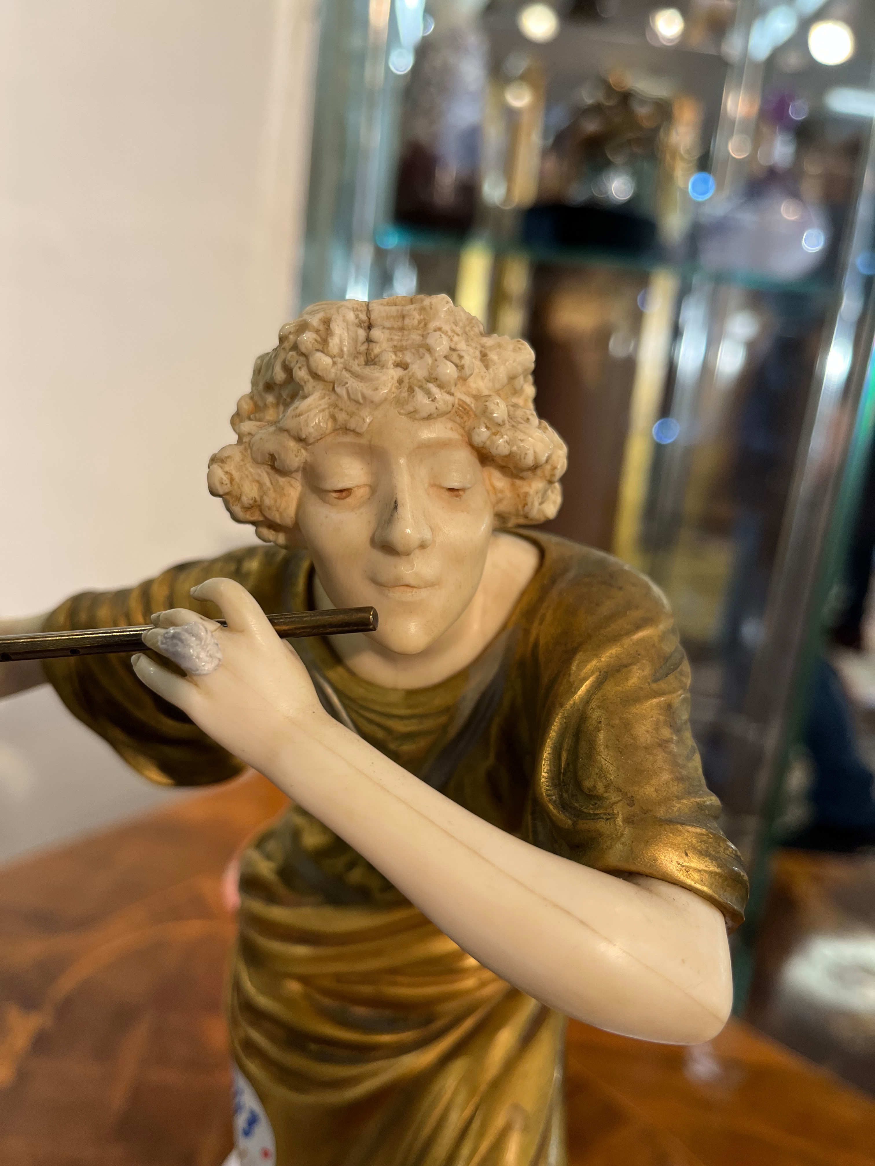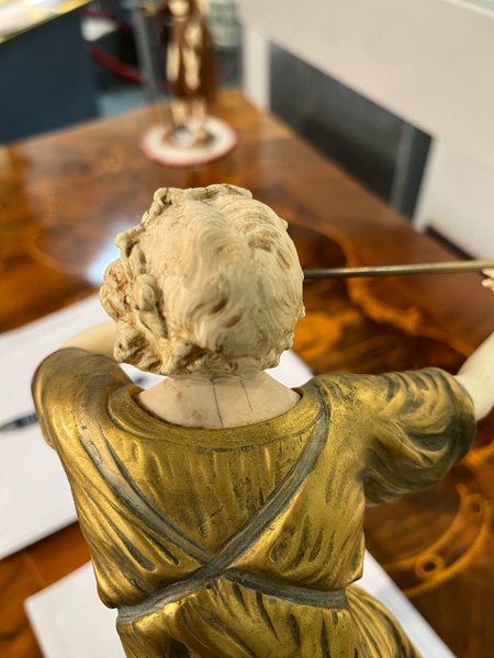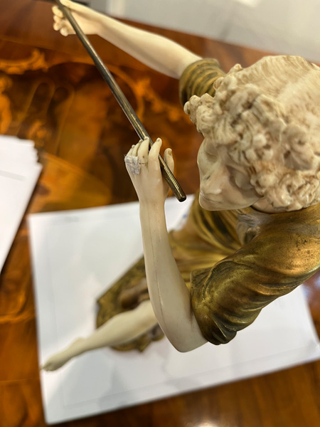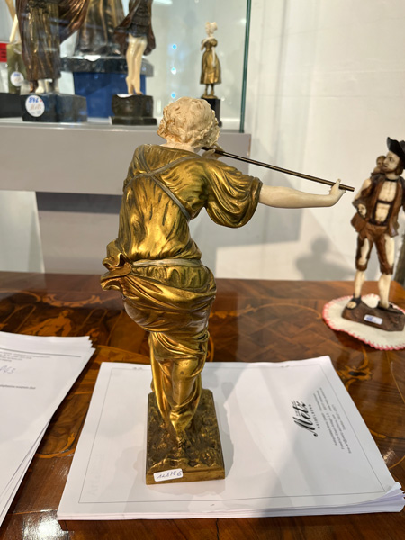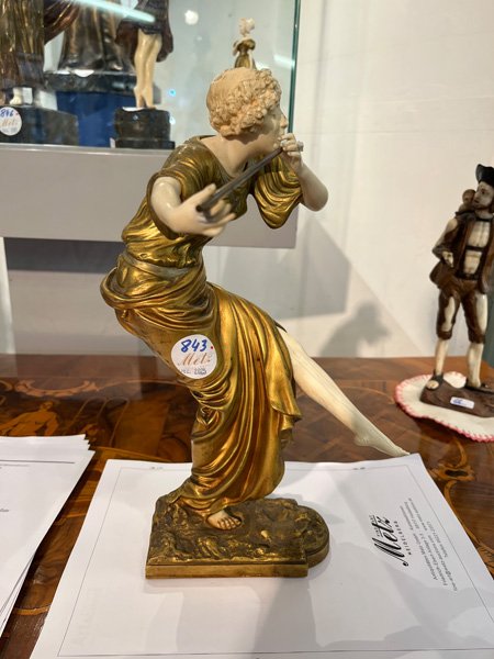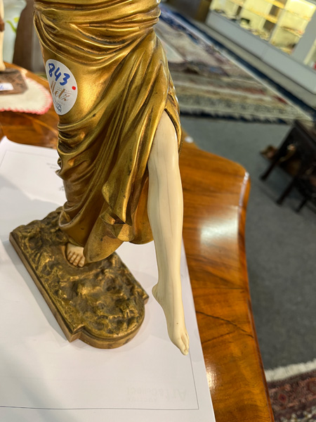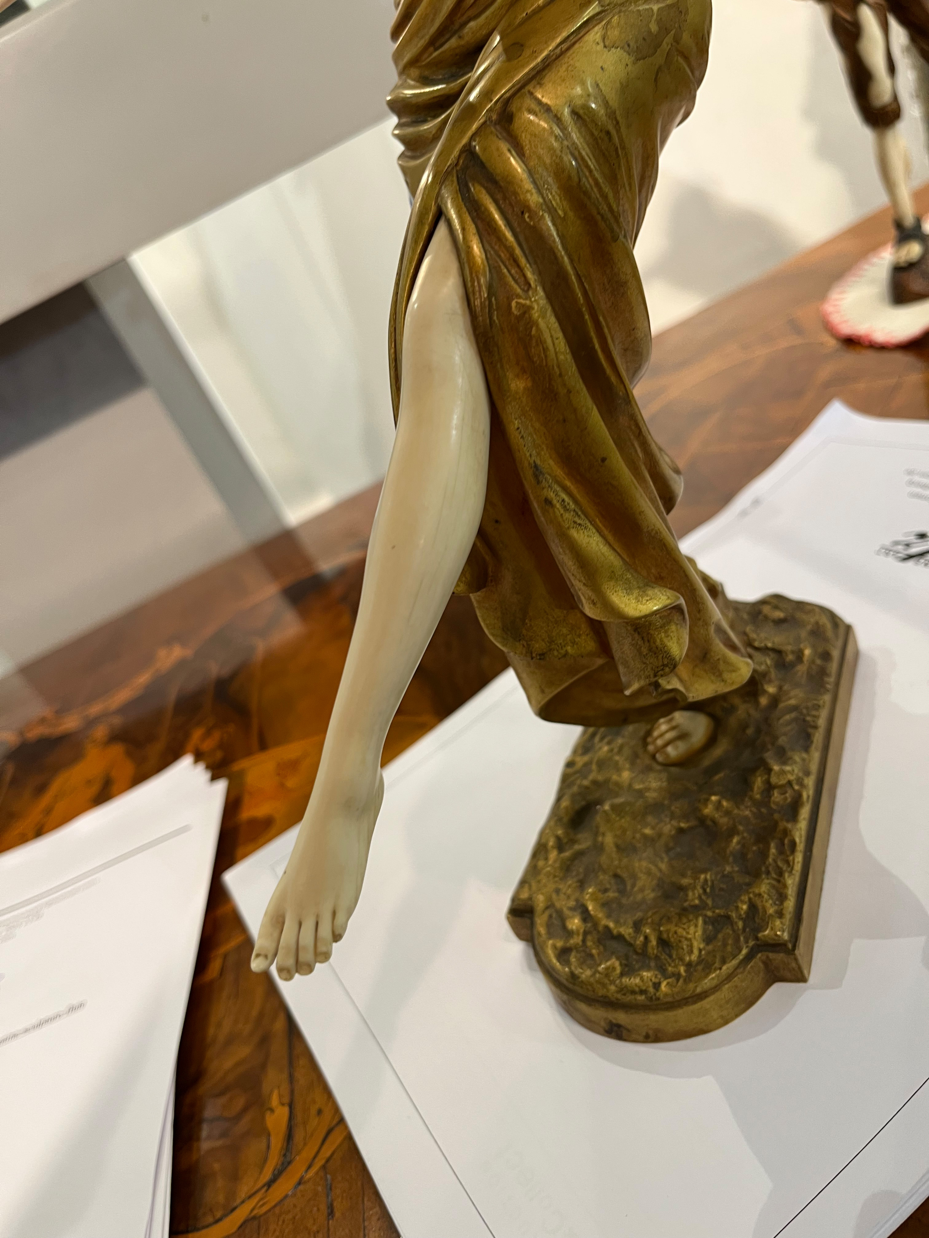 - Katalog-Nr: 843Paul Philippe (1870-1930). Chryséléphantine Skulptur „Flötenspielerin“. Feuervergoldeter Bronzekorpus mit geschnitztem Elfenbein-Kopf, -Armen, -Bein und -Fuß, auf Bronzesockel (H=33 cm). Elfenbein-Gutachten von Herrn Gregor von Solodkoff, Michelstadt, vom 27.06.2024, liegt vor, ebenso die Verkaufsgenehmigung durch das Regierungspräsidium Karlsruhe vom 26.05.2025. Diese können für den Gesamtbetrag von EUR 180,00 erworben werden. This item is illegal to sell to the U.K.o.L.