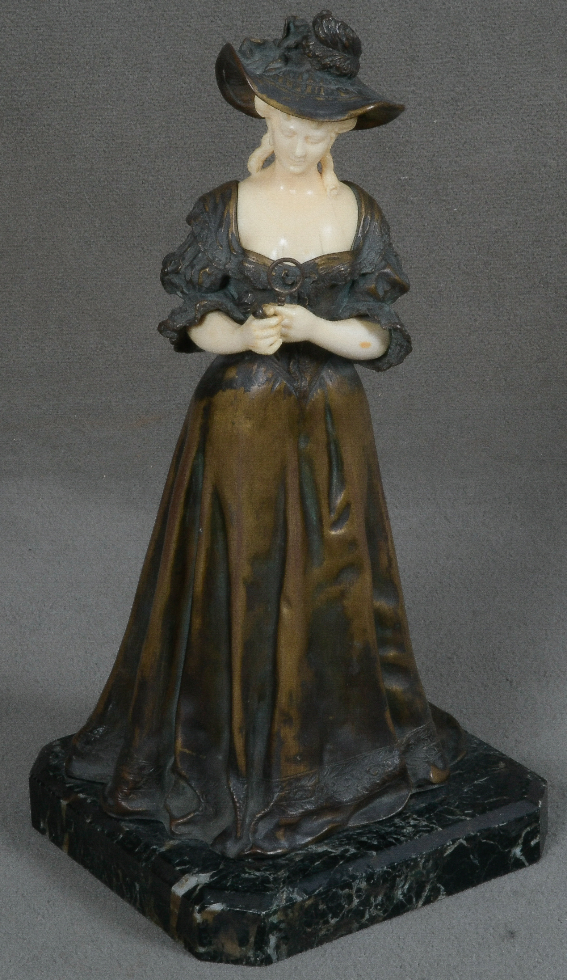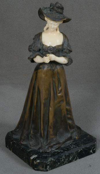 - Katalog-Nr: 845Armand Pierre Louis Quénard (1865-1925). Chryséléphantine Skulptur „Dame der Zeit Charles X“. Bronzekorpus mit geschnitzten Elfenbein-Kopf und -Armen, seitl. sign., auf Marmorsockel (H=37,5 cm). Elfenbein-Gutachten von Herrn Gregor von Solodkoff, Michelstadt, vom 24.06.2024, liegt vor, ebenso die Verkaufsgenehmigung durch das Regierungspräsidium Karlsruhe vom 26.05.2025. Diese können für den Gesamtbetrag von EUR 180,00 erworben werden. This item is illegal to sell to the U.K.o.L.