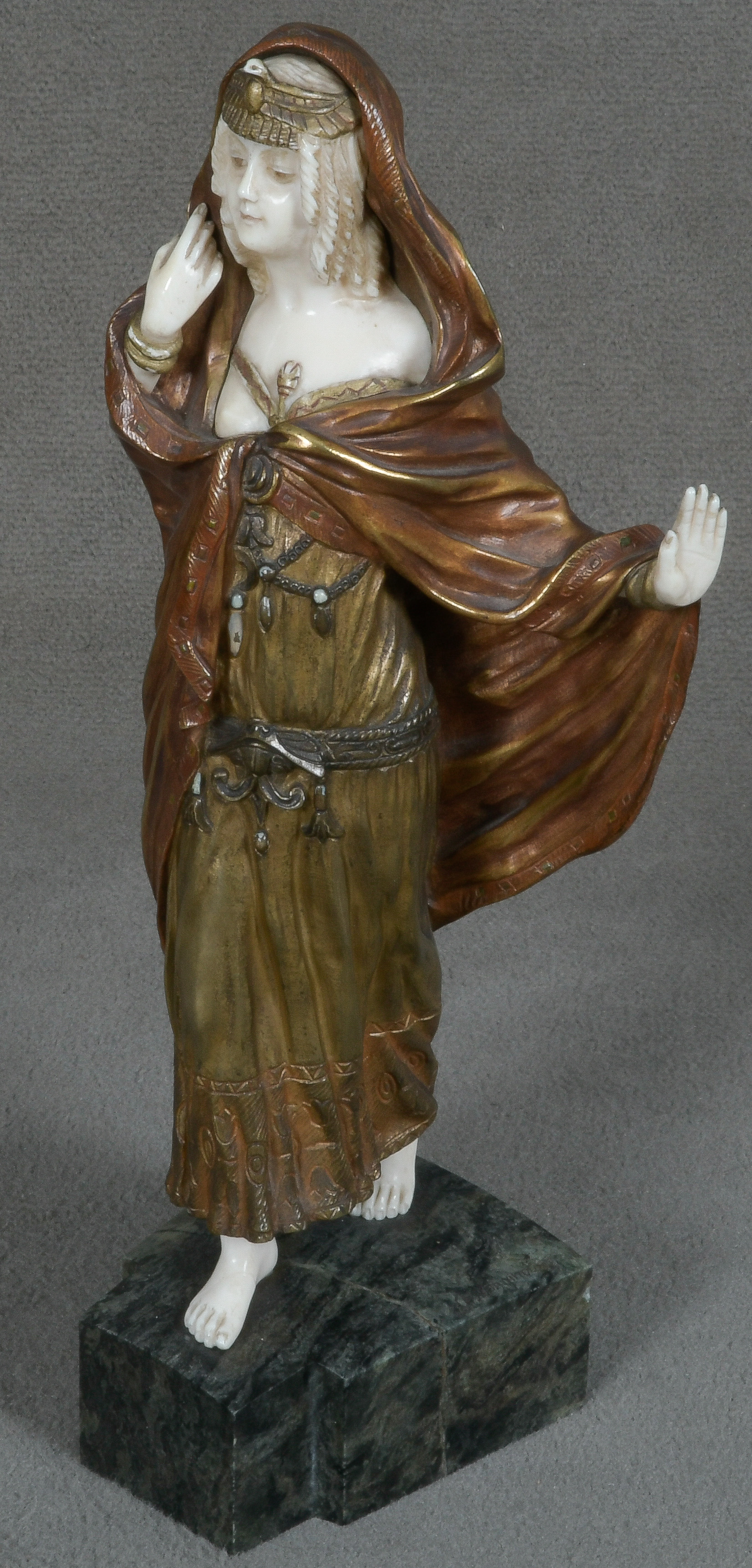 - Katalog-Nr: 846Charlotte H. Monginot (1872-1962). Chryséléphantine Skulptur „Femme Orientale“. Bronzekorpus mit geschnitzten Elfenbein-Kopf, -Händen und -Füßen, seitl. sign., auf Marmorsockel (H=32 cm). Elfenbein-Gutachten von Herrn Gregor von Solodkoff, Michelstadt, vom 26.06.2024, liegt vor, ebenso die Verkaufsgenehmigung durch das Regierungspräsidium Karlsruhe vom 26.05.2025. Diese können für den Gesamtbetrag von EUR 180,00 erworben werden. This item is illegal to sell to the U.K.o.L.