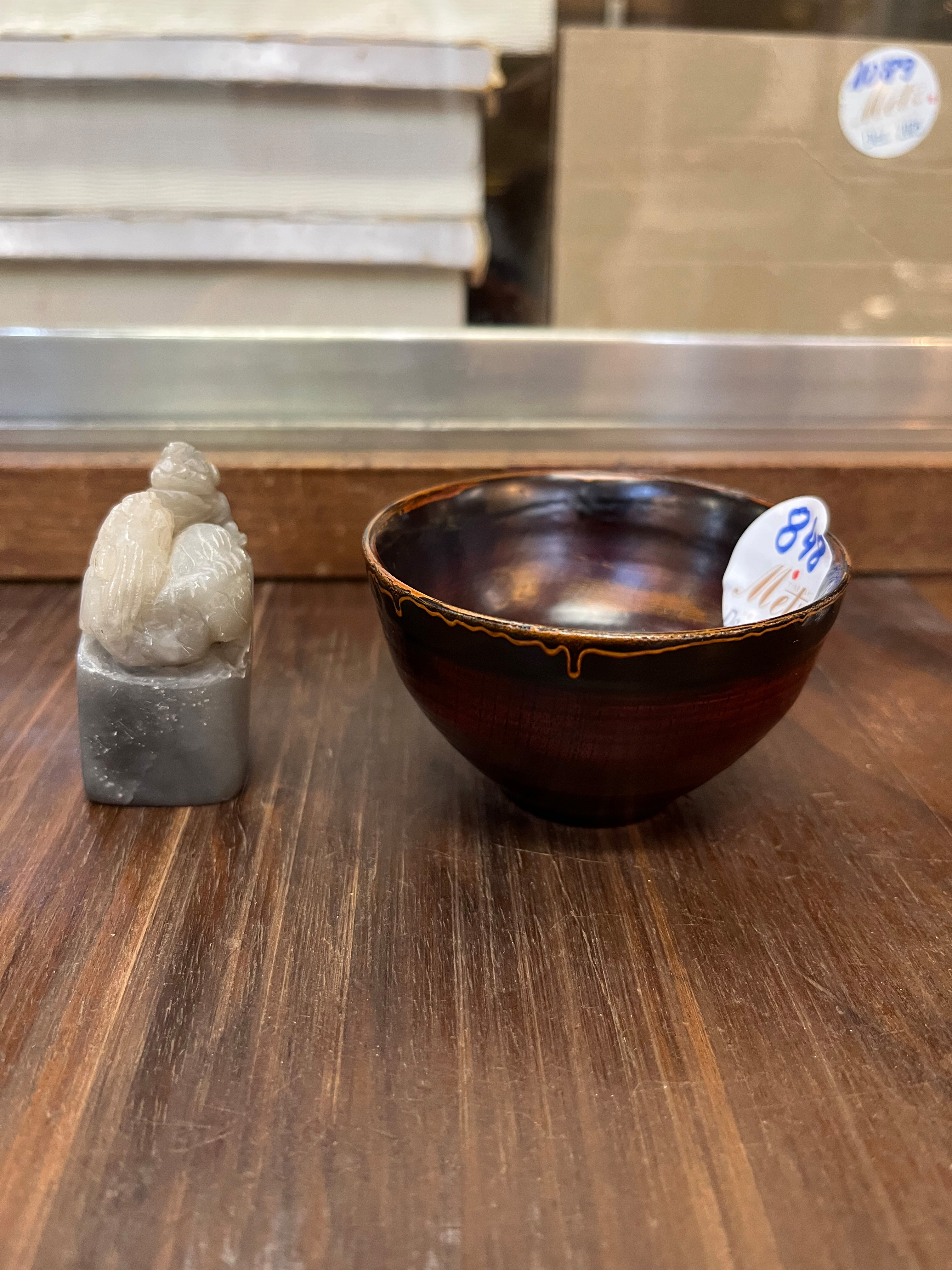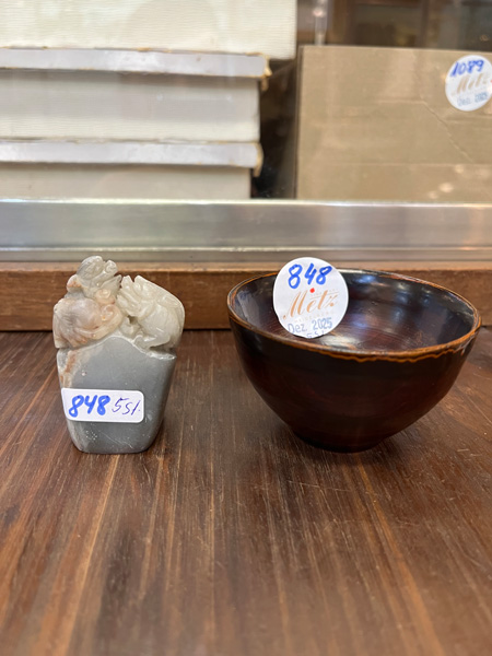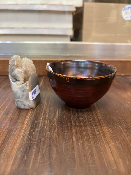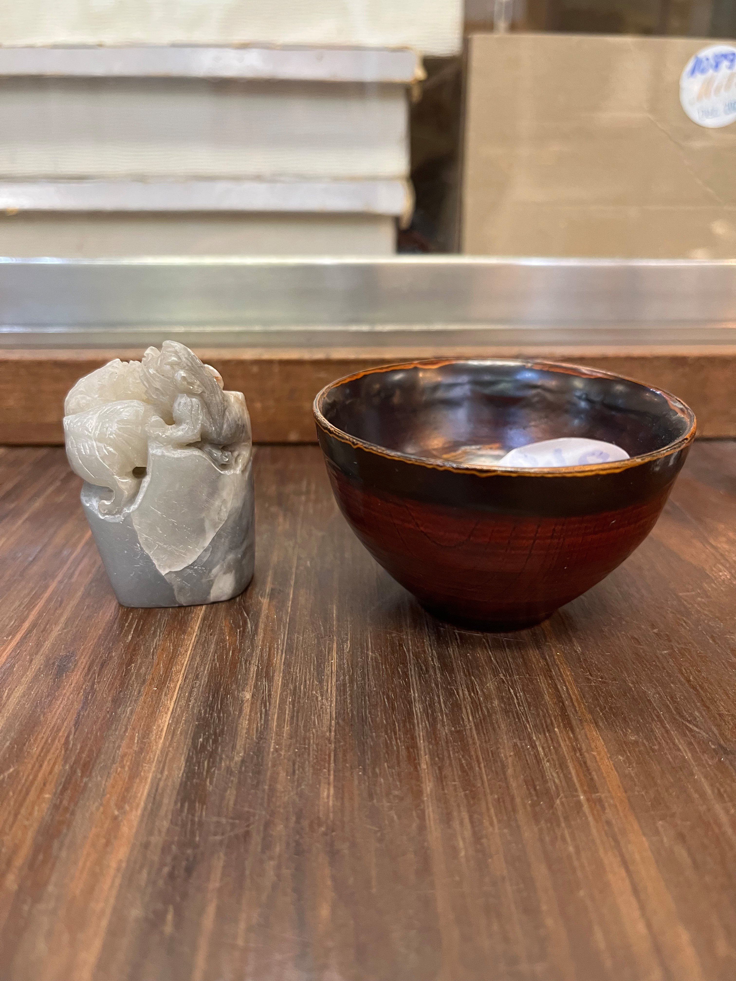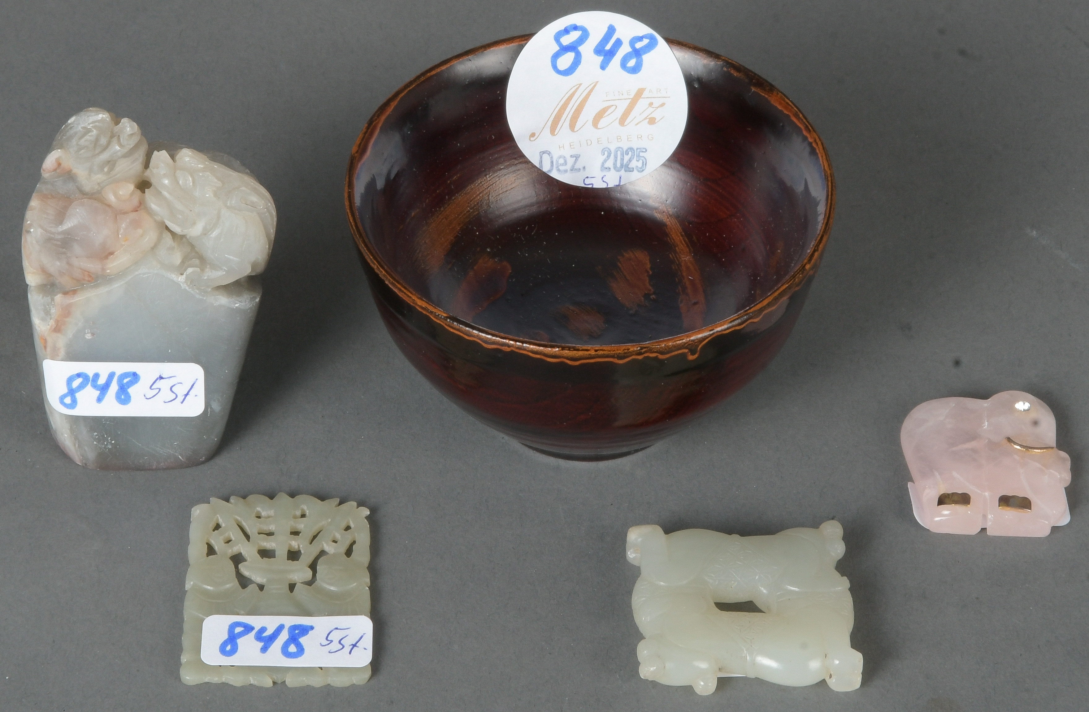 - Katalog-Nr: 848Fünftlgs. Konvolut Asiatika aus Bronze, Holz und Speckstein. Bestehend aus: Div. Schnitzereien (H=3 bis 4 cm), Stempel (H=5,5 cm) und Schälchen (H=5 cm, D=7,5 cm).o.L.