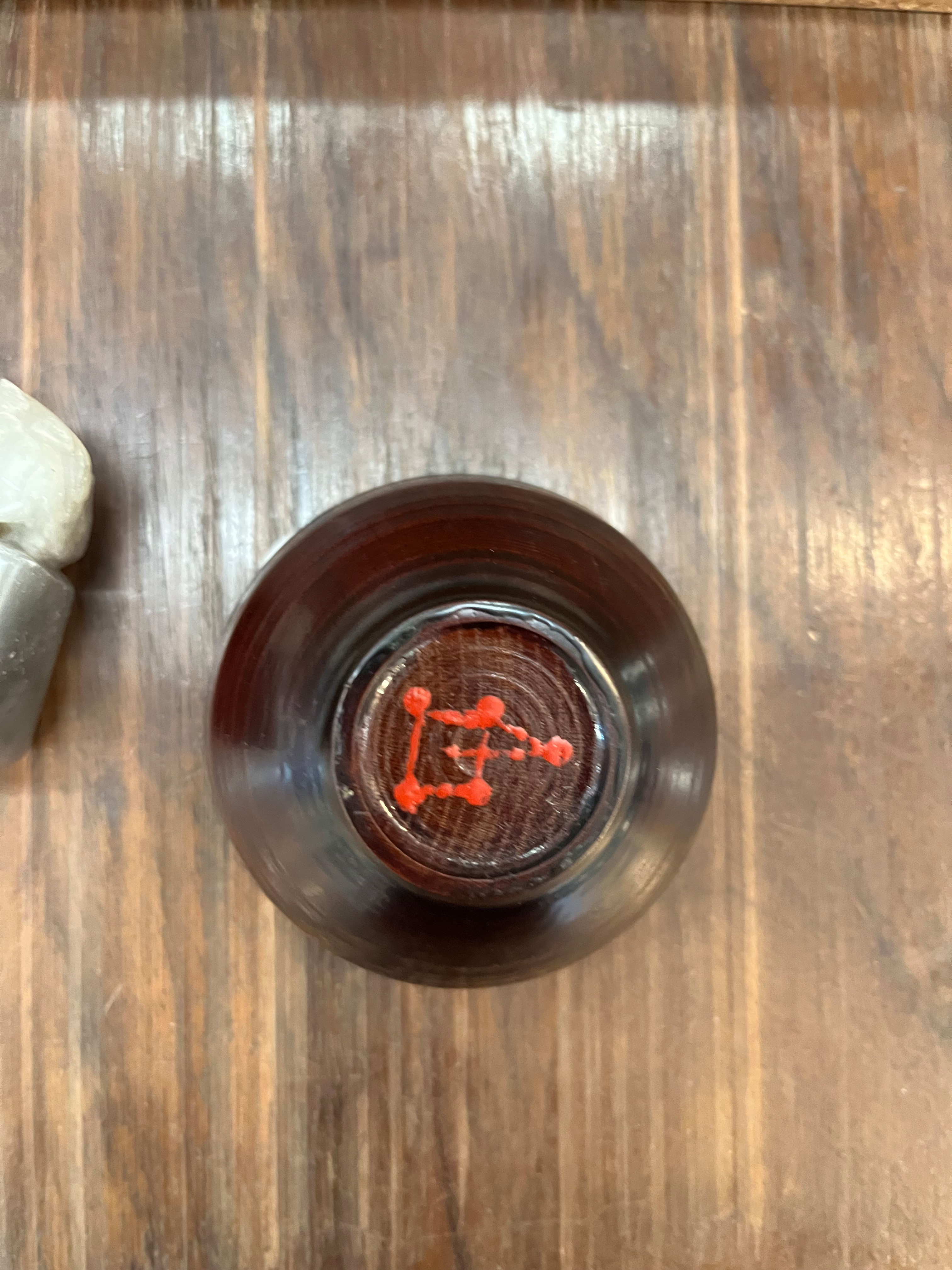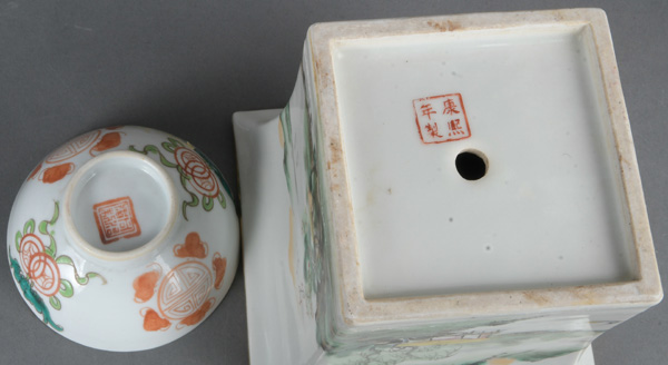 - Katalog-Nr: 850Dreitlgs. Konvolut Asiatika aus Holz und Porzellan: Vier Schabstifte im Etui, eine runde Kumme (H=11,5 cm, D=21 cm), ein Cachepot (H=14 cm) und zwei Koppchen.o.L.
