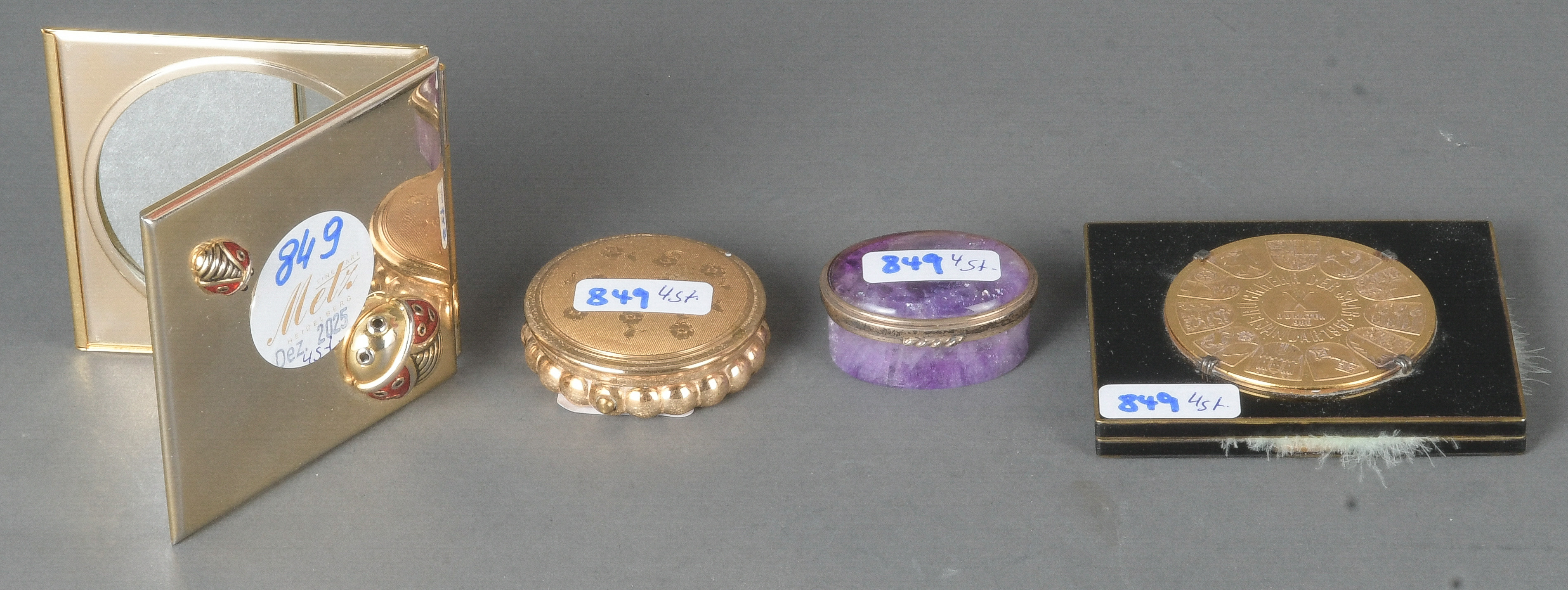 - Katalog-Nr: 849Viertlgs. Konvolut Kleinkunstobjekte. Deutsch 19. Jh. Email / Silber / vergoldetes Metall. Bestehend aus: Zwei Puderdosen (7,3 x 7,9 / 6,6 x 7,8 cm) und zwei Pillendosen (H=1,5 cm, D=4,5 cm / H=1,9 cm, B=4 cm, T=3,2 cm).o.L.