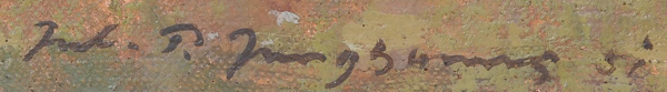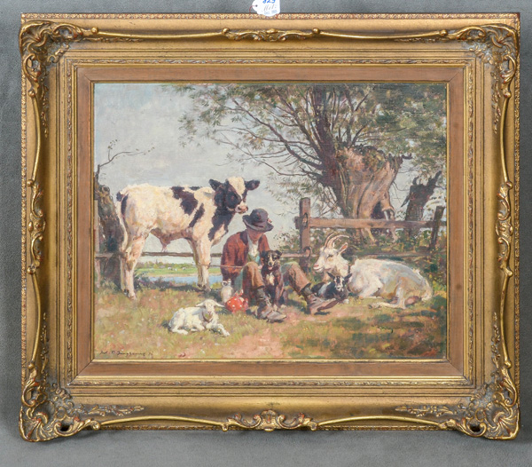 - Katalog-Nr: 829Julius Paul Junghanns (1876-1958). Hütejunge mit Ziegen, Hund und Kalb in Flusslandschaft. Öl/Lw., li./u./sign./dat. (19)50, 40 x 50 cm.o.L.