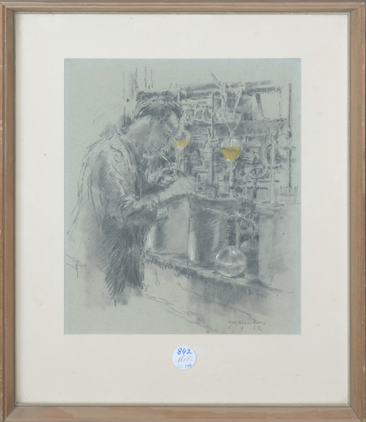 - Katalog-Nr: 842Friedrich Wilhelm Kleukens (1878-1956). Männliche Figur in Labor. Mischtechnik, re./u./sign., mit Passepartout hi./Gl. gerahmt, 36 x 30 cm.o.L.