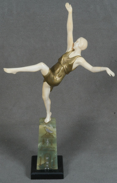 - Katalog-Nr: 844Marcel Guillemard (1886-1932). Chryséléphantine Skulptur „Danseuse“. Feuervergoldeter Bronzekorpus mit geschnitztem Elfenbein-Kopf, -Armen und -Beinen, seitl. sign., auf Marmorsockel (H=46 cm). Elfenbein-Gutachten von Herrn Gregor von Solodkoff, Michelstadt, vom 22.06.2024, liegt vor, ebenso die Verkaufsgenehmigung durch das Regierungspräsidium Karlsruhe vom 26.05.2025. Diese können für den Gesamtbetrag von EUR 180,00 erworben werden. This item is illegal to sell to the U.K.o.L.