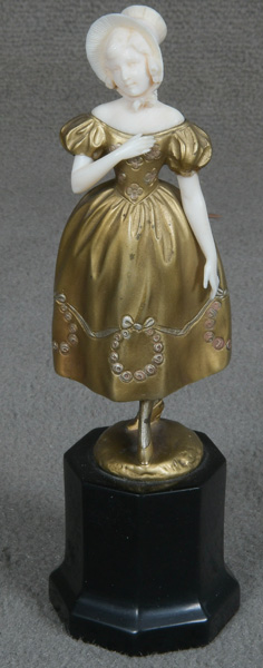 - Katalog-Nr: 847Ferdinand Preiss (1882-1943). Chryséléphantine Skulptur „Biedermeier Mädchen“. Bronzekorpus mit geschnitzten Elfenbein-Kopf und -Armen, seitl. sign., auf Marmorsockel (H=15 cm). Elfenbein-Gutachten von Herrn Gregor von Solodkoff, Michelstadt, vom 27.06.2024, liegt vor, ebenso die Verkaufsgenehmigung durch das Regierungspräsidium Karlsruhe vom 26.05.2025. Diese können für den Gesamtbetrag von EUR 180,00 erworben werden. This item is illegal to sell to the U.K.o.L.