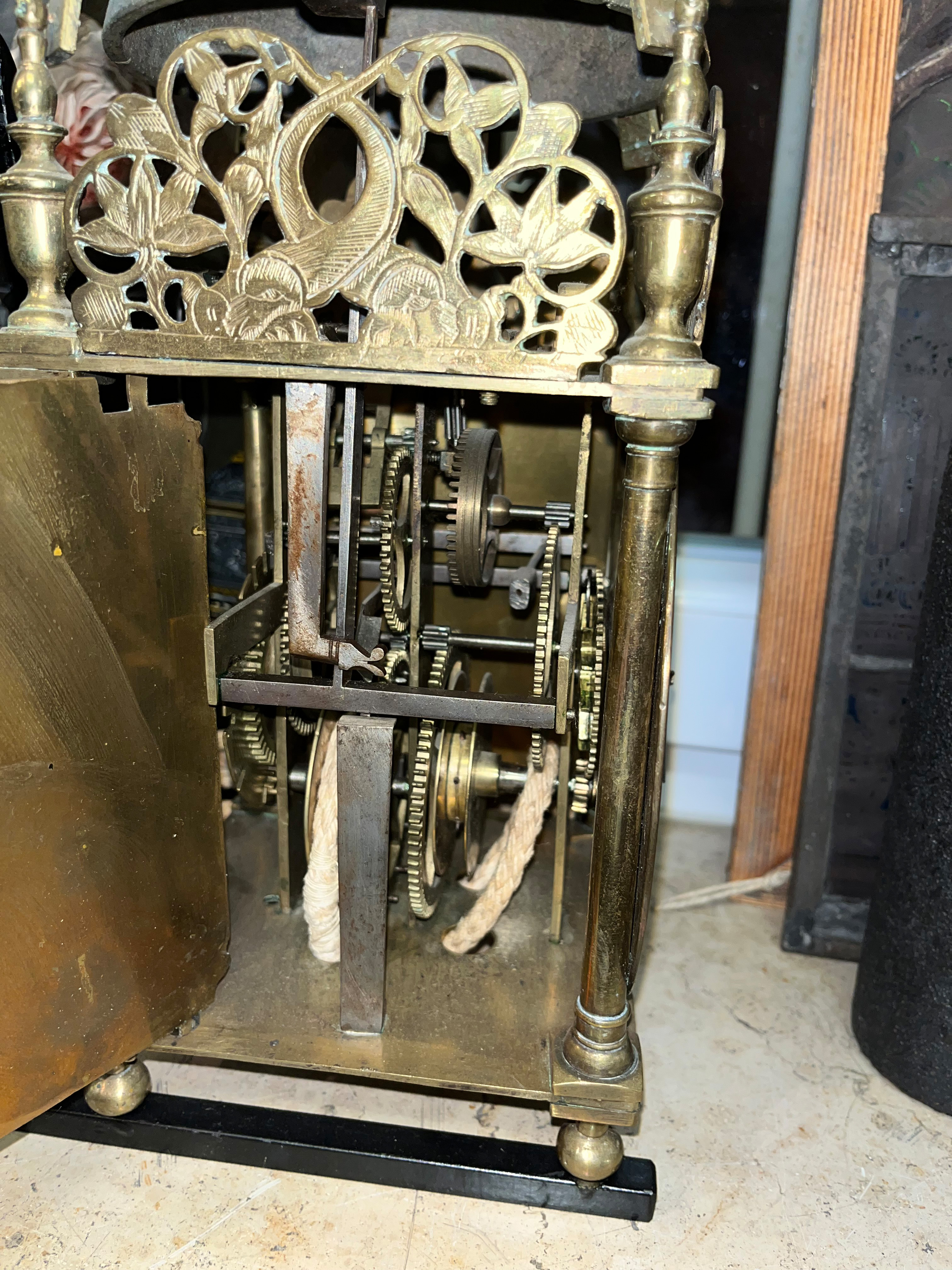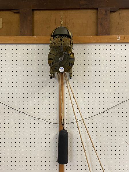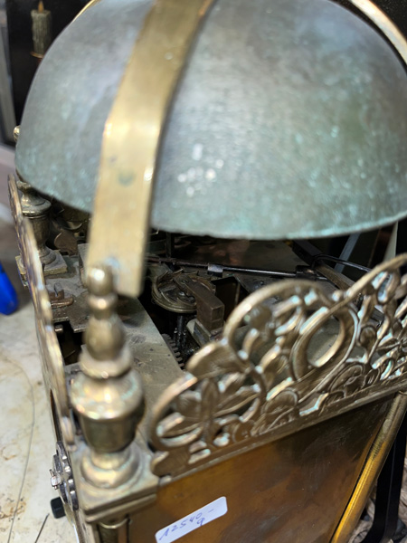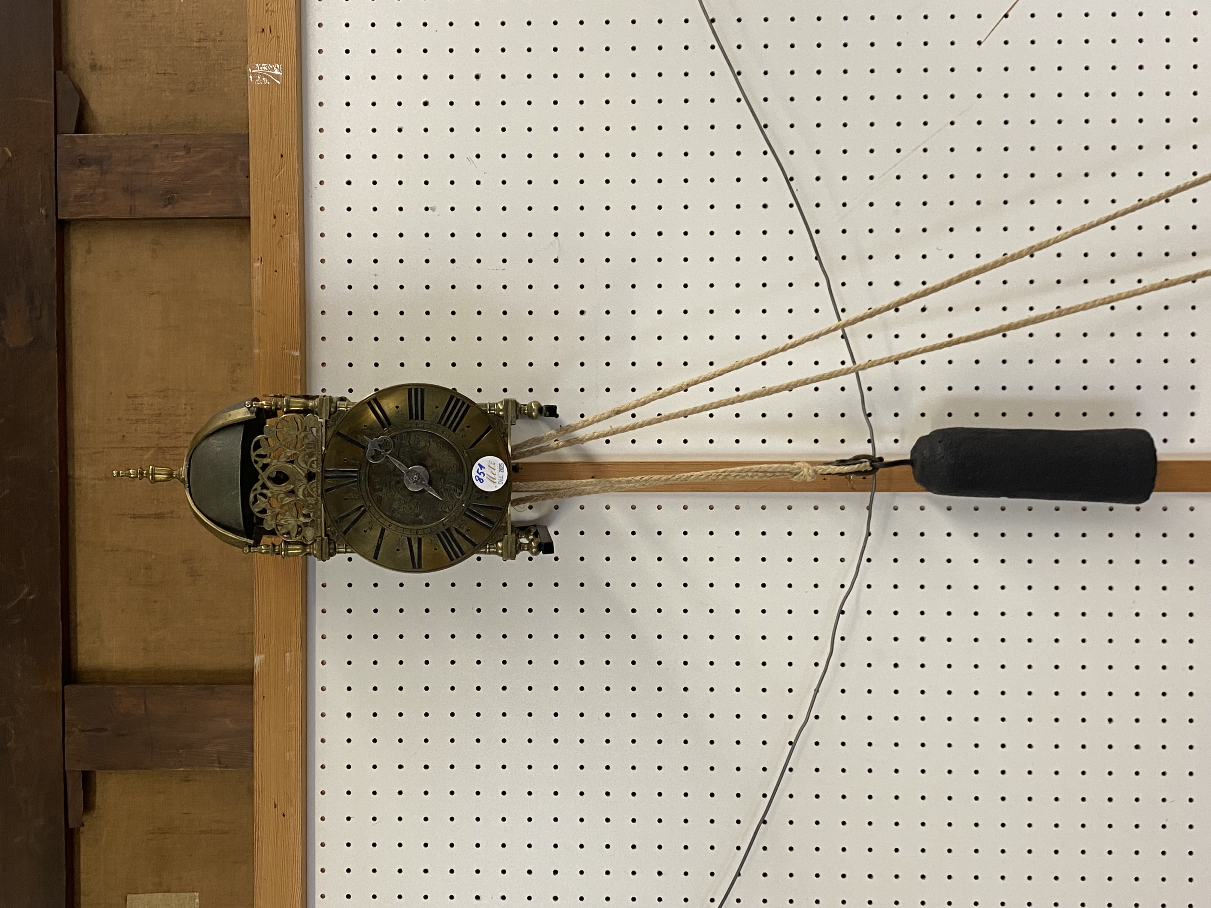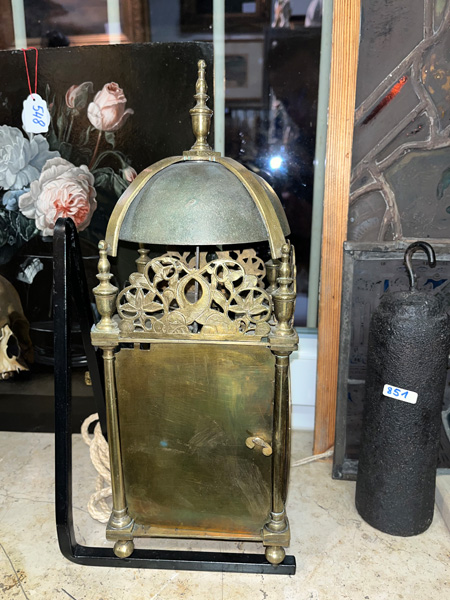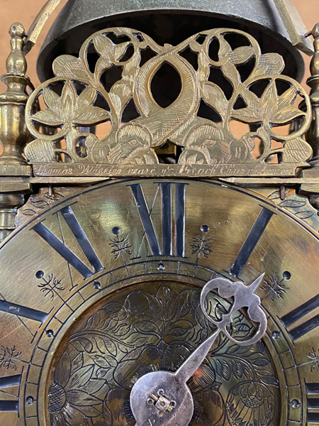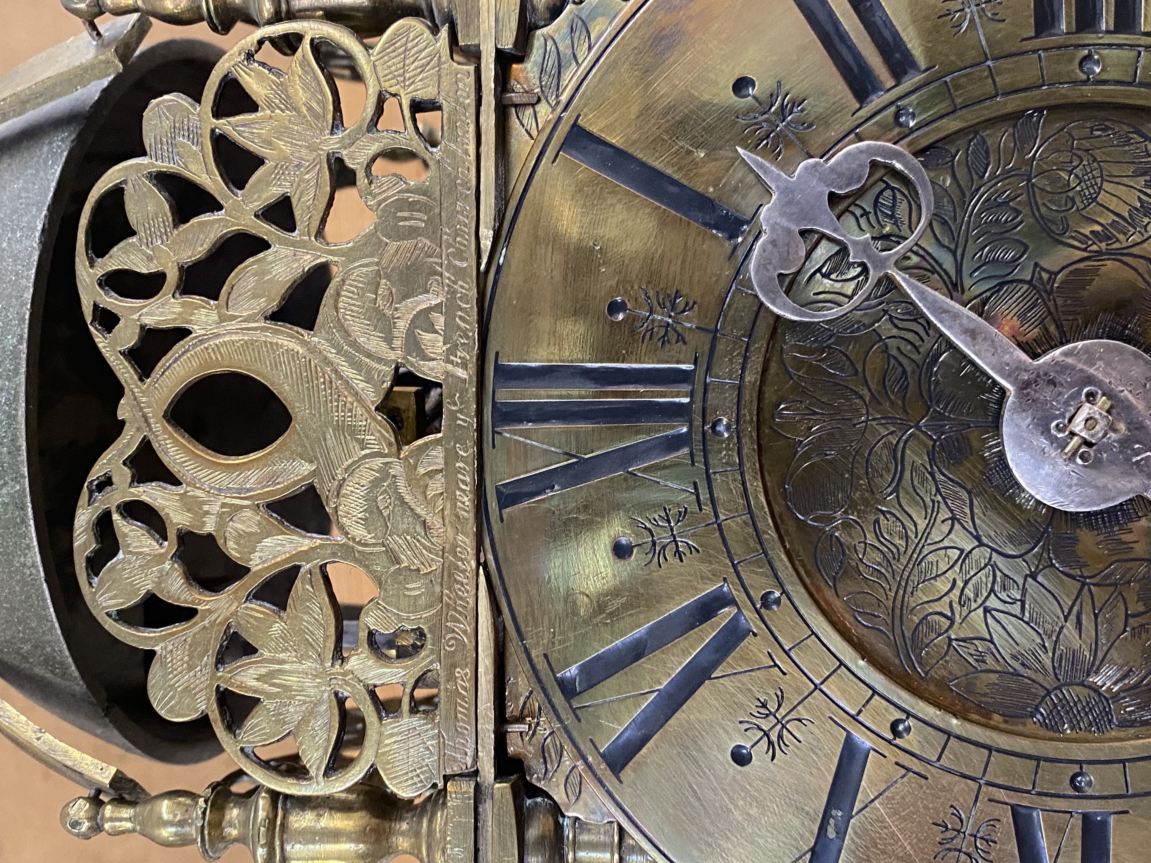 - Katalog-Nr: 851Laternenuhr. London, Thomas Wheeler 17. Jh. Bronze, mit gusseiserner Glocke und Messingzifferblatt, oberhalb beschriftet: „Thomas Wheeler near e ye French Church London“, H=38,5 cm, B=14 cm, T=14,5 cm. (Funktion ungeprüft)o.L.
