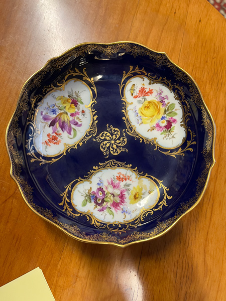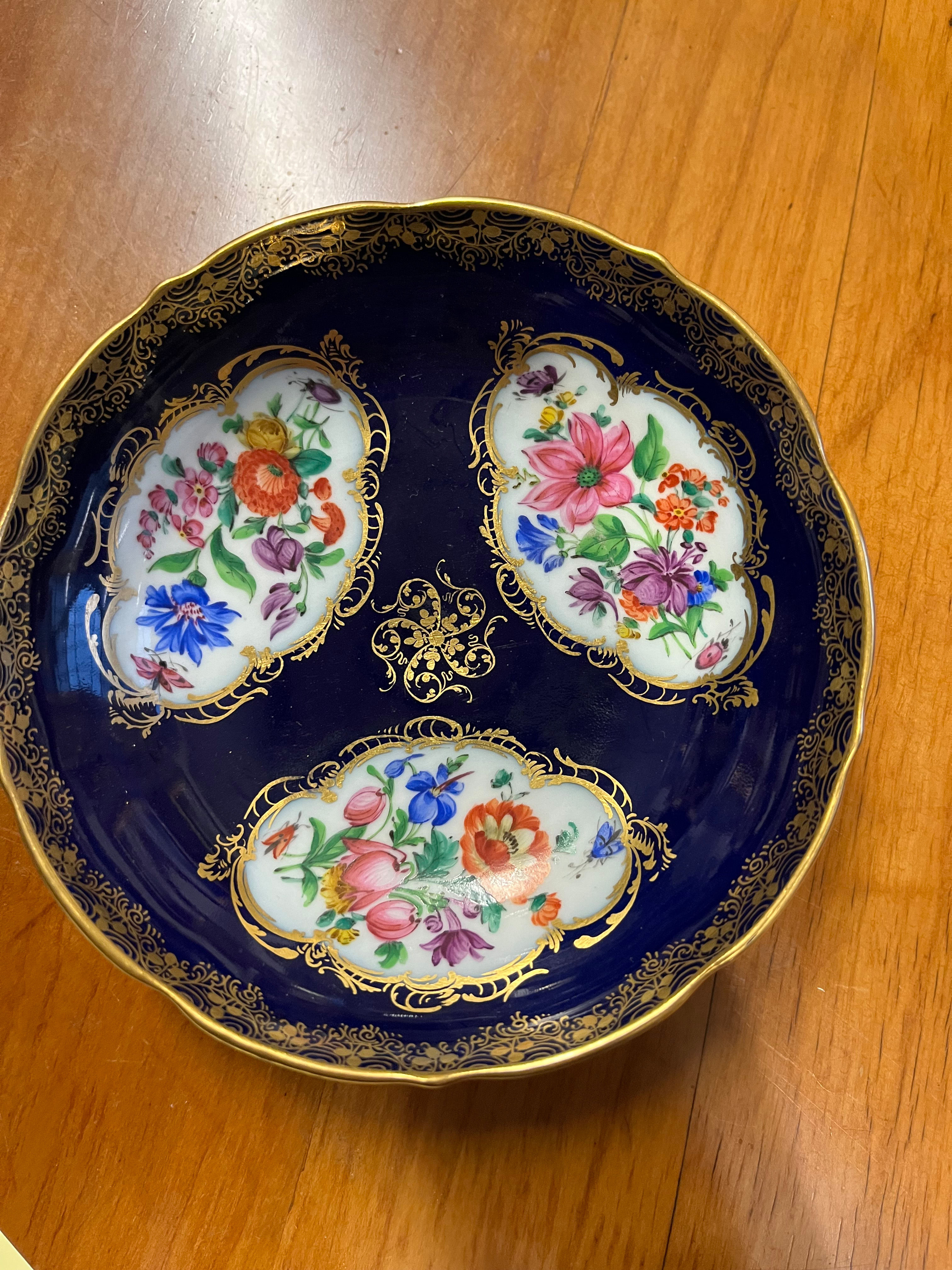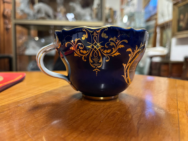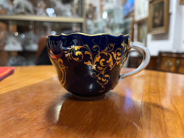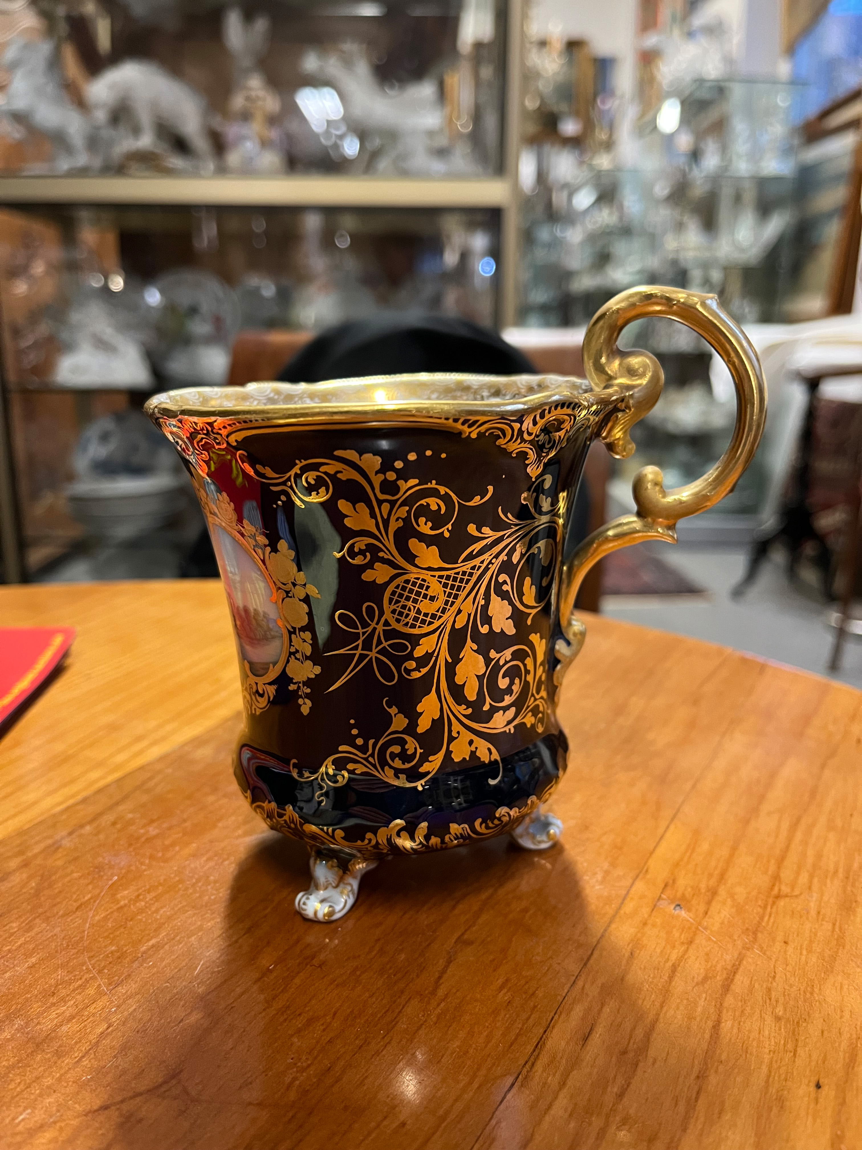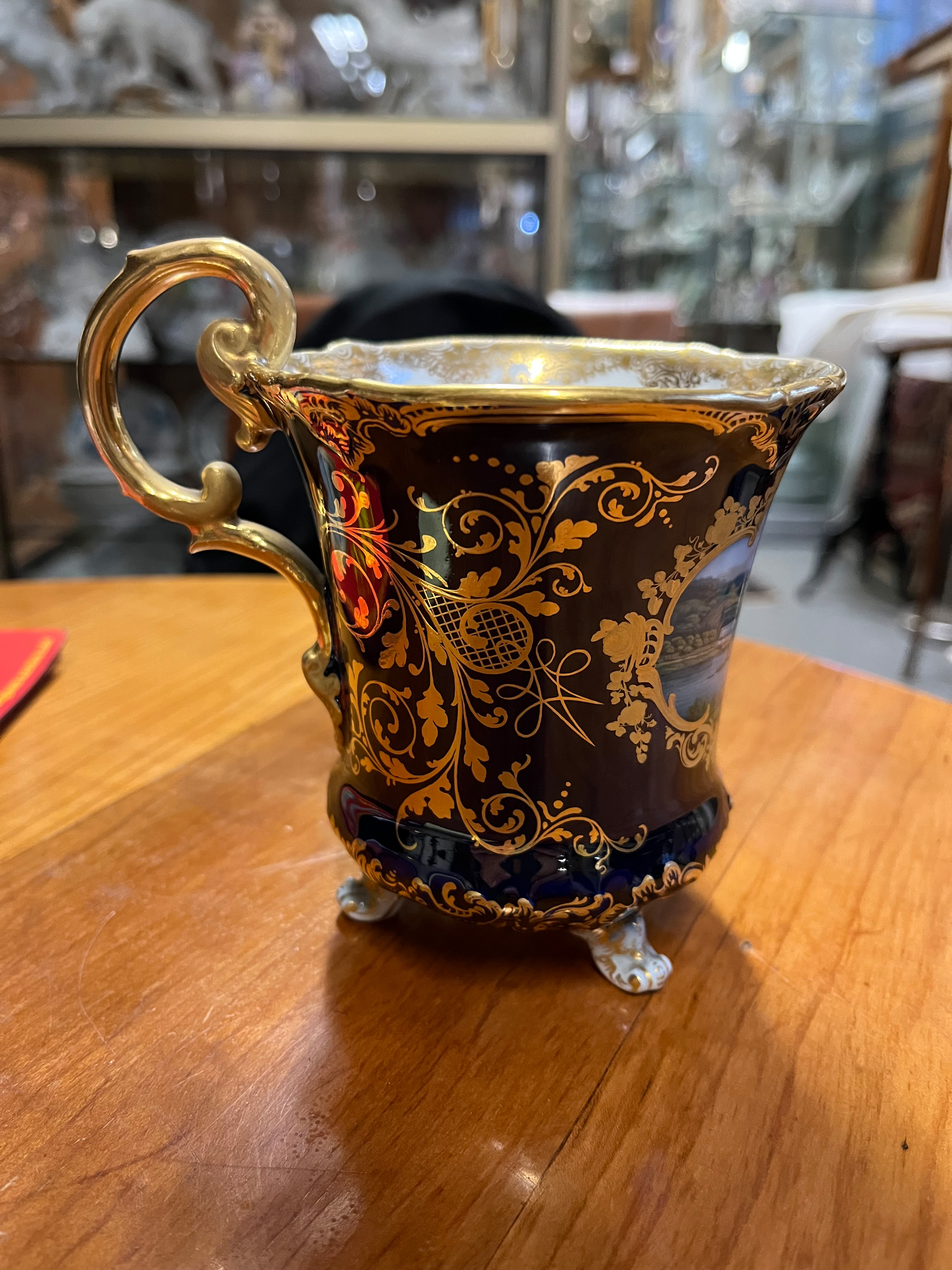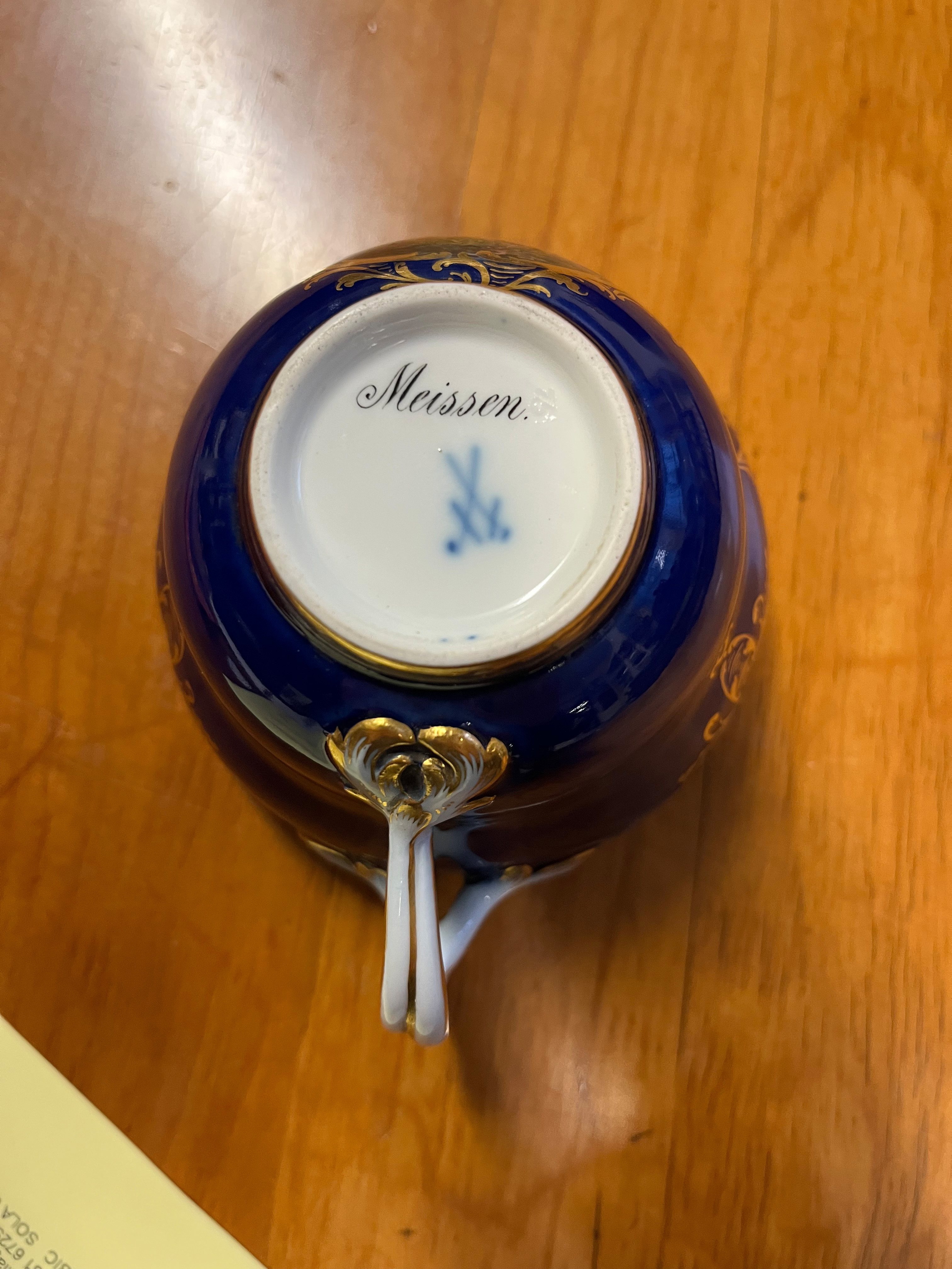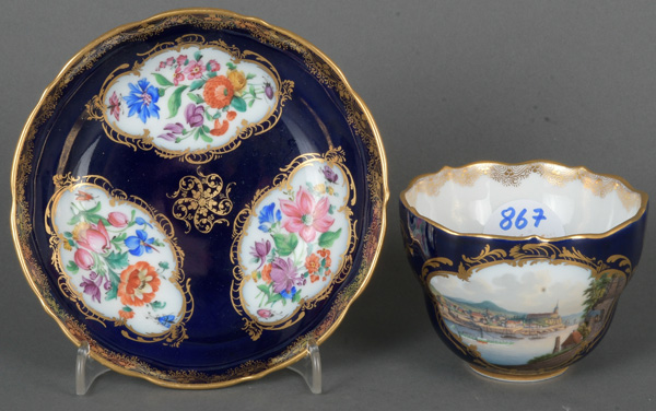- Katalog-Nr: 868Schokoladentasse mit Unterschale. Meissen 19. Jh. Porzellan, mit kobaltblauem Fond, Goldspitzenbordüre und -kartusche, bunt bemalt mit Blumenbouquet bzw. der Ansicht von „Dresden"; am Boden unterglasurblaue Schwertermarke und betitelt.o.L.