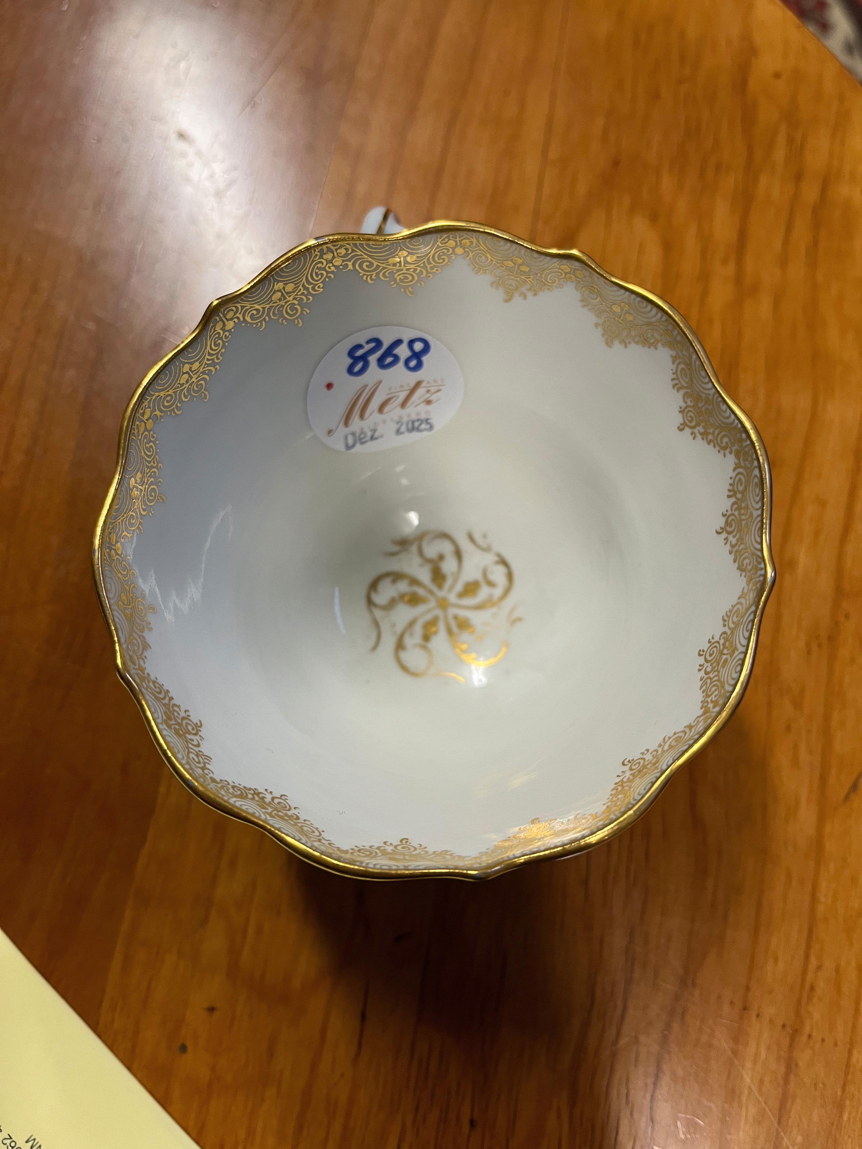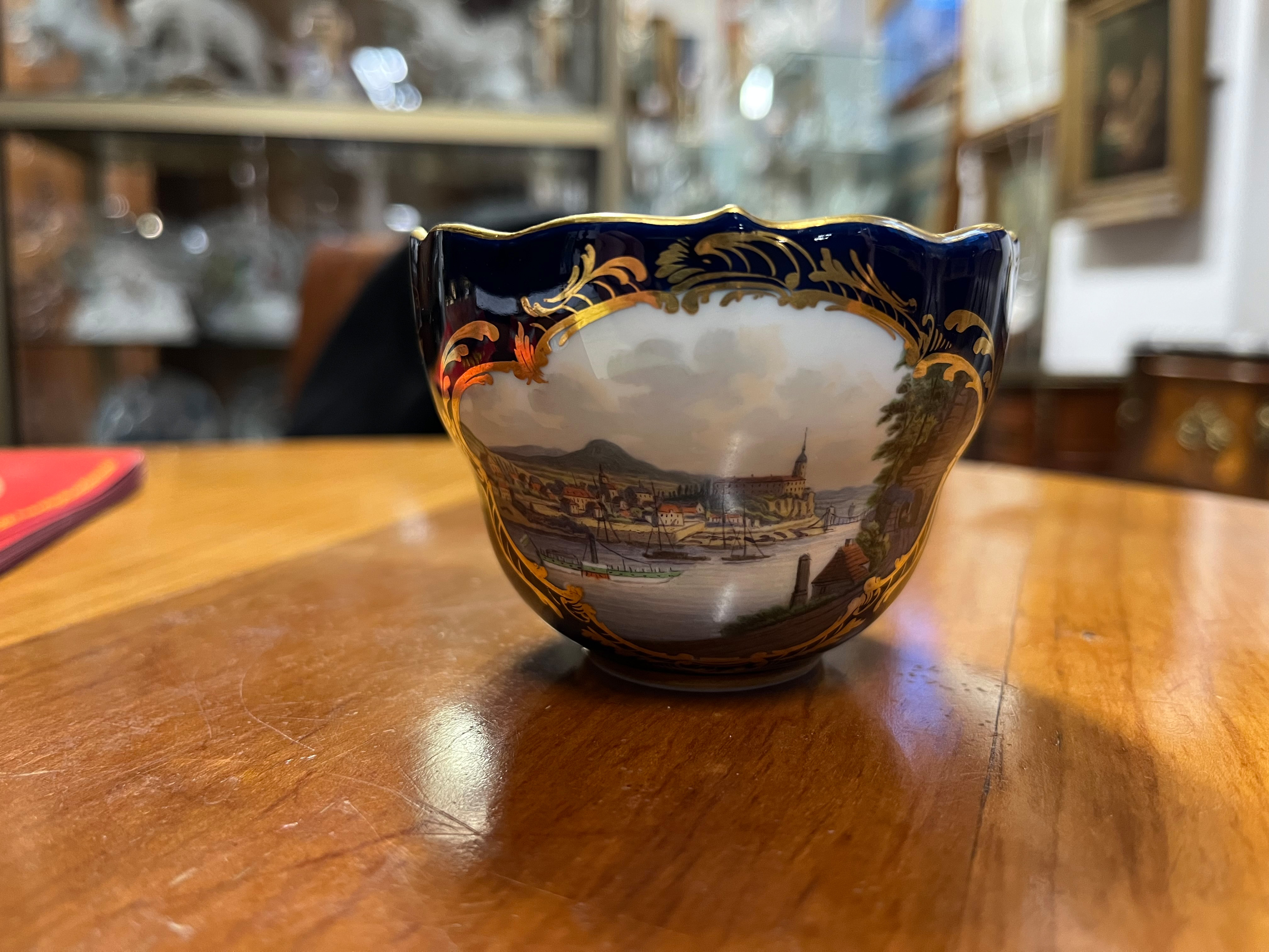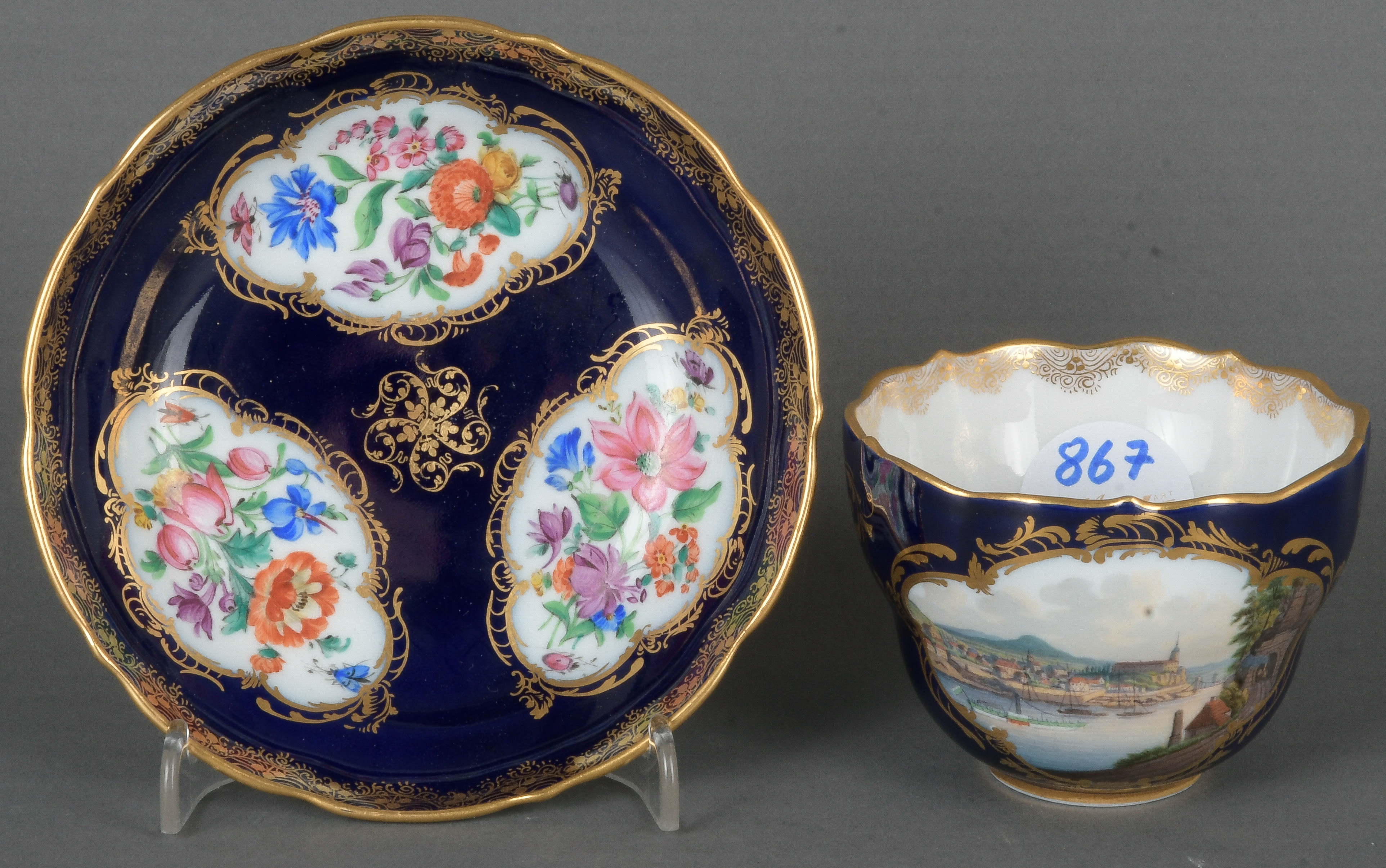 - Katalog-Nr: 867Schokoladentasse mit Unterschale. Meissen 19. Jh. Porzellan, mit kobaltblauem Fond, Goldspitzenbordüren und -kartuschen, bunt bemalt mit Blumenbouquet bzw. Stadtansicht „Tetschen“; am Boden unterglasurblaue Schwertermarke und betitelt.o.L.