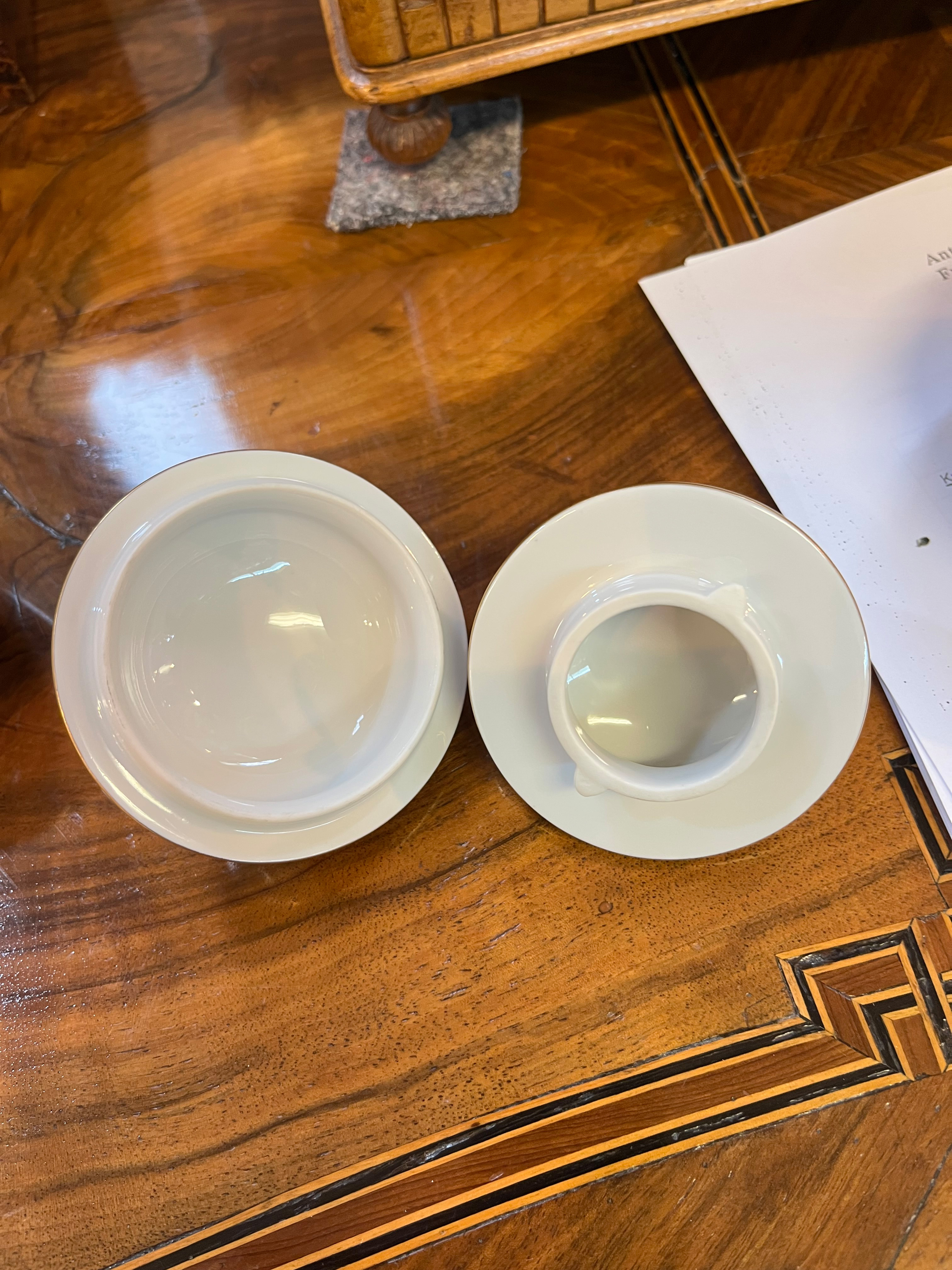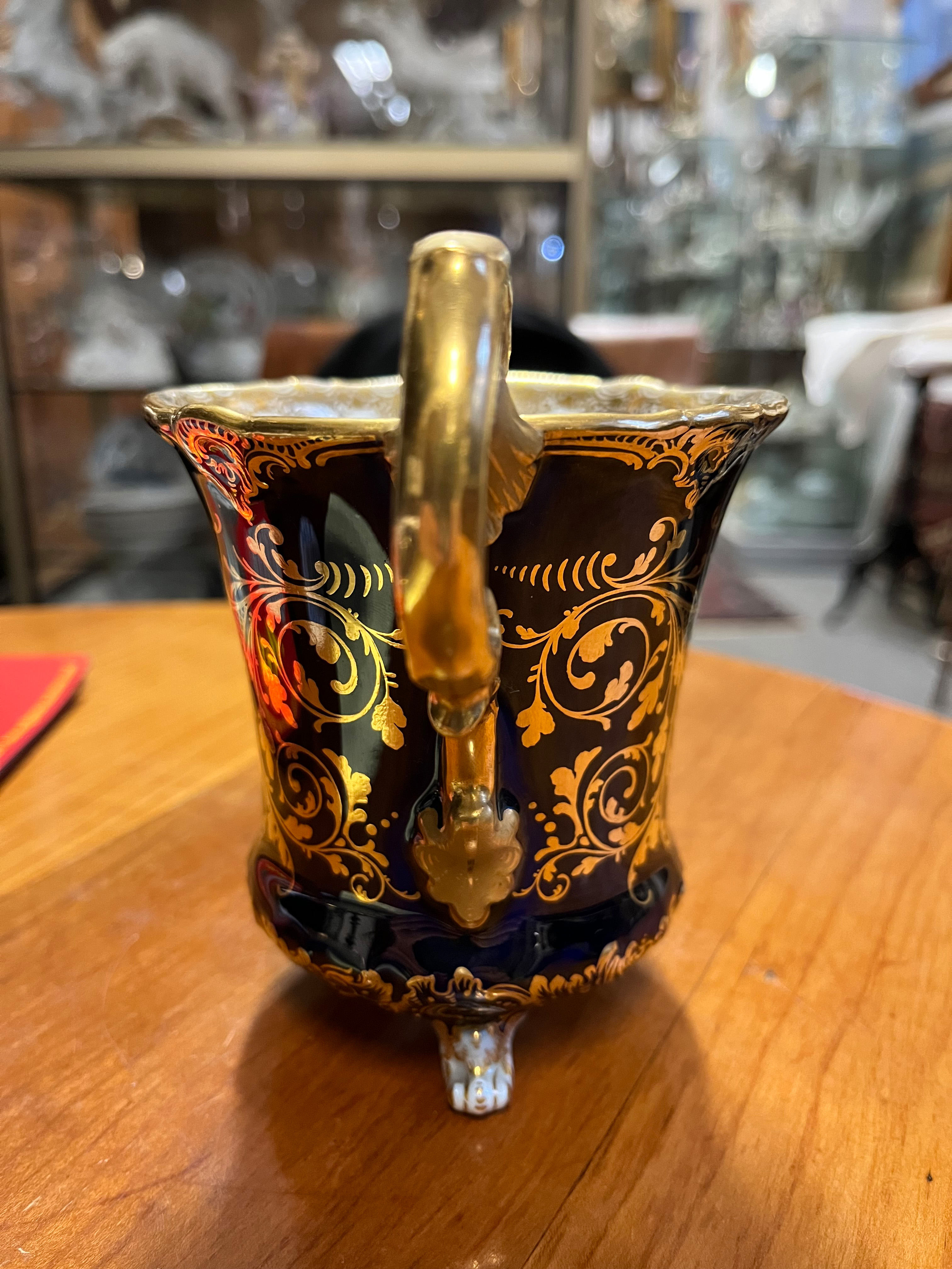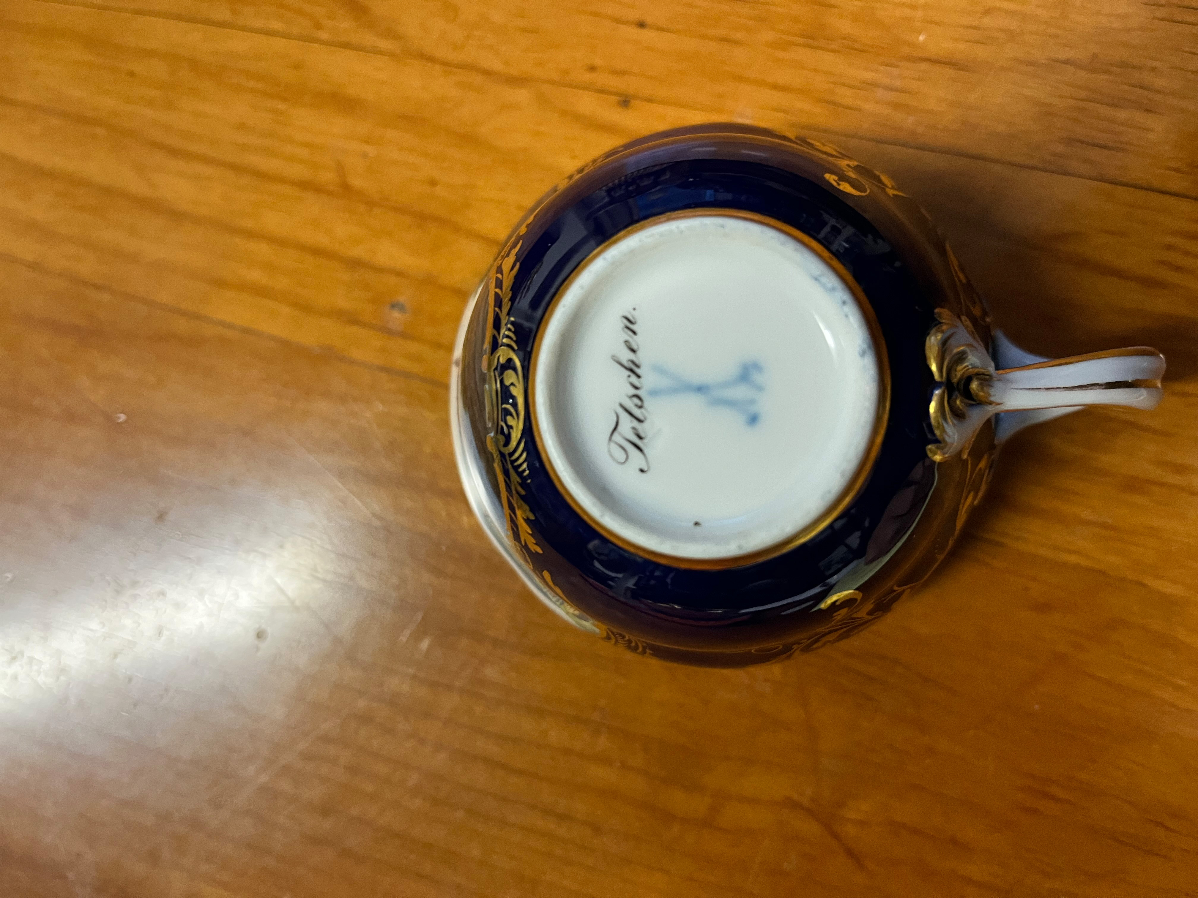 - Katalog-Nr: 867Schokoladentasse mit Unterschale. Meissen 19. Jh. Porzellan, mit kobaltblauem Fond, Goldspitzenbordüren und -kartuschen, bunt bemalt mit Blumenbouquet bzw. Stadtansicht „Tetschen“; am Boden unterglasurblaue Schwertermarke und betitelt.o.L.