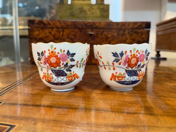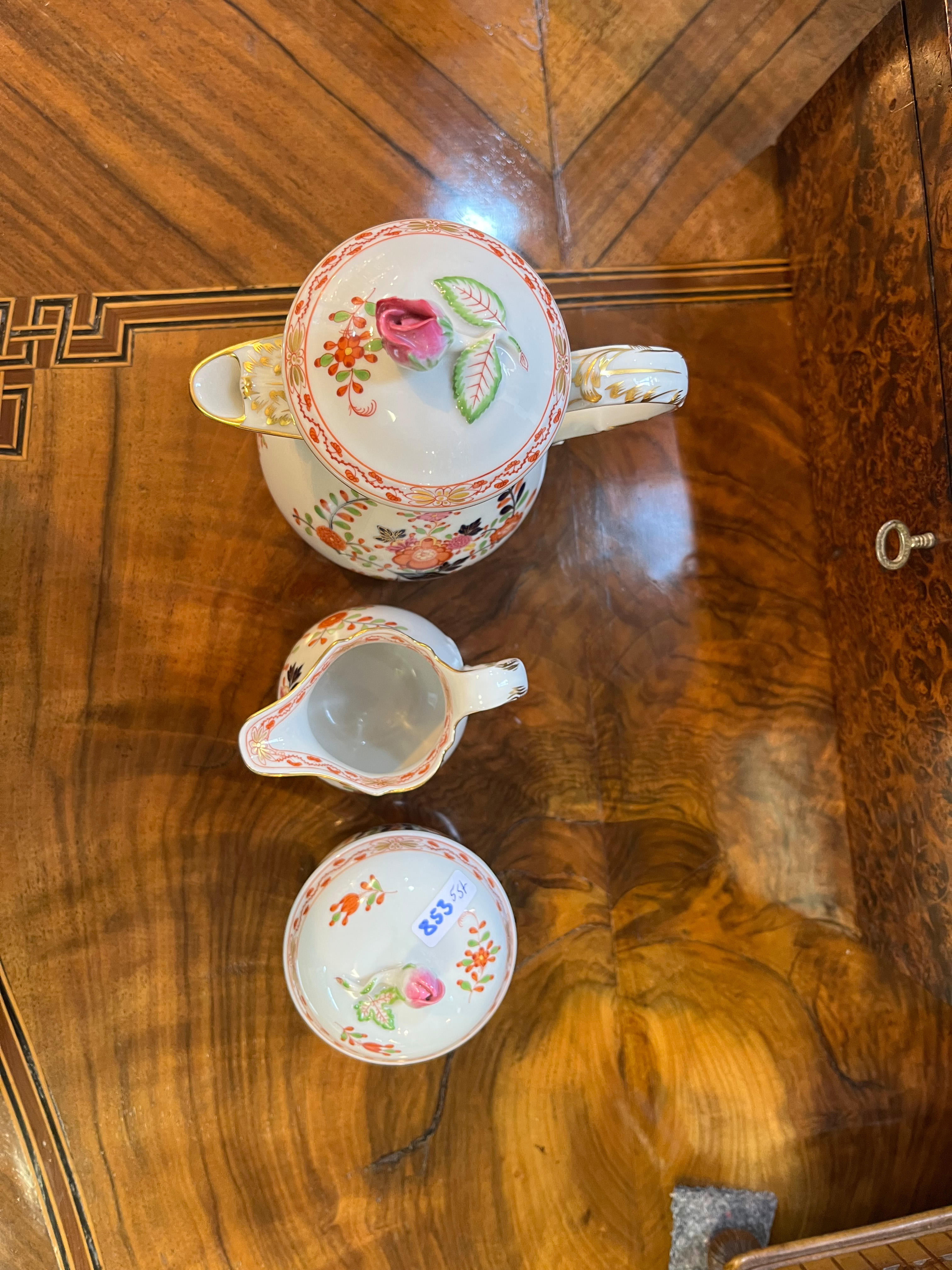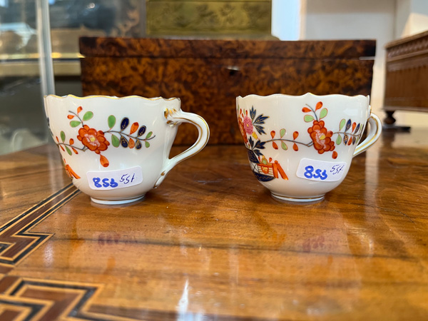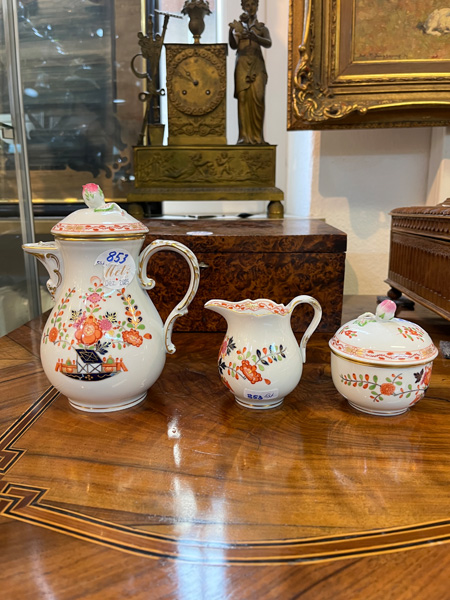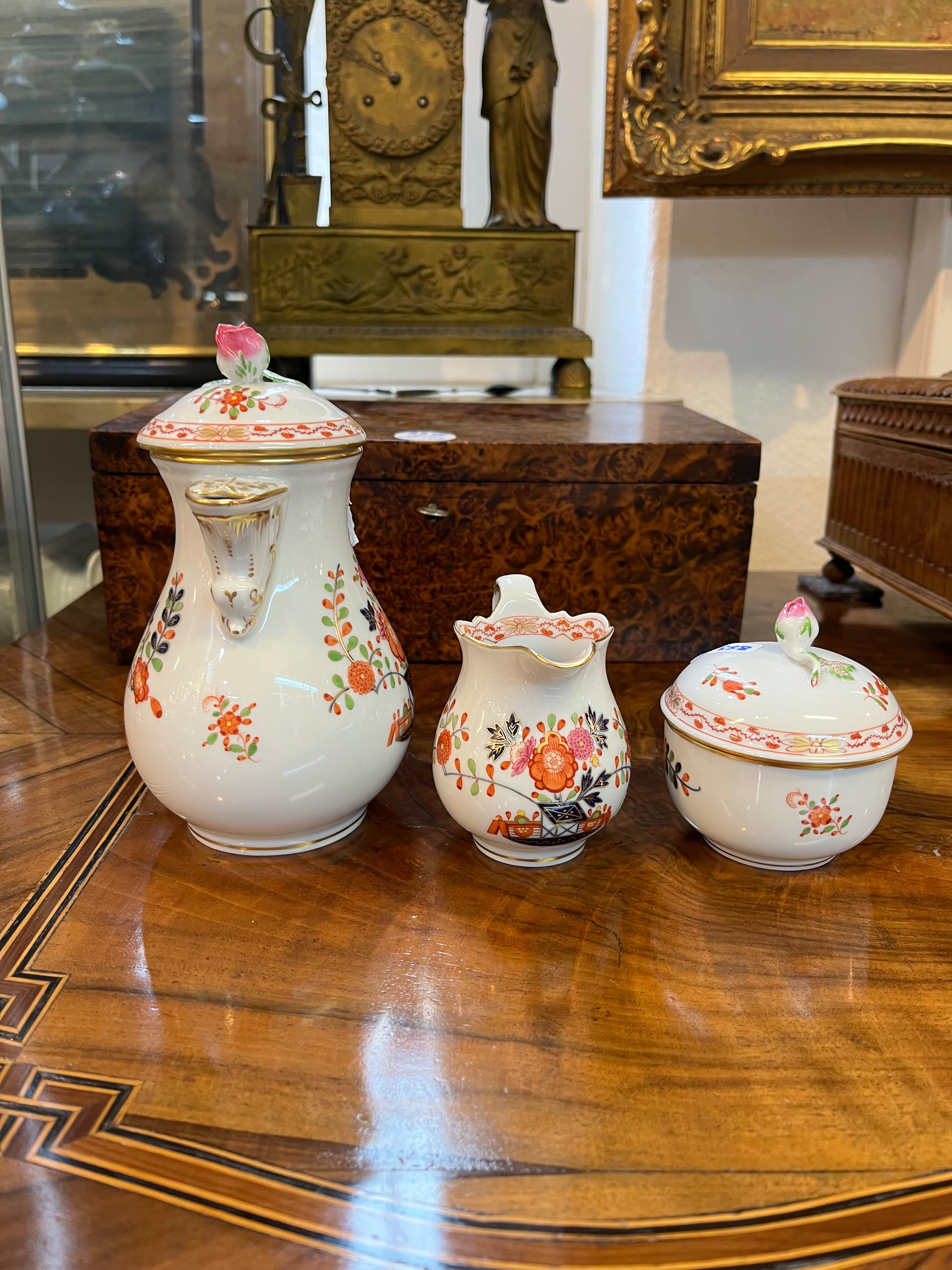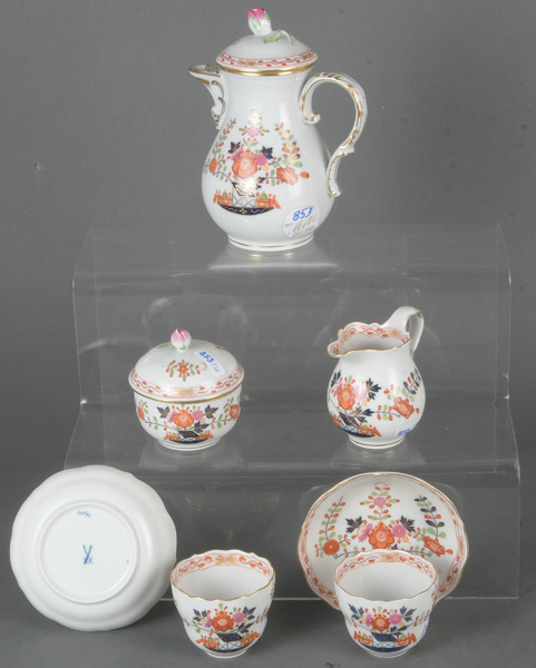 - Katalog-Nr: 853Déjeuner „Tischchenmuster“. Meissen 20. Jh. Porzellan, bunt bemalt und farbig überdekoriert; am Boden unterglasurblaue Schwertermarke. Bestehend aus: Eine Kanne (H=18 cm), ein Milchgießer (H=8 cm), eine Zuckerdose (H=8 cm) und ein Paar Tassen mit Unterschalen. (nadelkopfgroß best.)o.L.