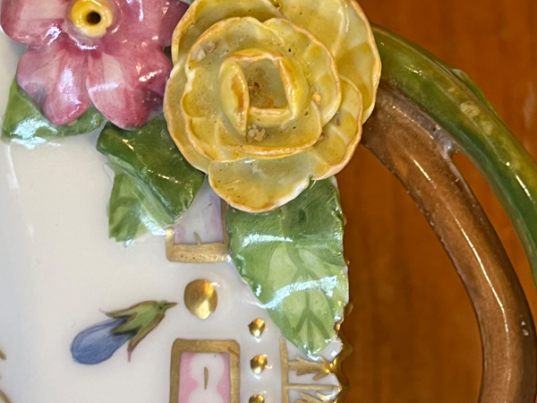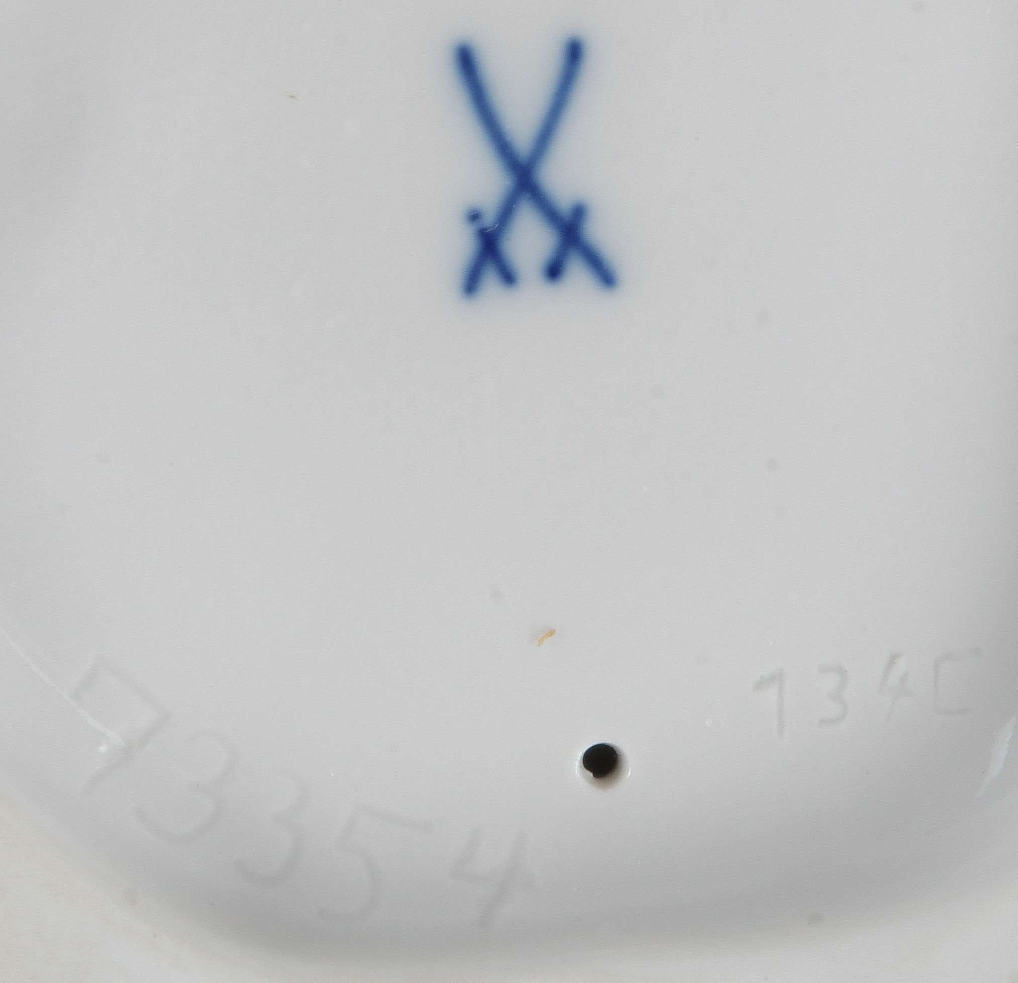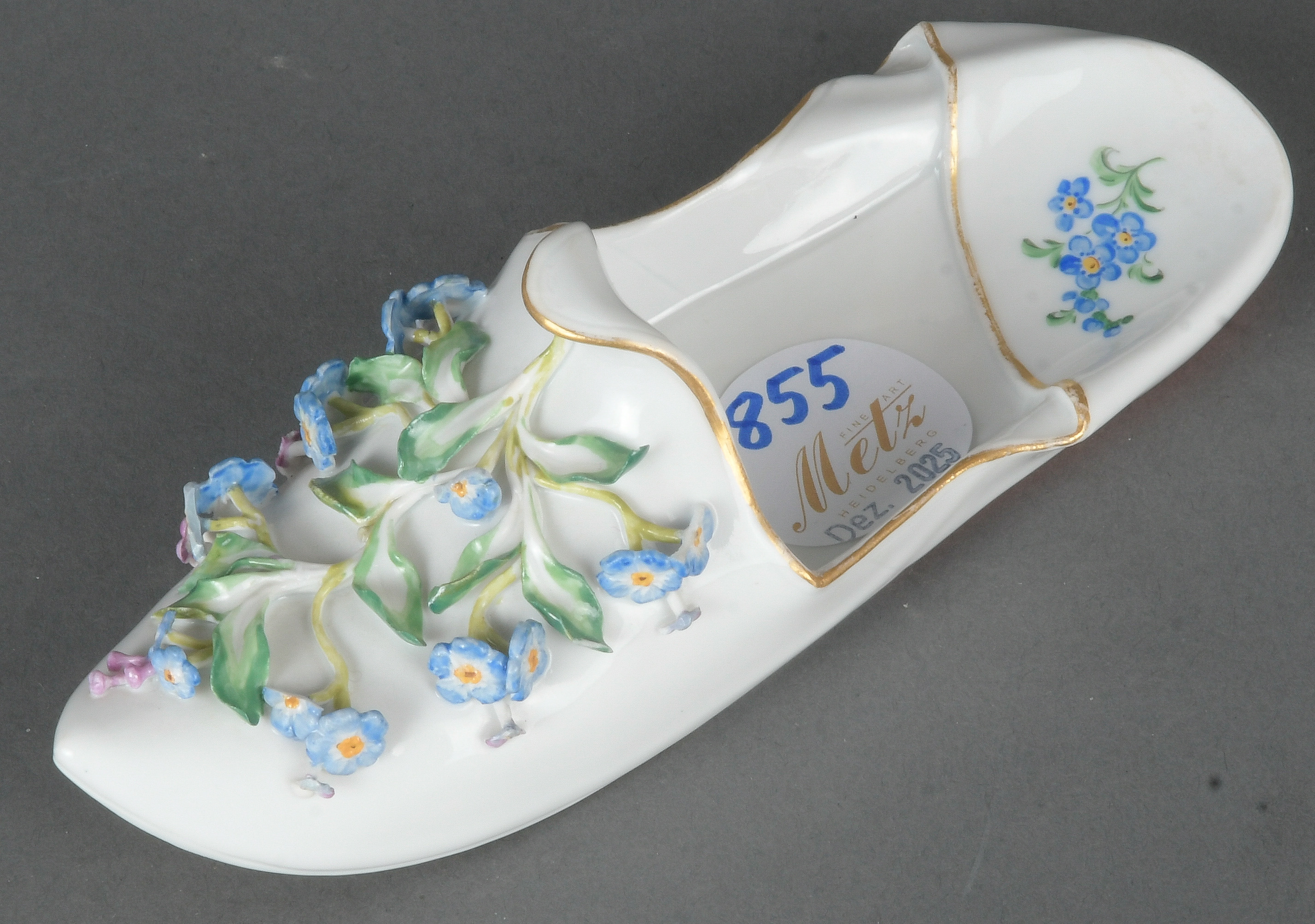 - Katalog-Nr: 855Pantoffel. Meissen 19. Jh. Porzellan, mit aufbossierten Blüten und bunt bemalt; am Boden unterglasurblaue Schwertermarke, H=5,2 cm, B=17 cm, T=5,2 cm. (nadelkopfgroß best.)o.L.