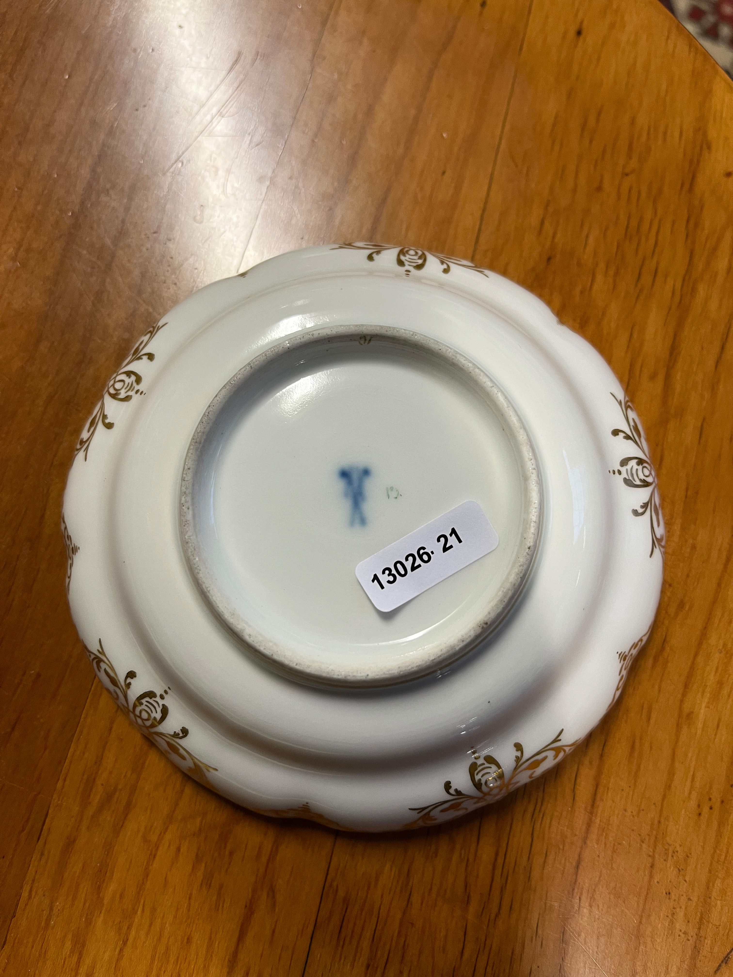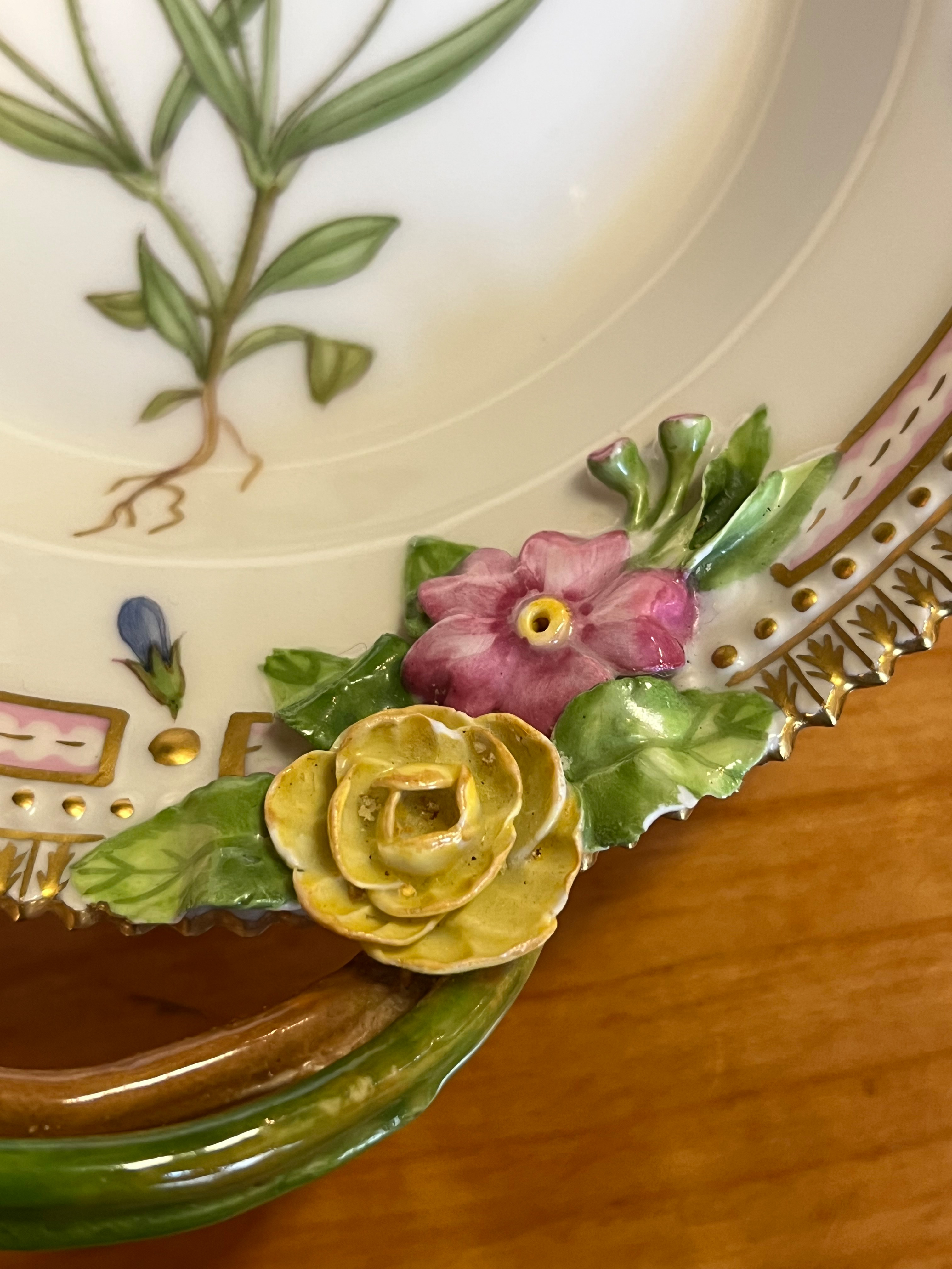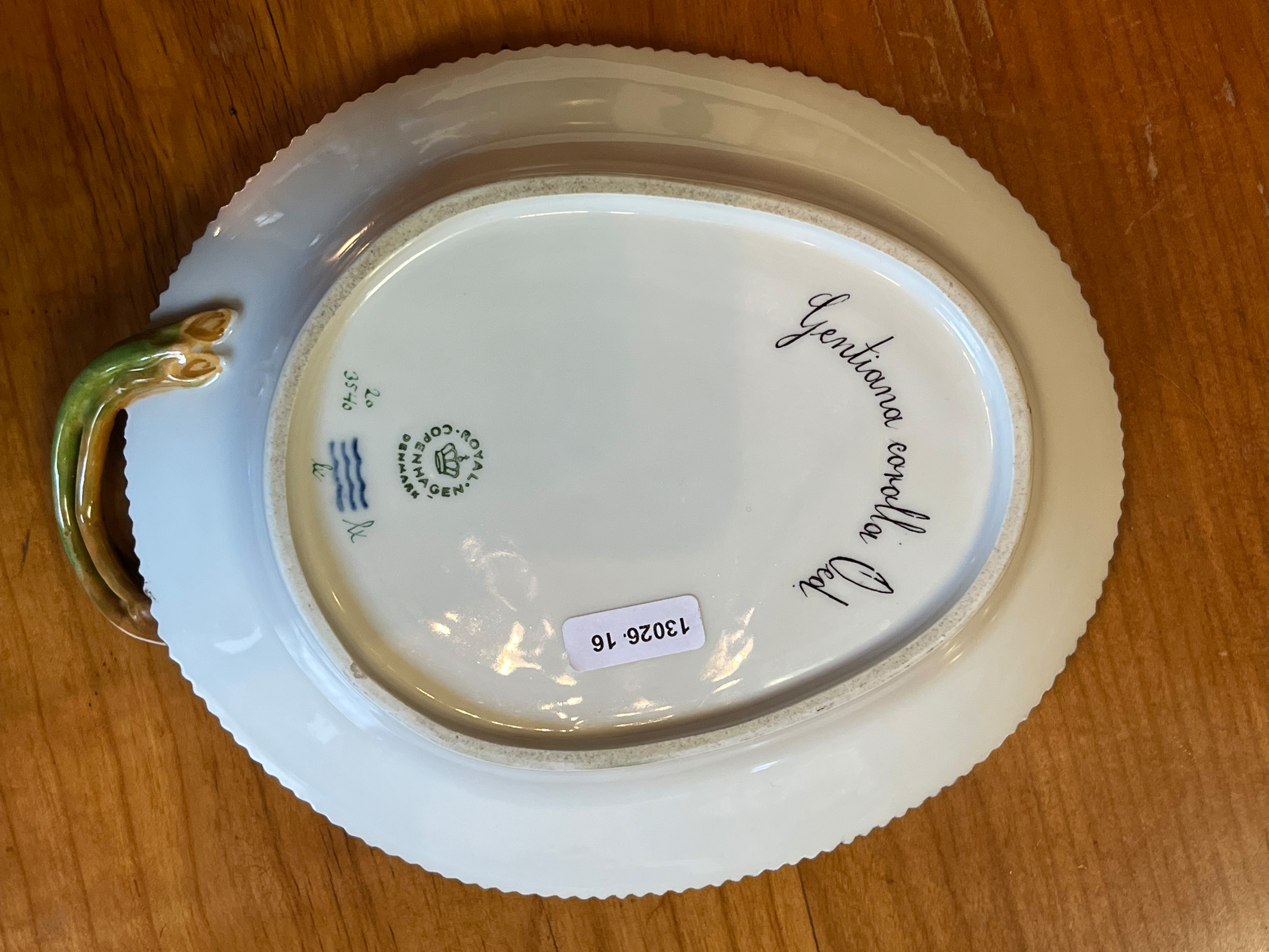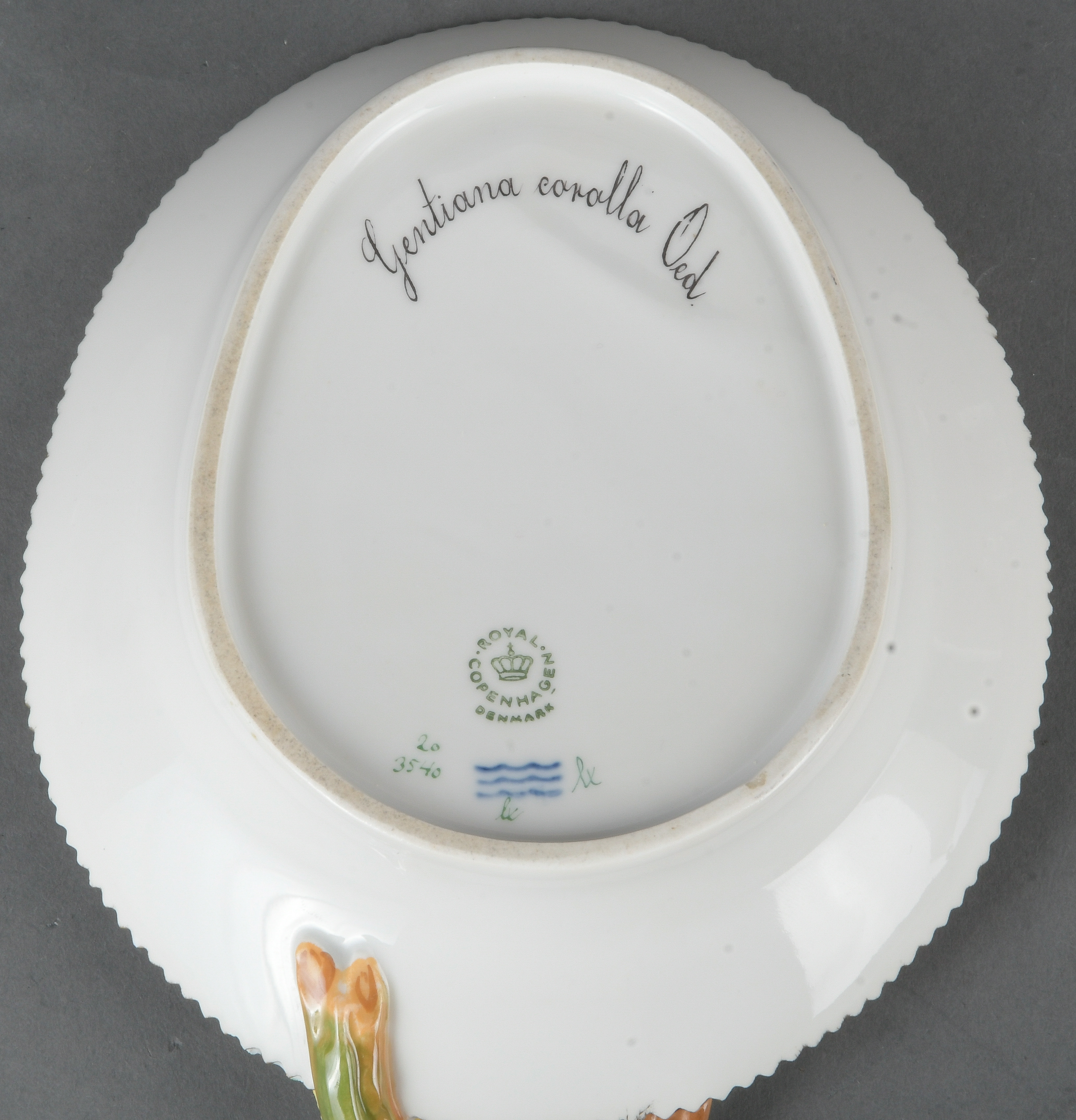- Katalog-Nr: 862Ovale Schale „Flora Danica“. Royal Copenhagen 20. Jh. Porzellan, mit gold gesäumtem Zackenrand und bunt bemalt mit „Gentiana corolla Oed.“; verso betitelt und gemarkt, H=6,4 cm, B=17 cm,T=22 cm. (nadelkopfgroß best.)o.L.