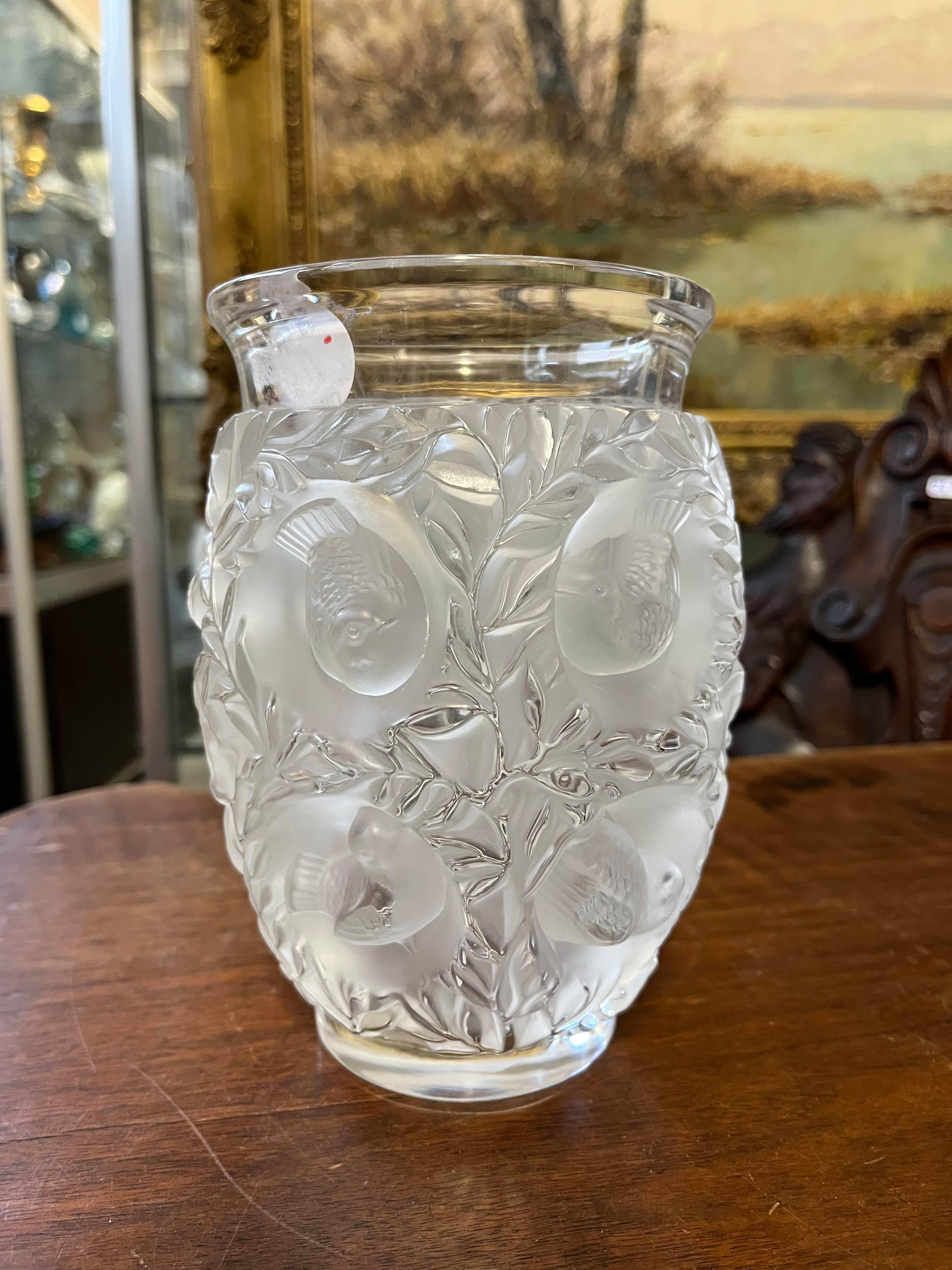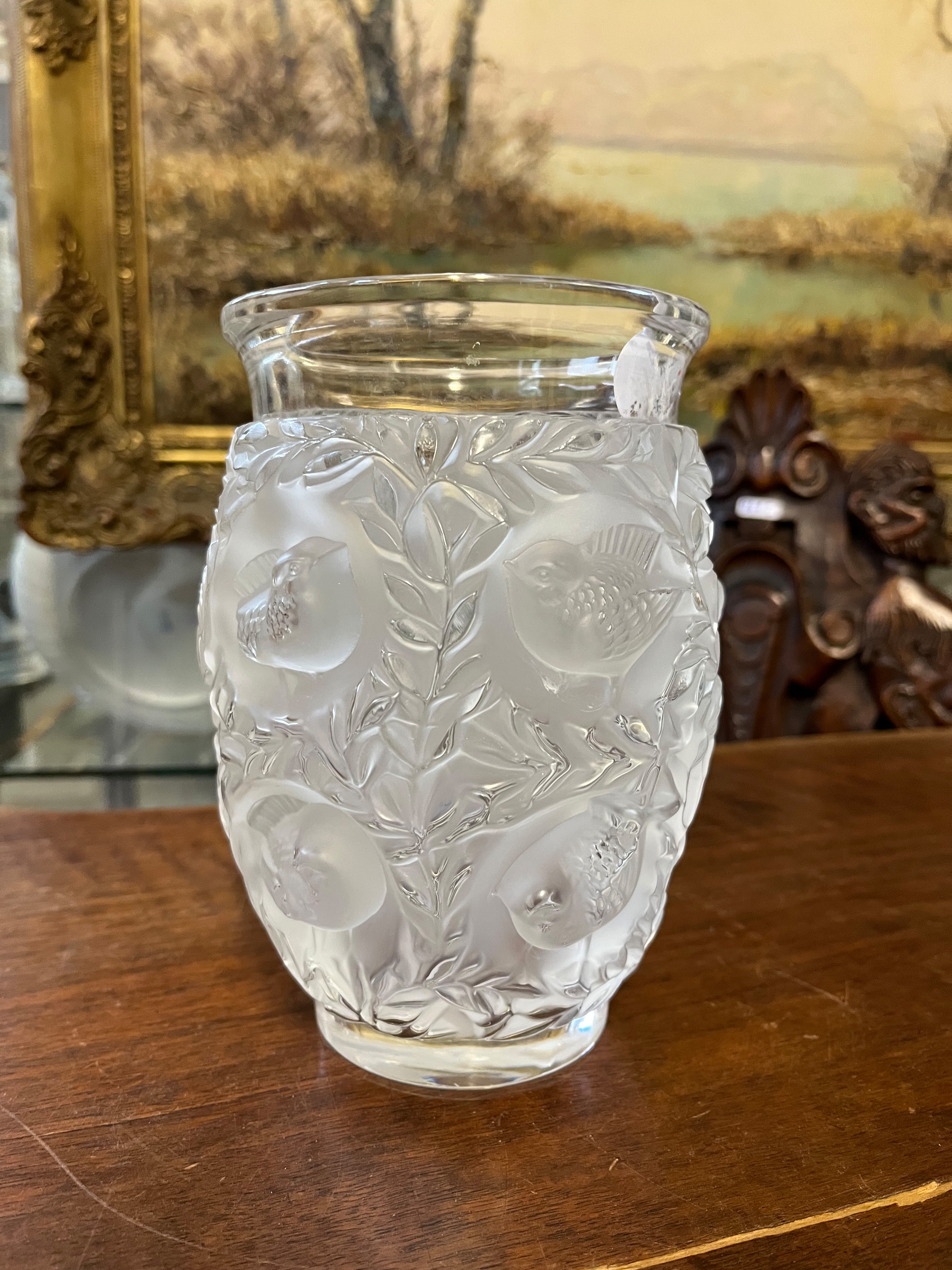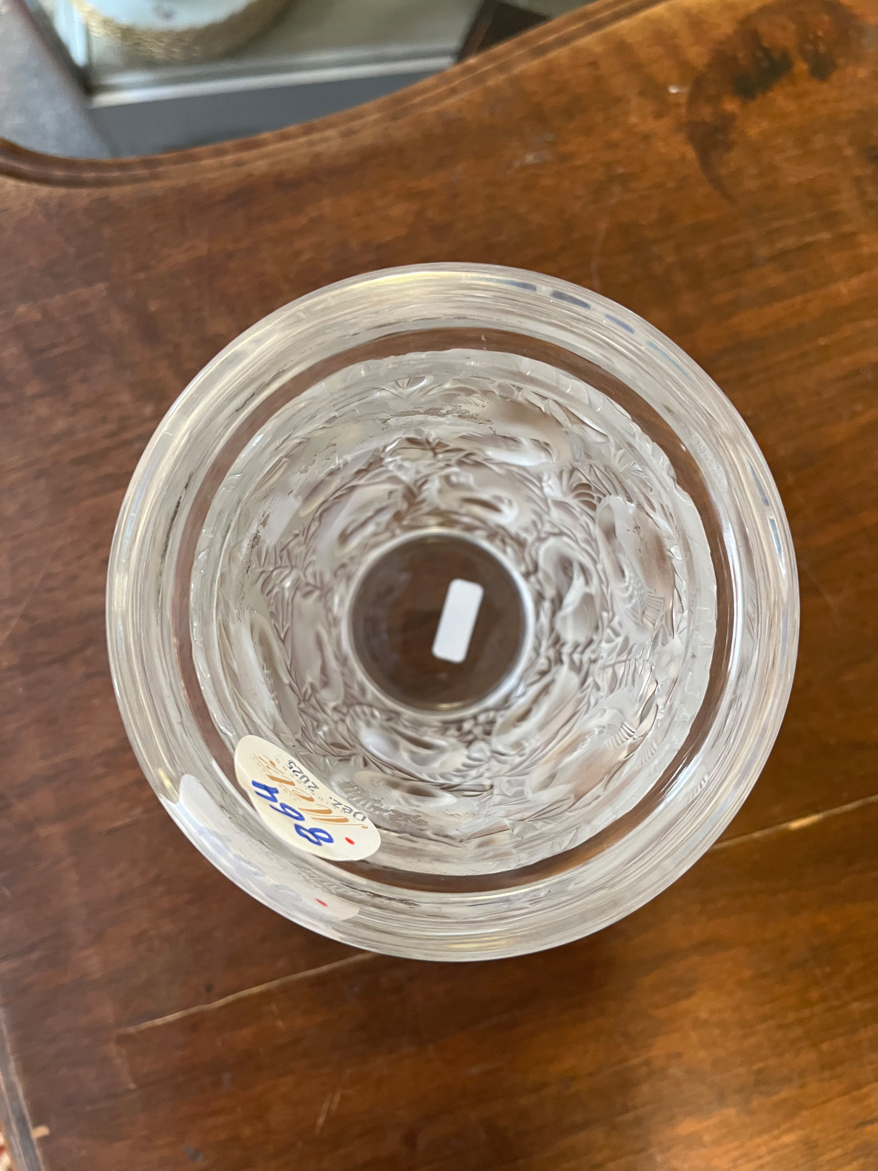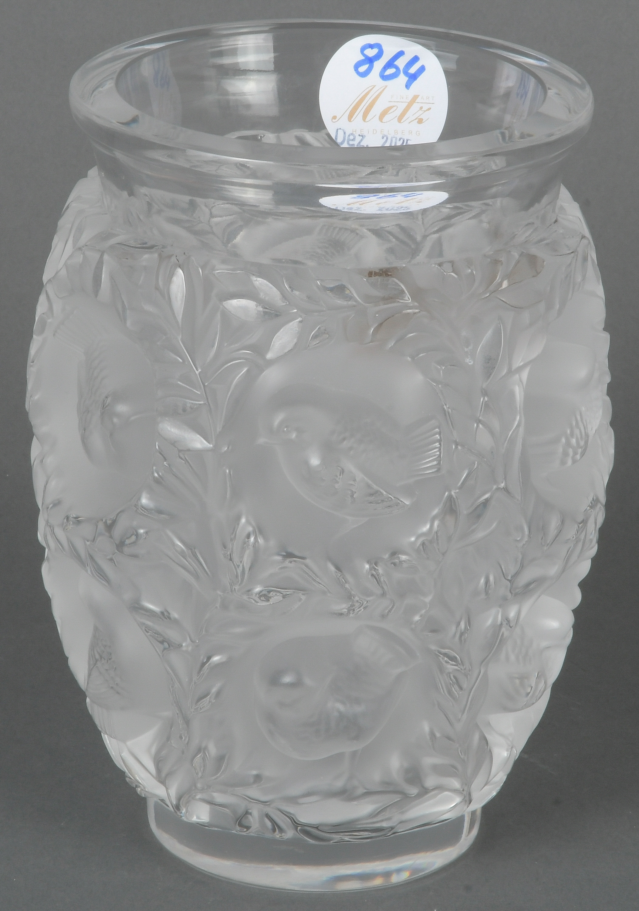 - Katalog-Nr: 864Vase. Paris, René Lalique 20. Jh. Farbloses opakes Glas, die Wandung umlaufend reliefiert mit Floraldekor; am Boden sign., H=16 cm.o.L.