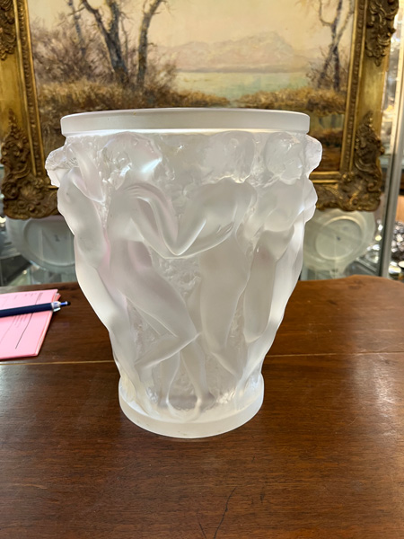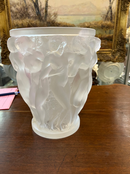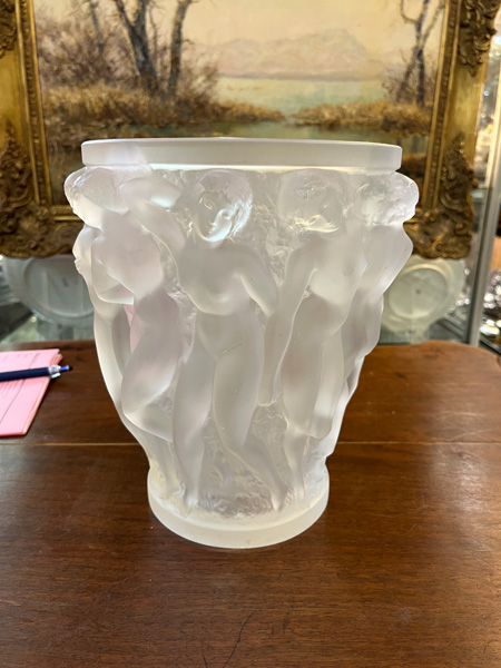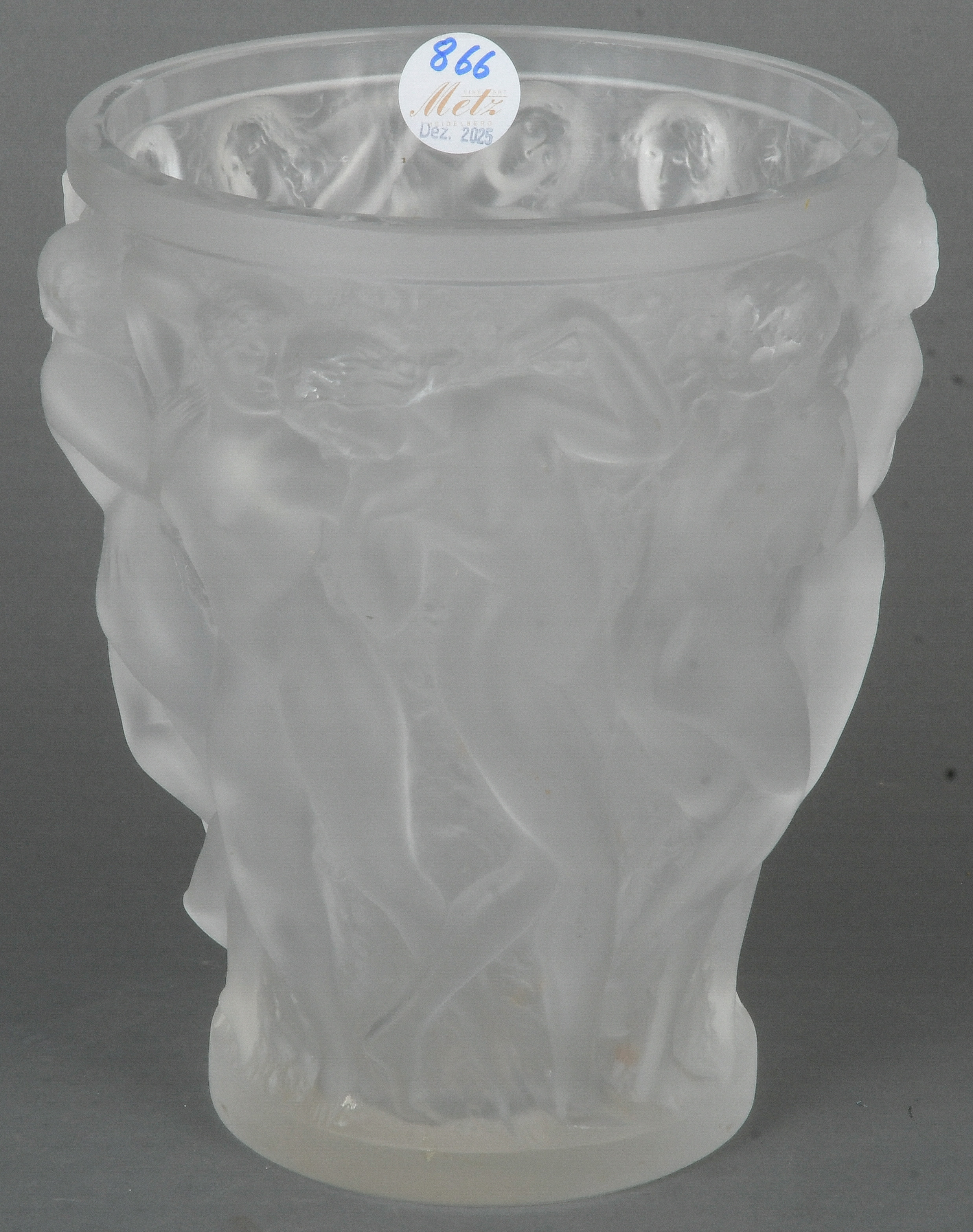 - Katalog-Nr: 866Hohe Vase. Paris, René Lalique 20. Jh. Farbloses opakes Glas, die Wandung umlaufend reliefiert mit Frauenakten; am Boden sign., H=24,5 cm.o.L.