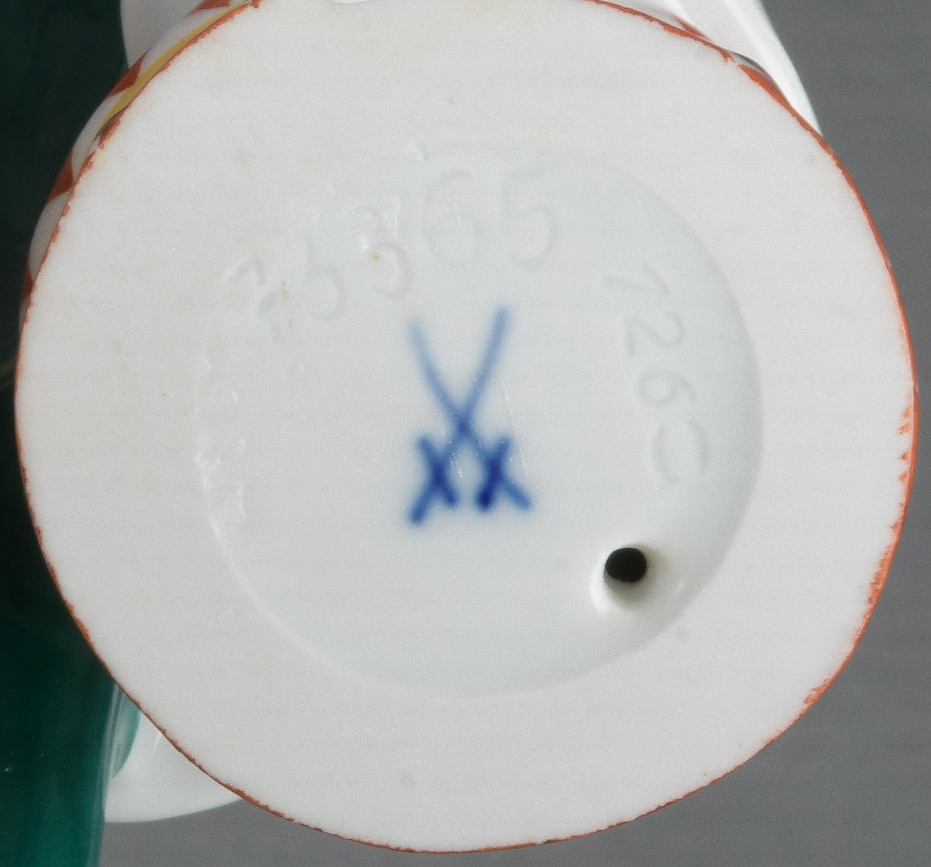- Katalog-Nr: 856Papagei. Meissen Pfeifferzeit 1924-34. Porzellan, naturalistisch modelliert und staffiert; am Boden unterglasurblaue Schwertermarke, Modell nach Johann Joachim Kaendler, H=19,2 cm. (best.)o.L.