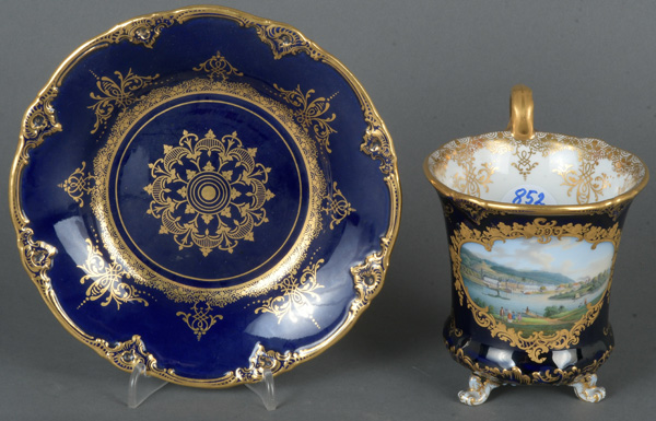 - Katalog-Nr: 852Prunkansichtstasse mit Unterschale. Meissen 19. Jh. Porzellan, mit kobaltblauem Fond, reich gold gehöht; Schauseite der Tasse bunt bemalt und betitelt „Pillnitz“.o.L.