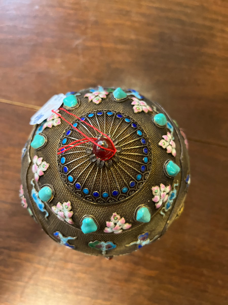 - Katalog-Nr: 861Runde Deckeldose. Asien. Silber, ca. 476 g, vergoldet, reich farbig mit aufgelegten Emailblüten und Insekten, H=16,5 cm.o.L.