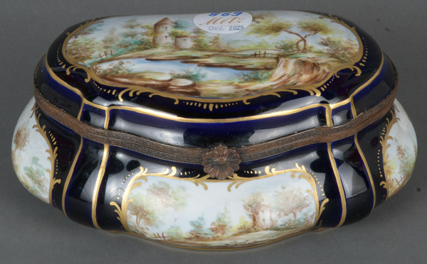 - Katalog-Nr: 869Große, ovale Deckeldose. Frankreich 19. Jh. Porzellan, mit kobaltblauem Fond, gold gesäumt, und bunt bemalt mit Landschaft, H=8 cm, B=21 cm, T=13,5 cmo.L.