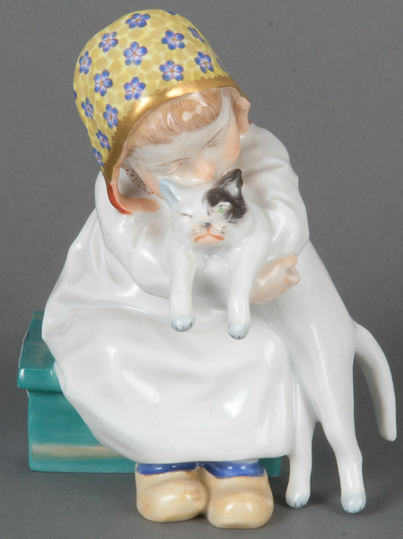 - Katalog-Nr: 875Mädchen mit Katze. Meissen 20. Jh. Porzellan, bunt bemalt; am Boden unterglasurblaue Schwertermarke, Modell nach Konrad Hentschel, H=12,5 cm.o.L.