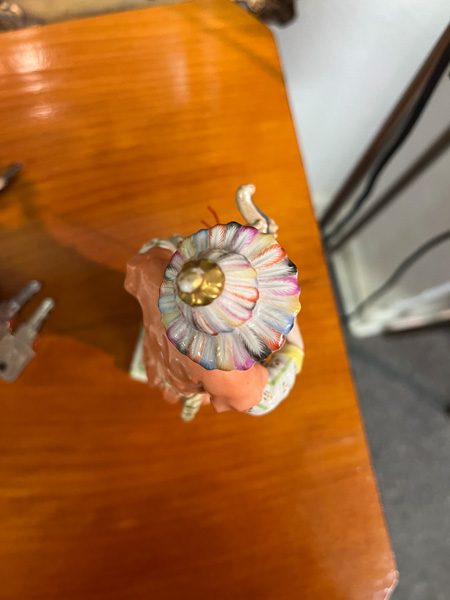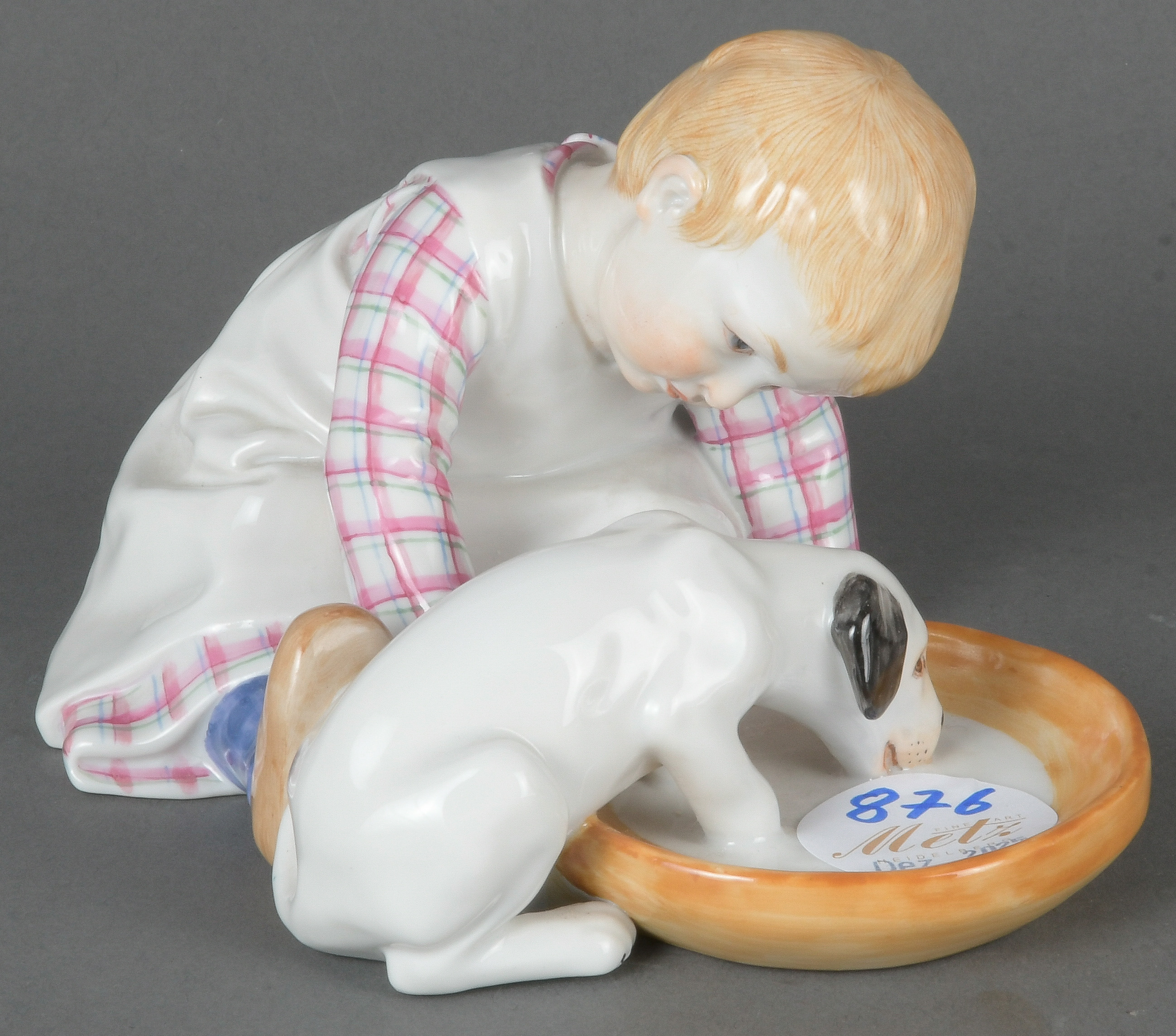 - Katalog-Nr: 876Mädchen mit Milch trinkendem Hund. Meissen 20. Jh. Porzellan, bunt bemalt; am Boden unterglasurblaue Schwertermarke, Modell nach Konrad Hentschel, H=12,2 cm.o.L.