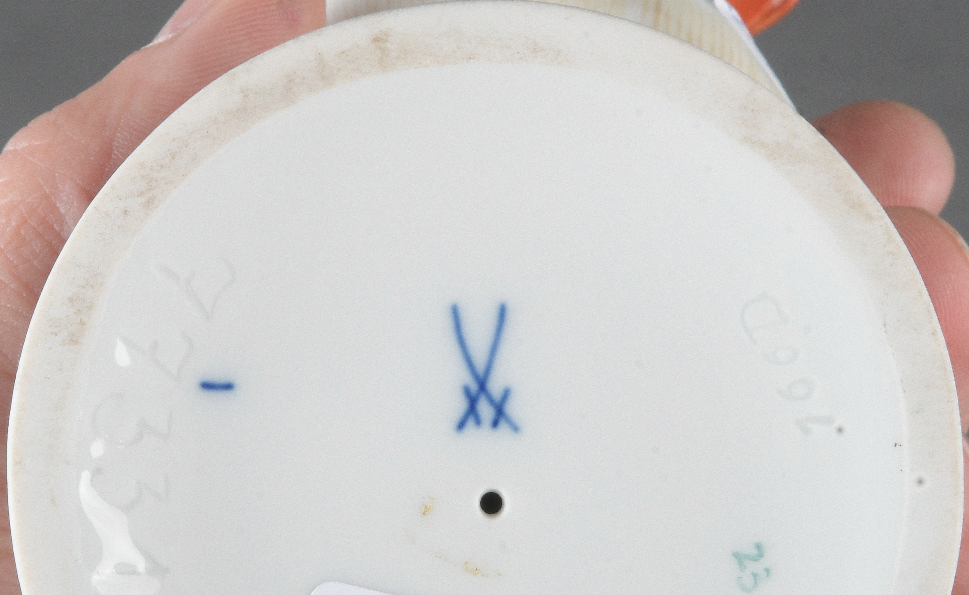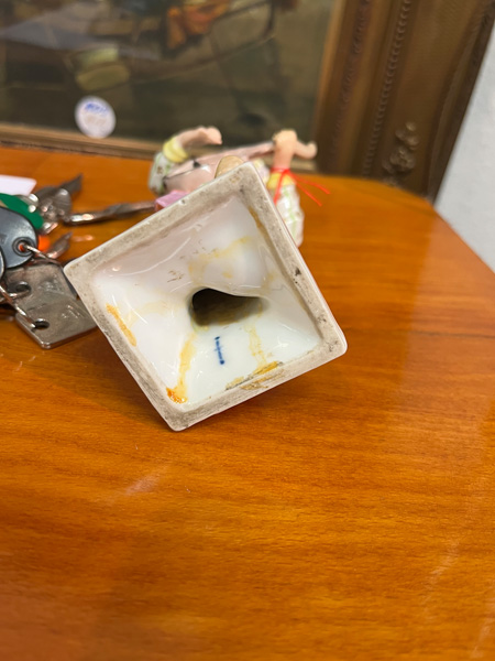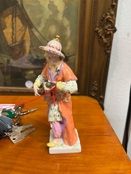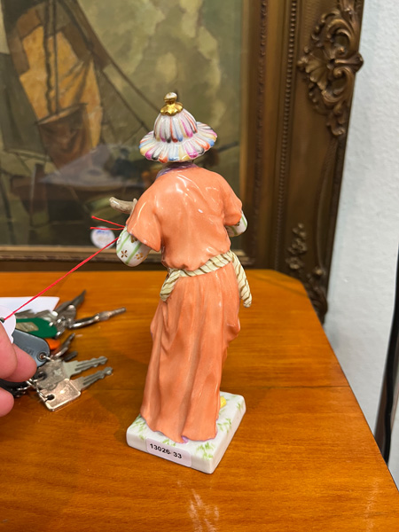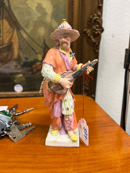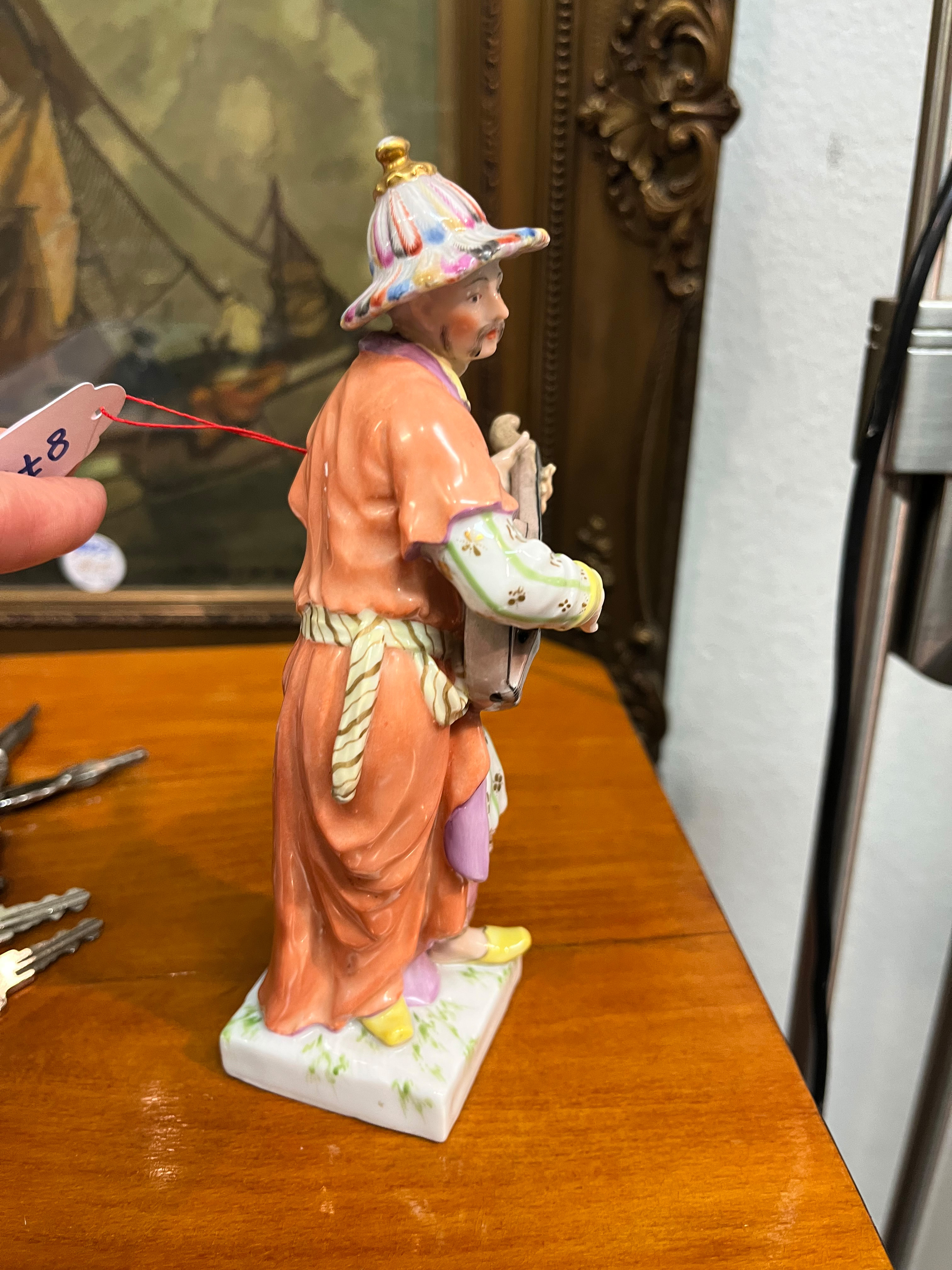 - Katalog-Nr: 879Stehender Chinese beim Gitarrespielen. Berlin 19. Jh. Porzellan, bunt bemalt, am Boden unterglasurblaue Szeptermarke, H=18 cm. (rest.)o.L.