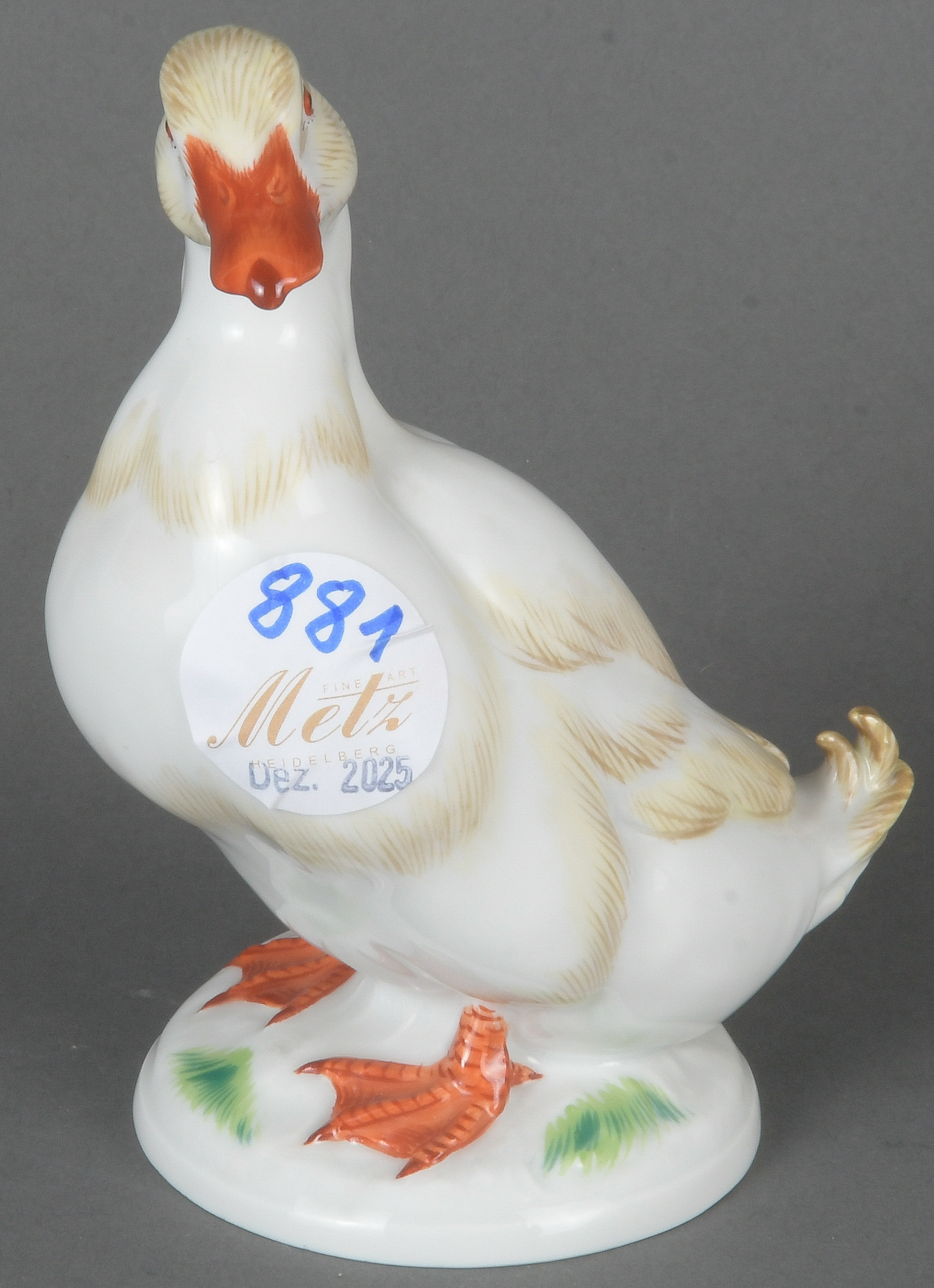 - Katalog-Nr: 881Gans. Meissen 20. Jh. Porzellan, naturalistisch modelliert und staffiert; am Boden unterglasurblaue Schwertermarke, Entwurf nach Erich Oehme, H=14 cm.o.L.