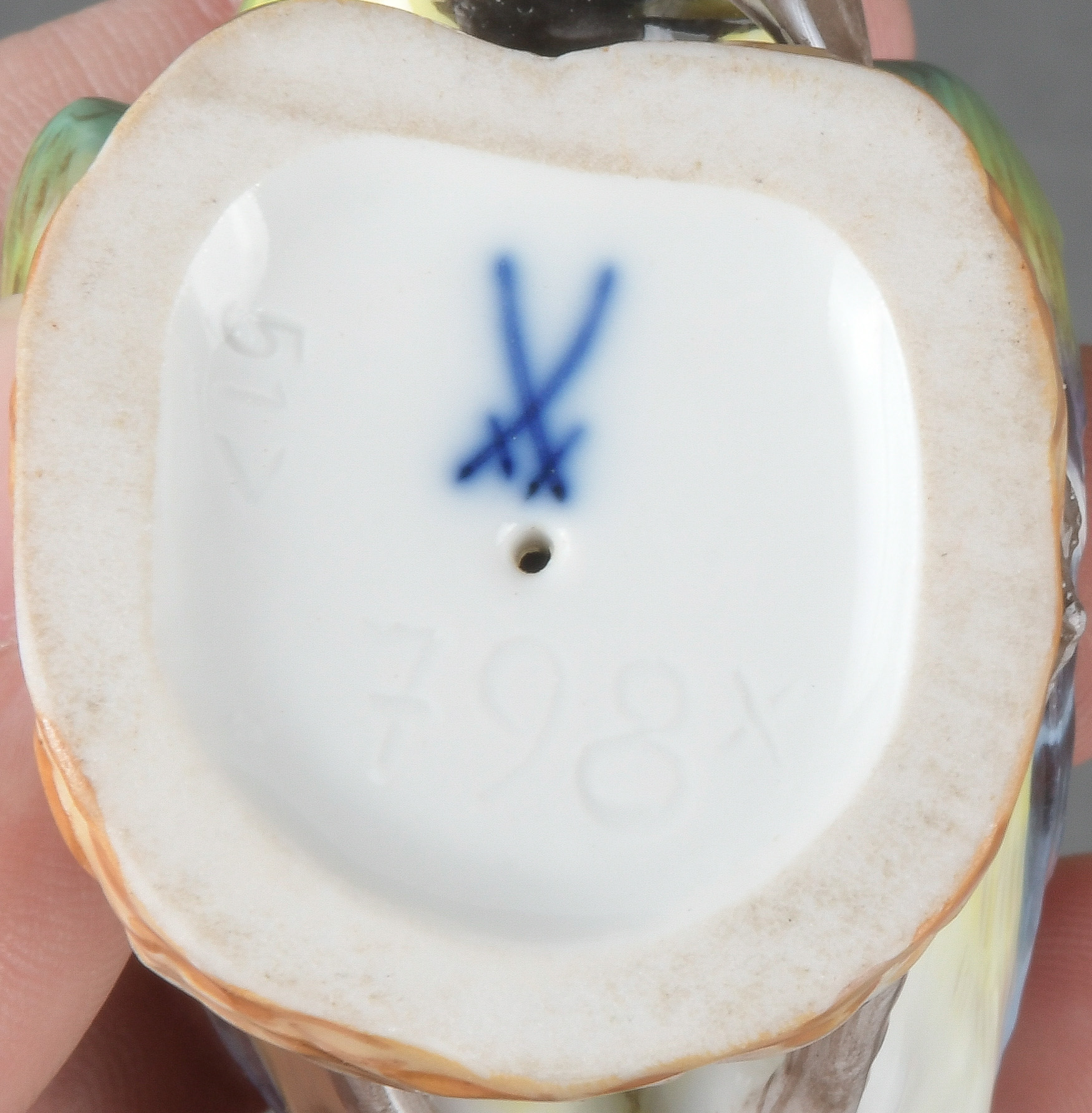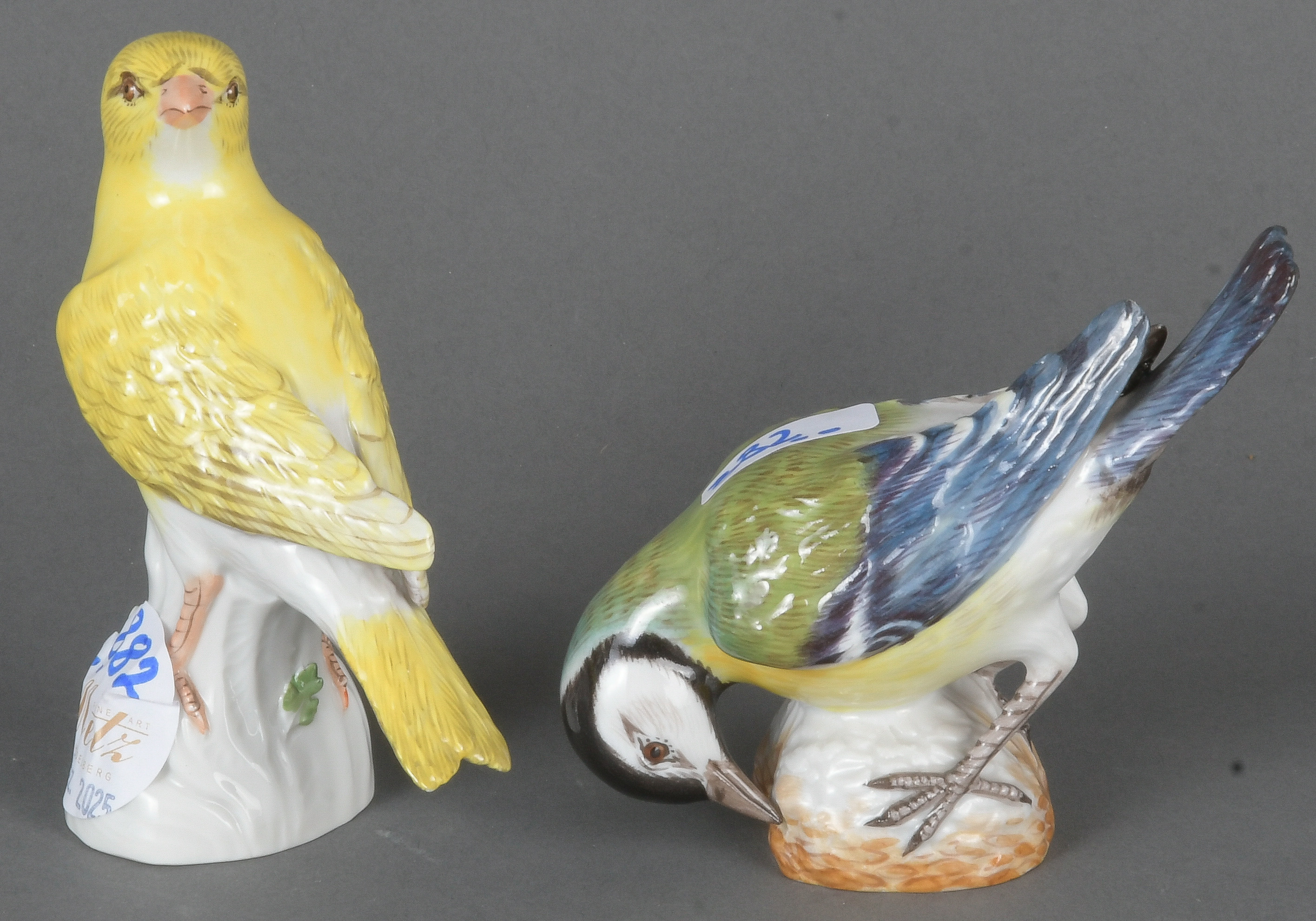 - Katalog-Nr: 882Kohlmeise und Kanarienvogel. Meissen 20. Jh. Porzellan, naturalistisch modelliert und staffiert; am Boden unterglasurblaue Schwertermarke, Modell nach Johann Joachim Kaendler, H=8,9 / 10,2 cm.o.L.