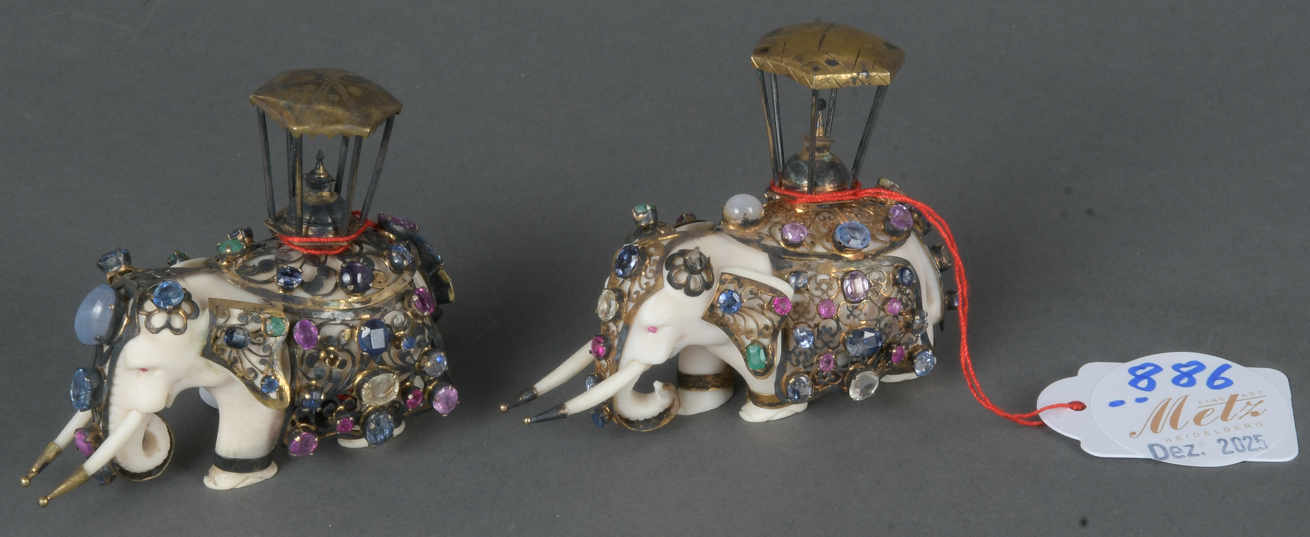 - Katalog-Nr: 886Paar Schmuckstein-Elefanten. Wohl Klaus Dupont. Geschnitztes Horn, reich appliziert mit vergoldetem Silber und aufwendig besetzt mit diversen Edelsteinen, H=je 5,8 cm.o.L.